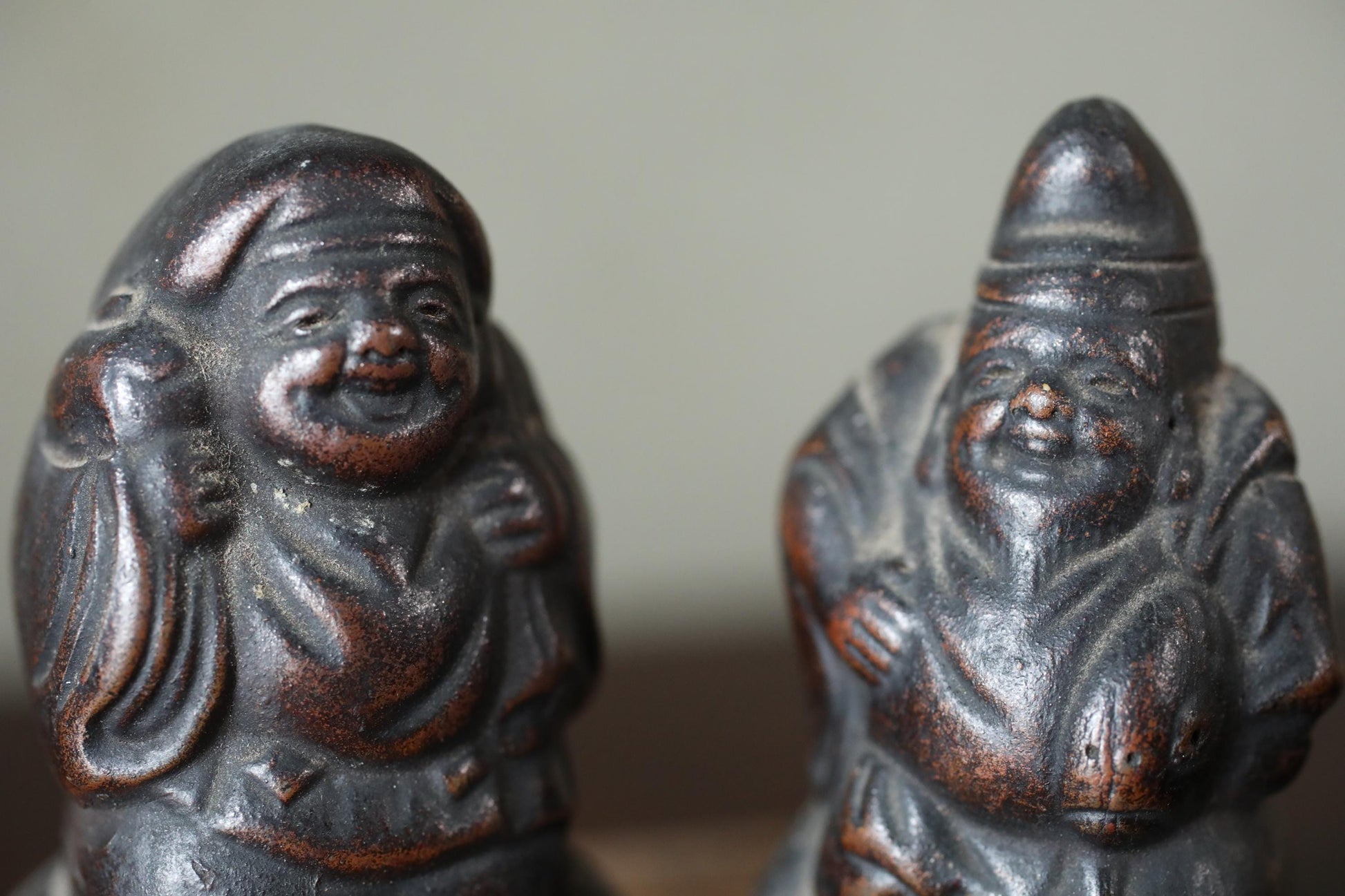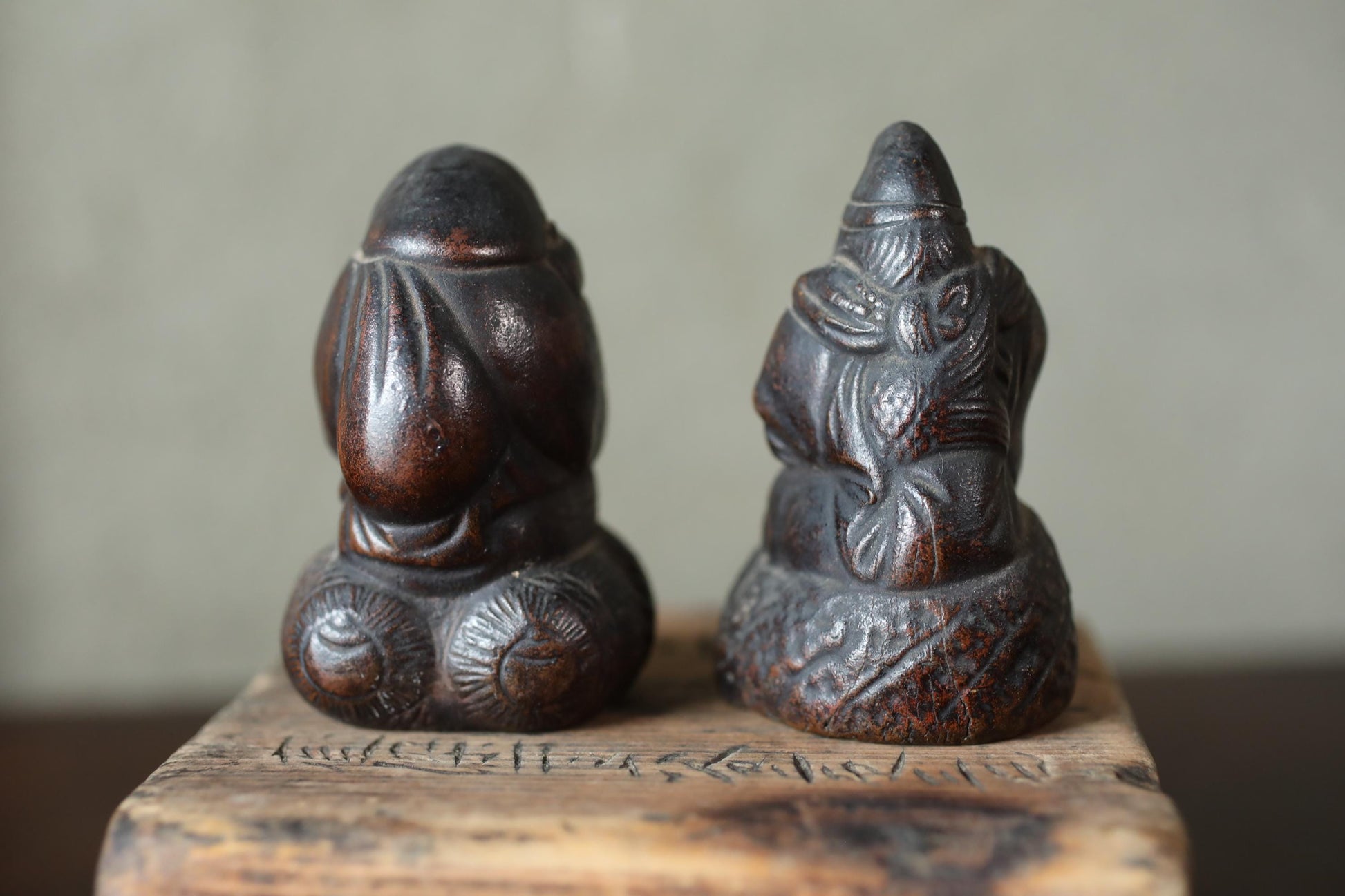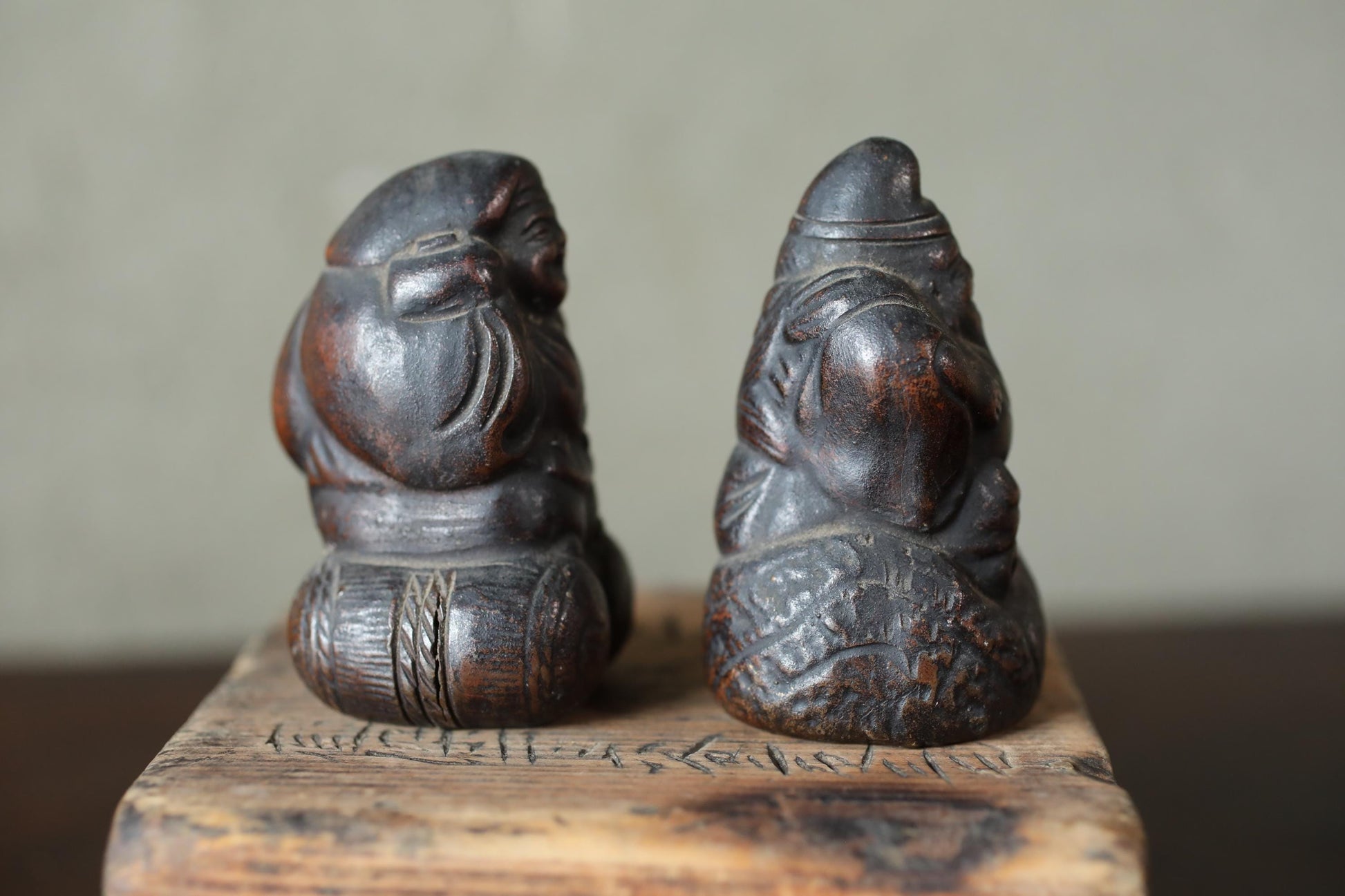 These are made of 備前 Bizen ware, which is pottery that uses no glaze and makes use of the natural texture of the clay. They are a very dark brown color, and over the course of 100 years, they have developed a beautiful depth and luster. These are probably small in size, so they were probably carried around as talismans during travel or peddling.