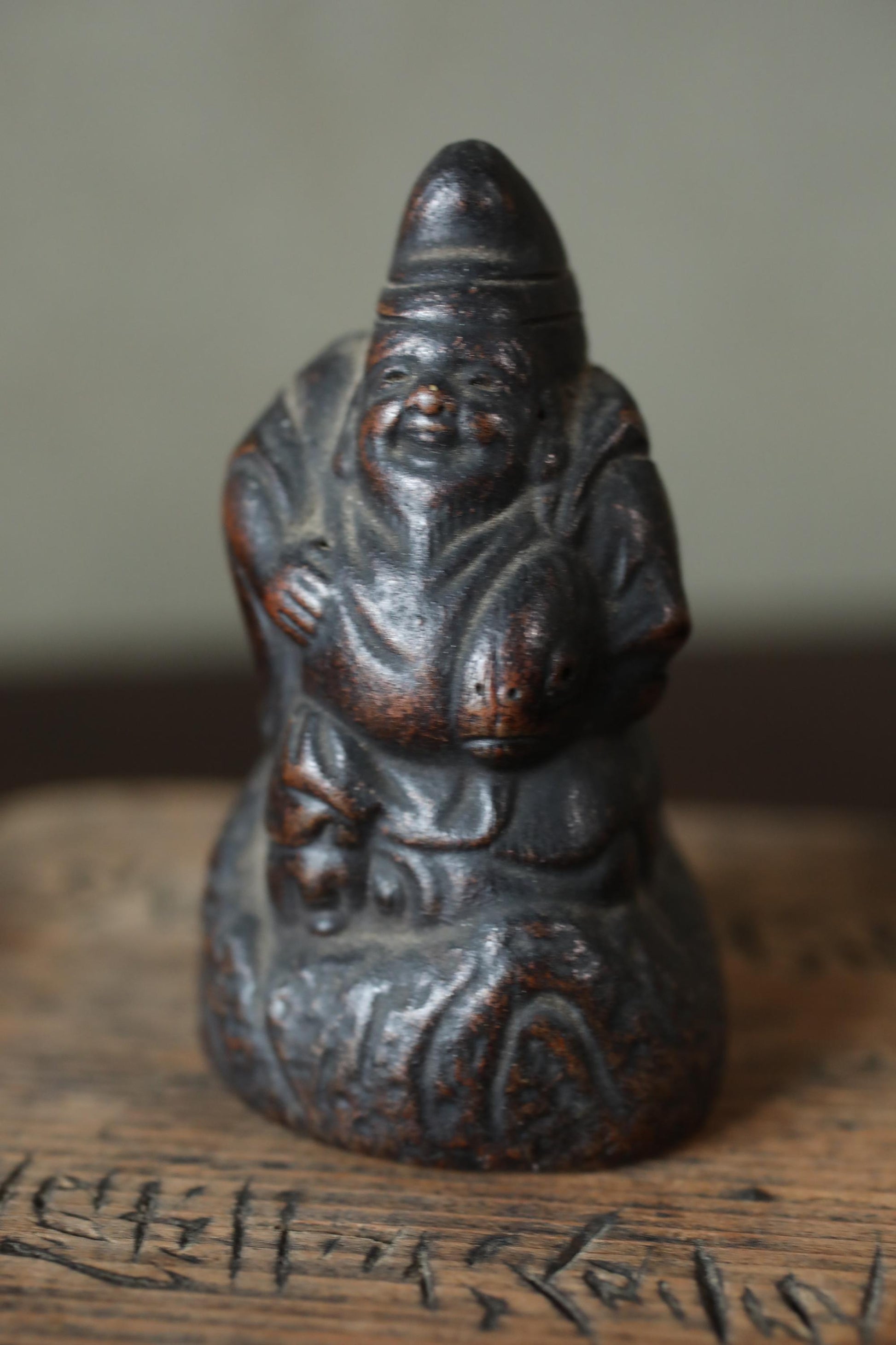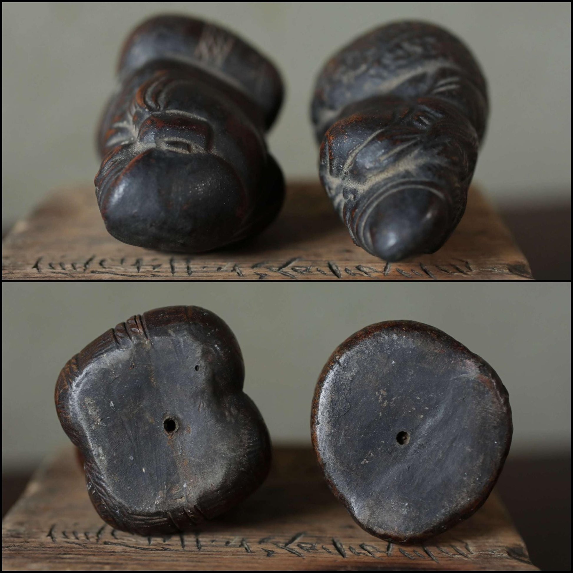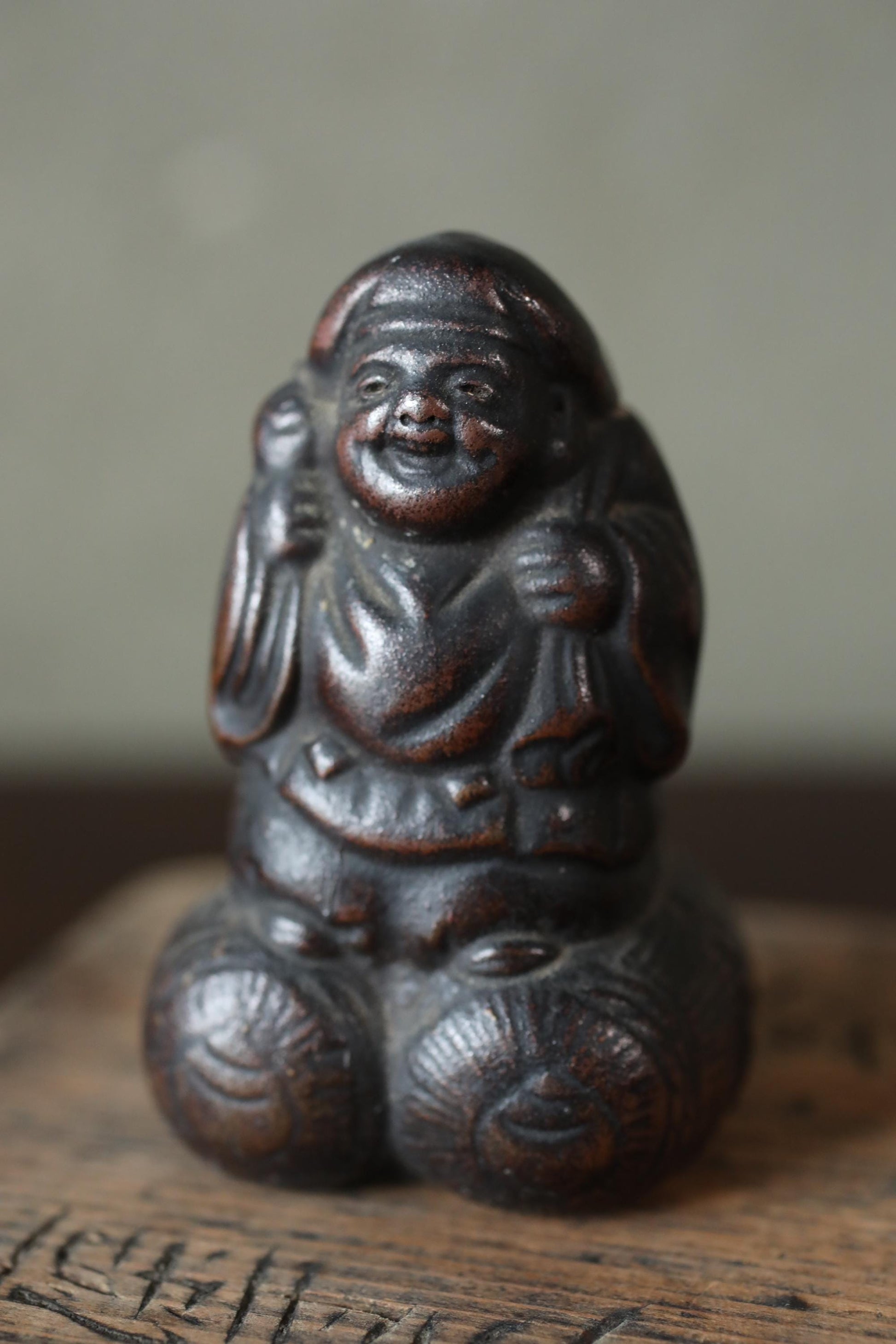 These are made of 備前 Bizen ware, which is pottery that uses no glaze and makes use of the natural texture of the clay. They are a very dark brown color, and over the course of 100 years, they have developed a beautiful depth and luster. These are probably small in size, so they were probably carried around as talismans during travel or peddling.