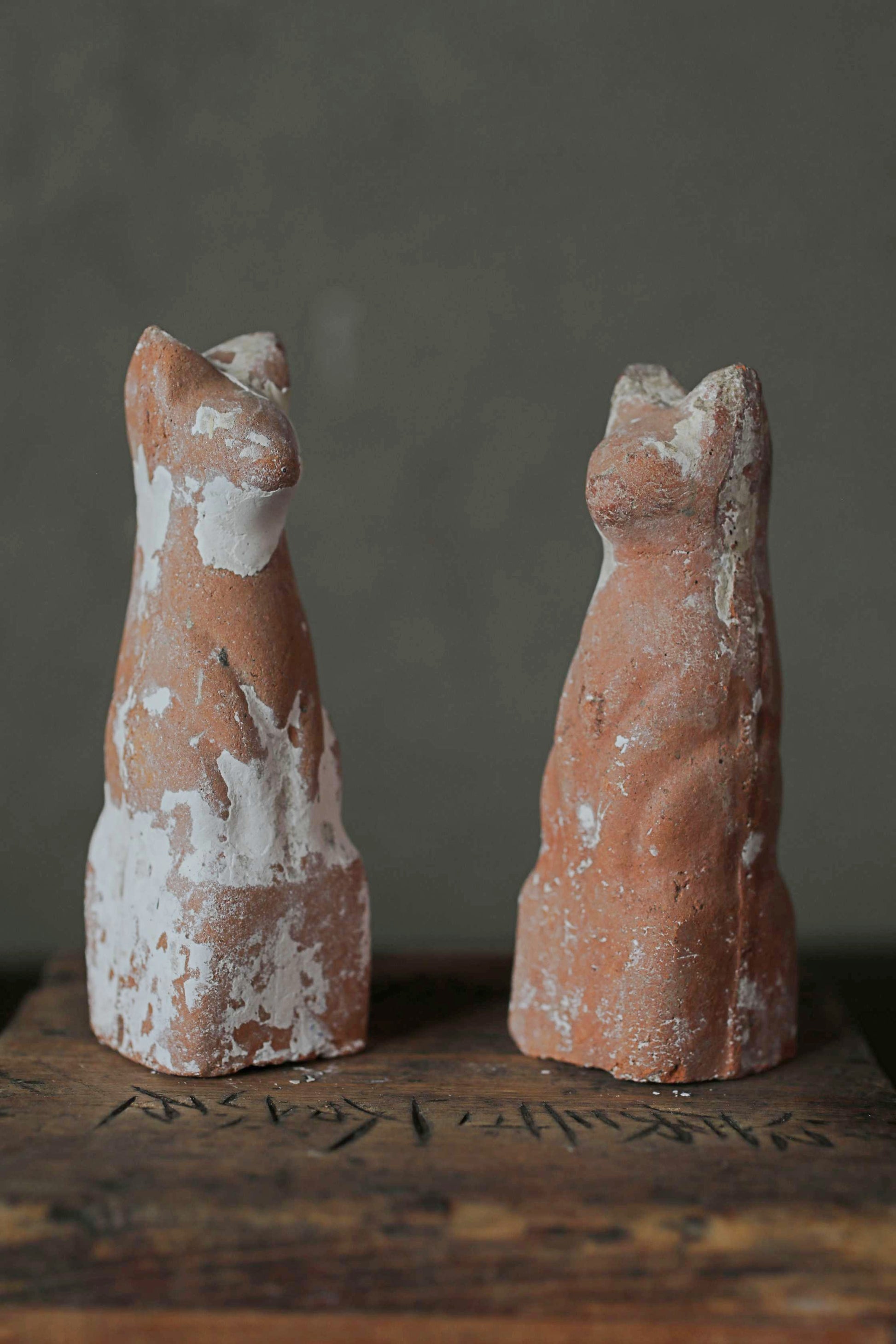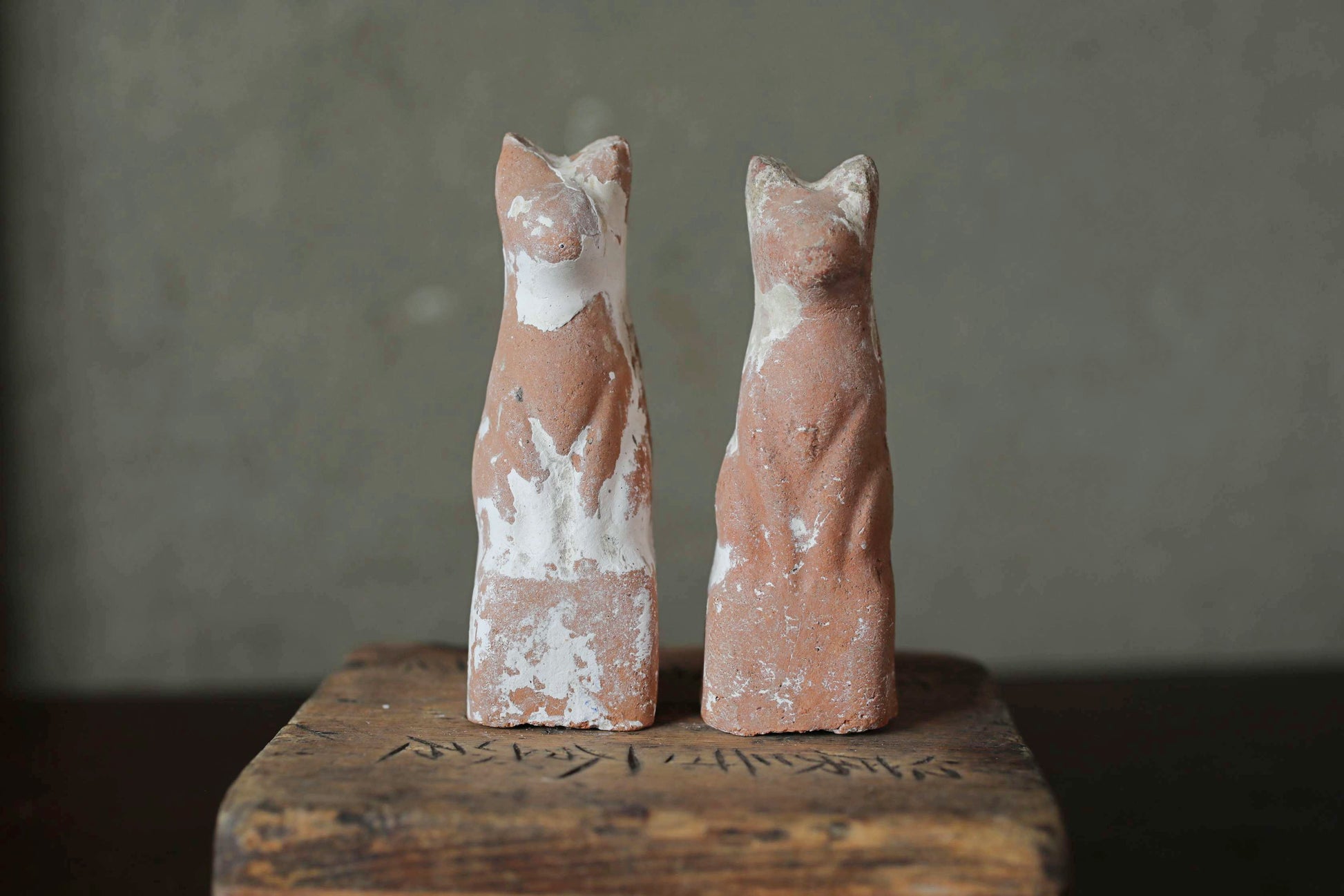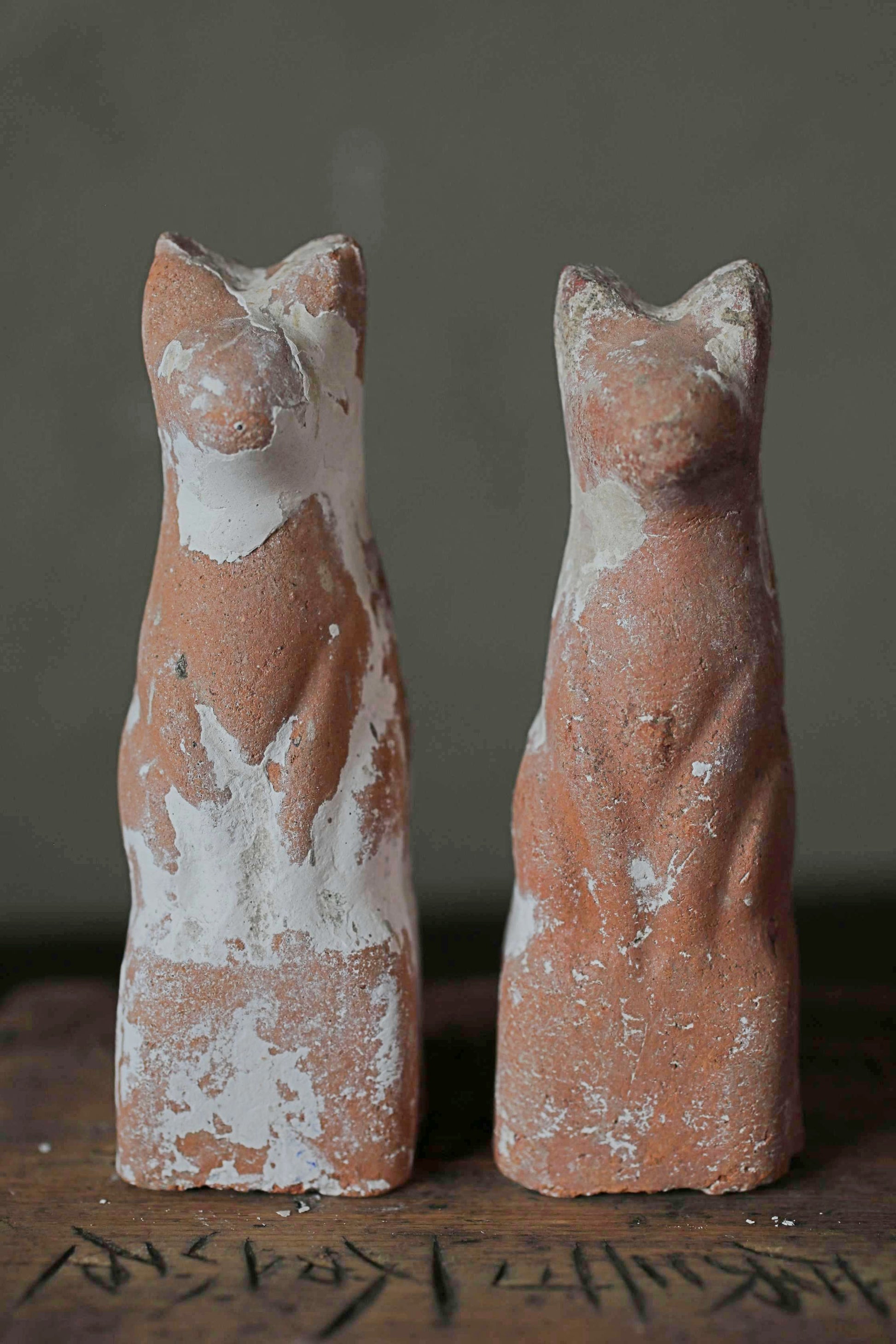 Japanese Antique 1910s pair of KITSUNE dolls Pottery from Shinto shrine Altar Foxes art Japanese guardian deity Okimono H3.5in/9cm.