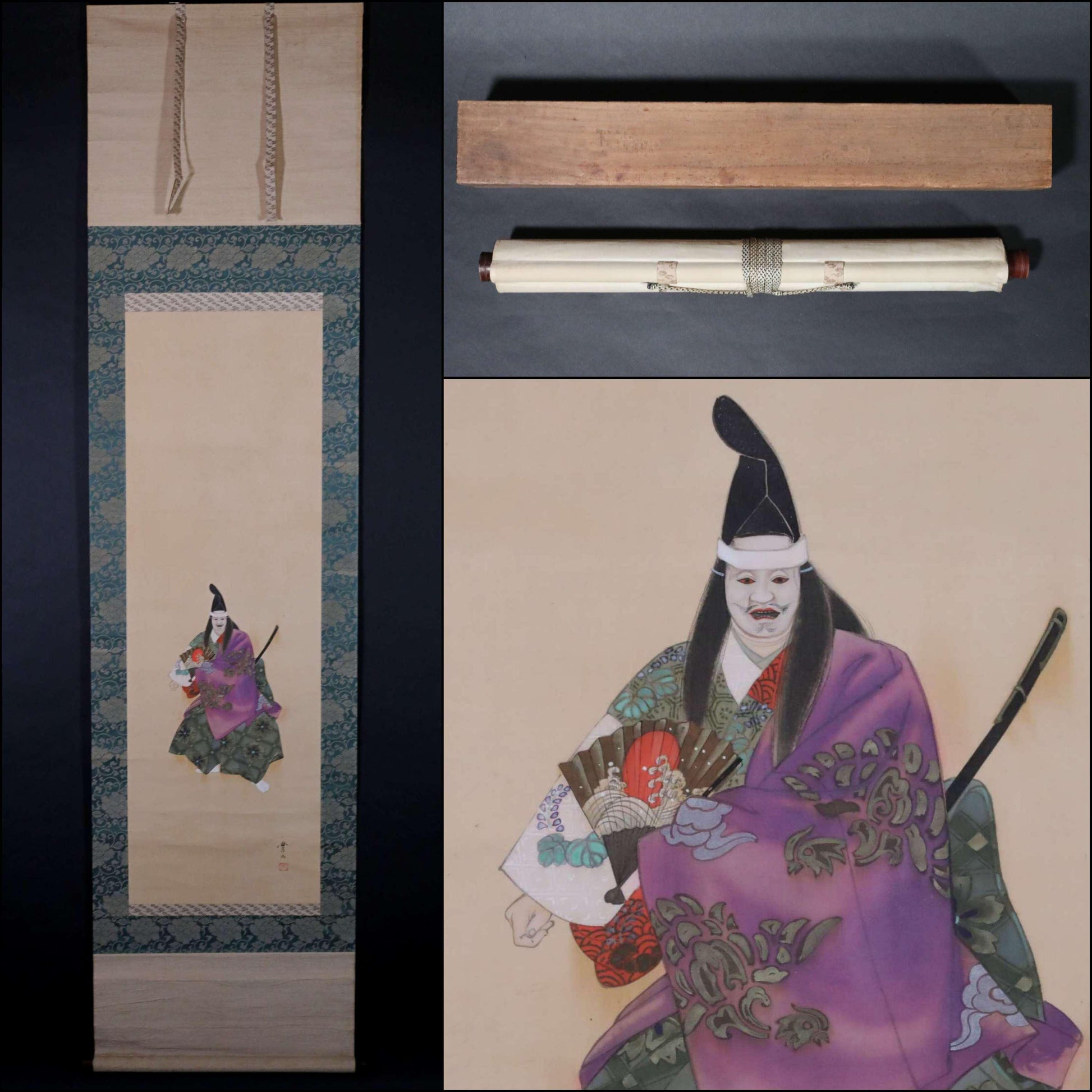 Japanese antique 1930s painting hanging scroll of water color Noh mask red eye kimono dancing with silk KAKEJIKU wooden box H75.6in/H192cm.