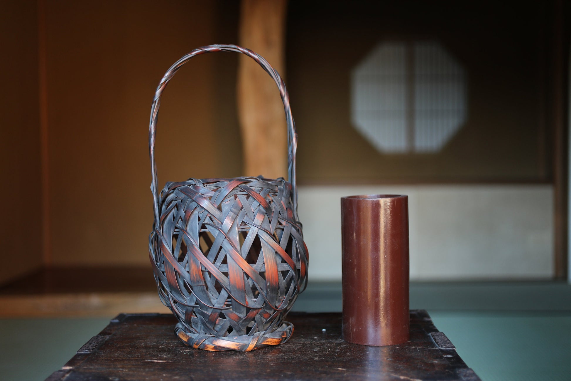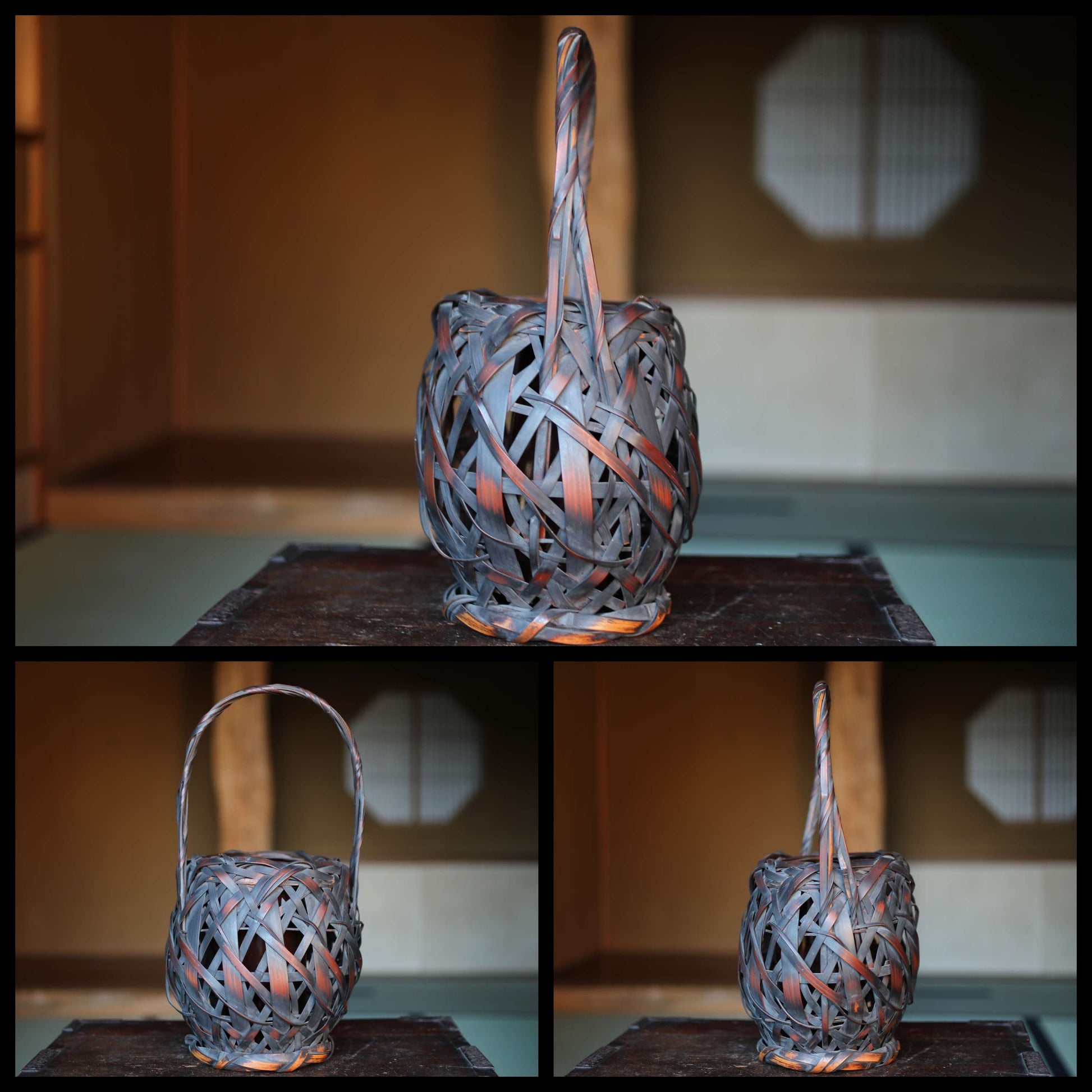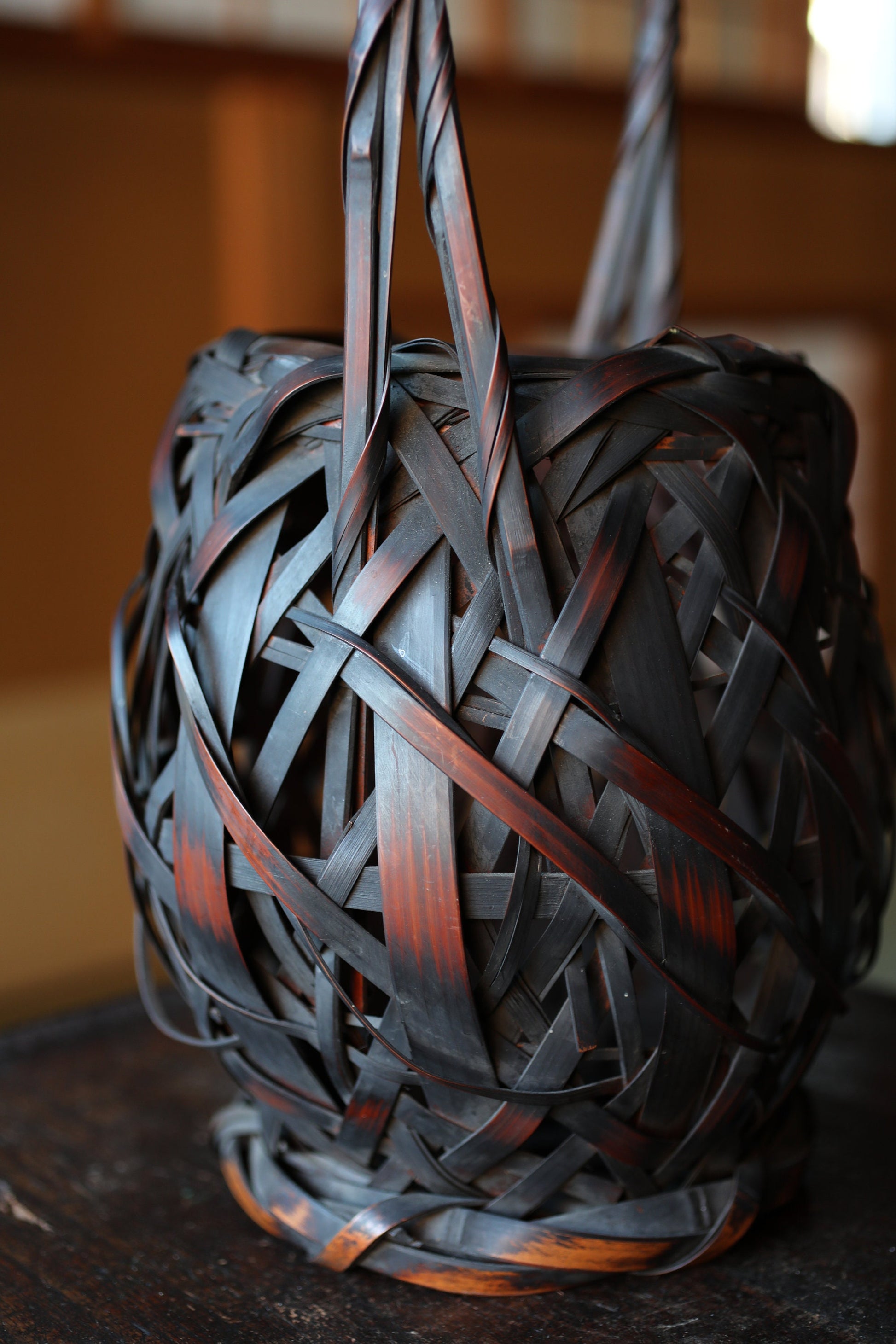 Japanese antique bamboo woven basket in smoke stained color with Inner vase For IKEBANA Tea ceremony, Hana-kago 1920s H16.5×7.1in