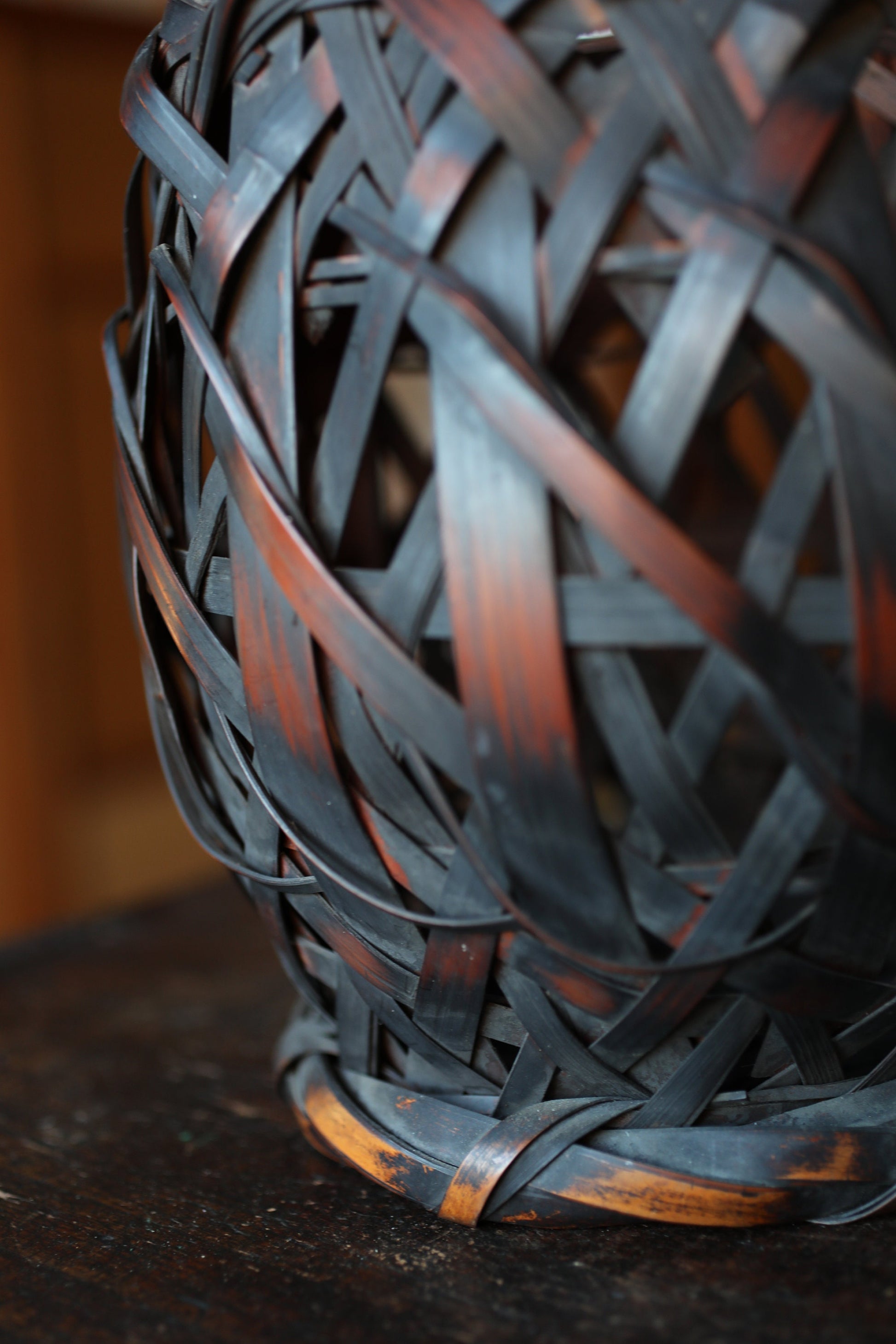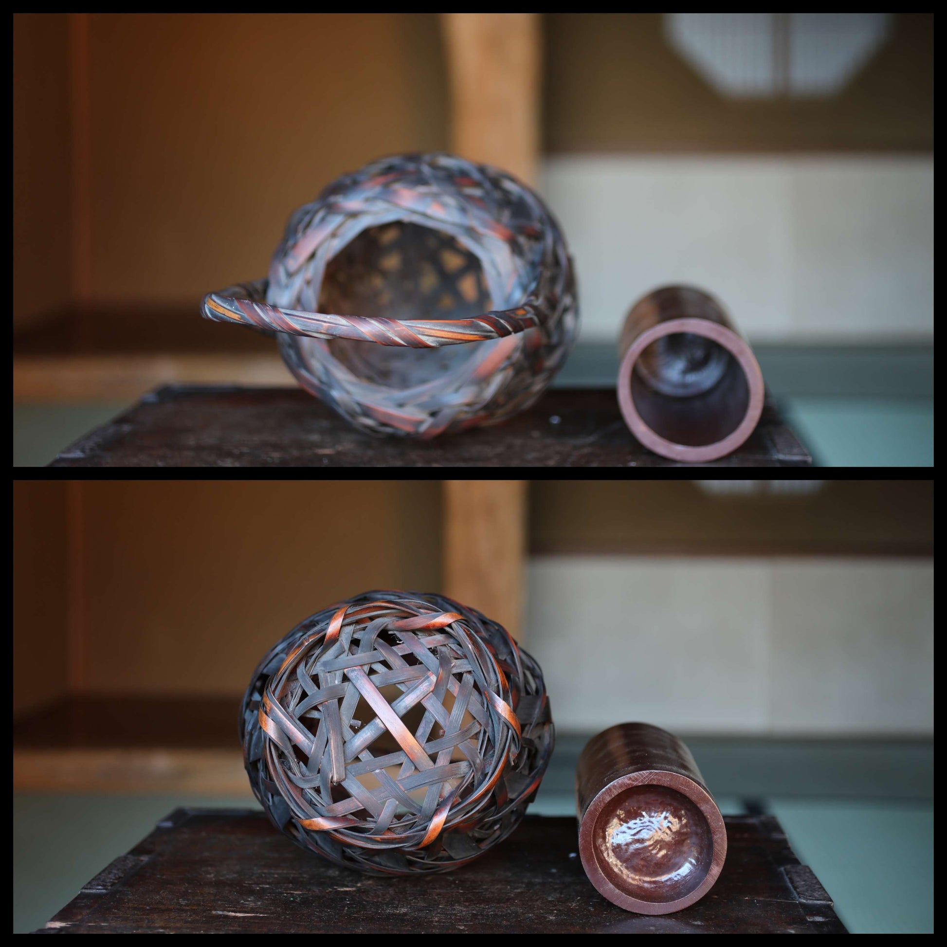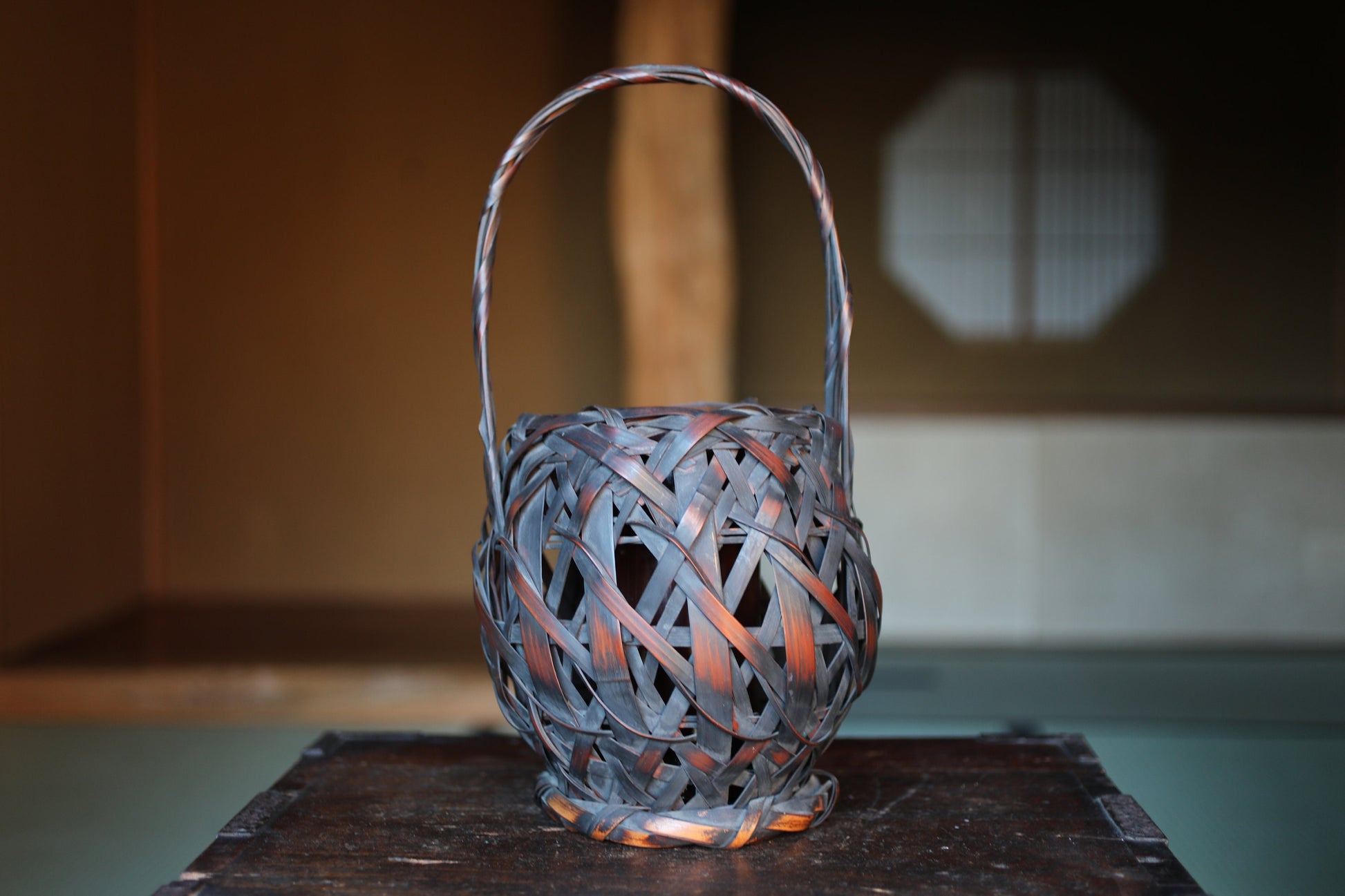 Japanese antique bamboo woven basket in smoke stained color with Inner vase For IKEBANA Tea ceremony, Hana-kago 1920s H16.5×7.1in