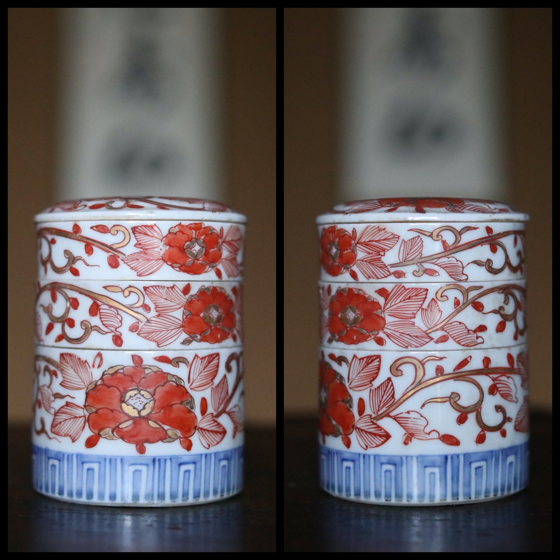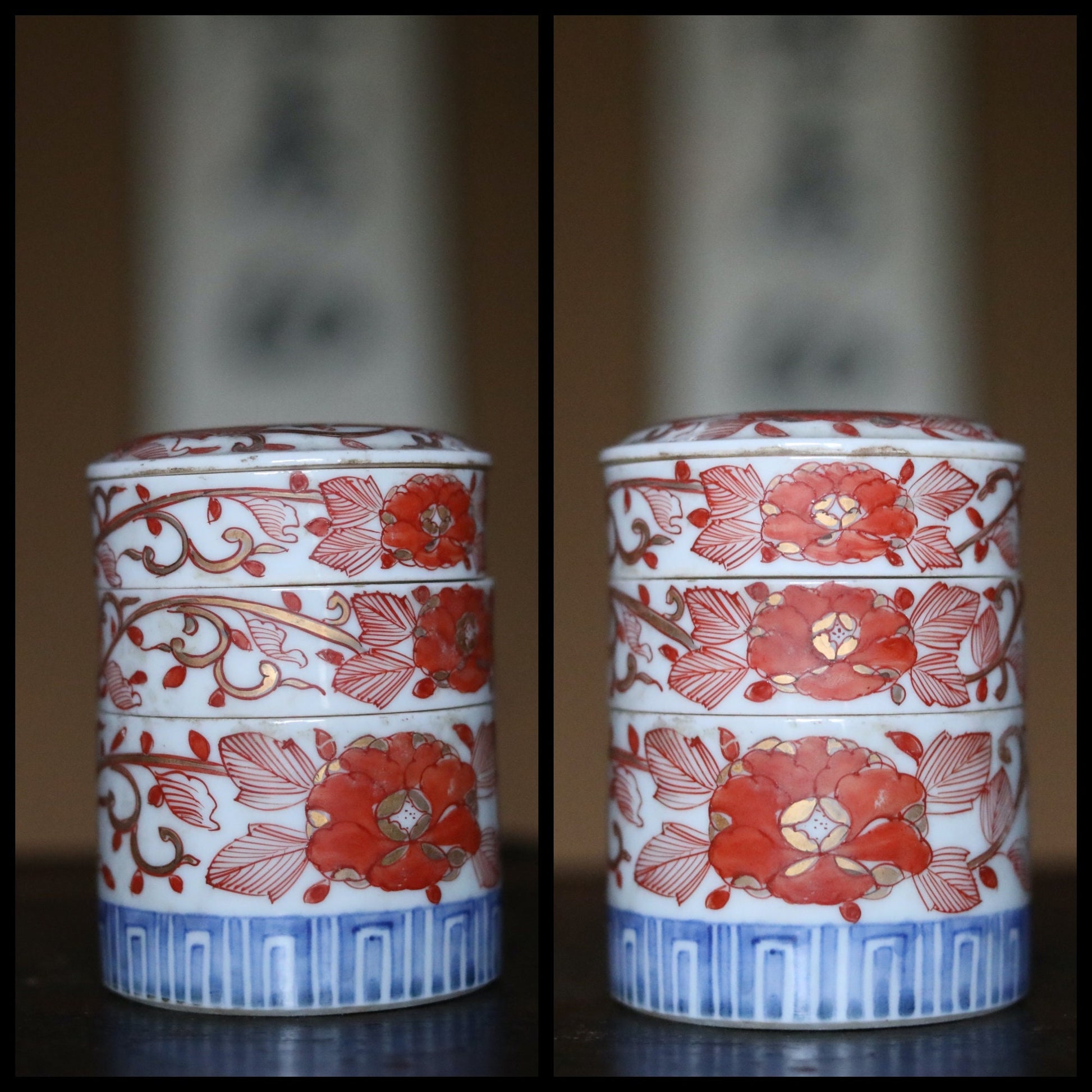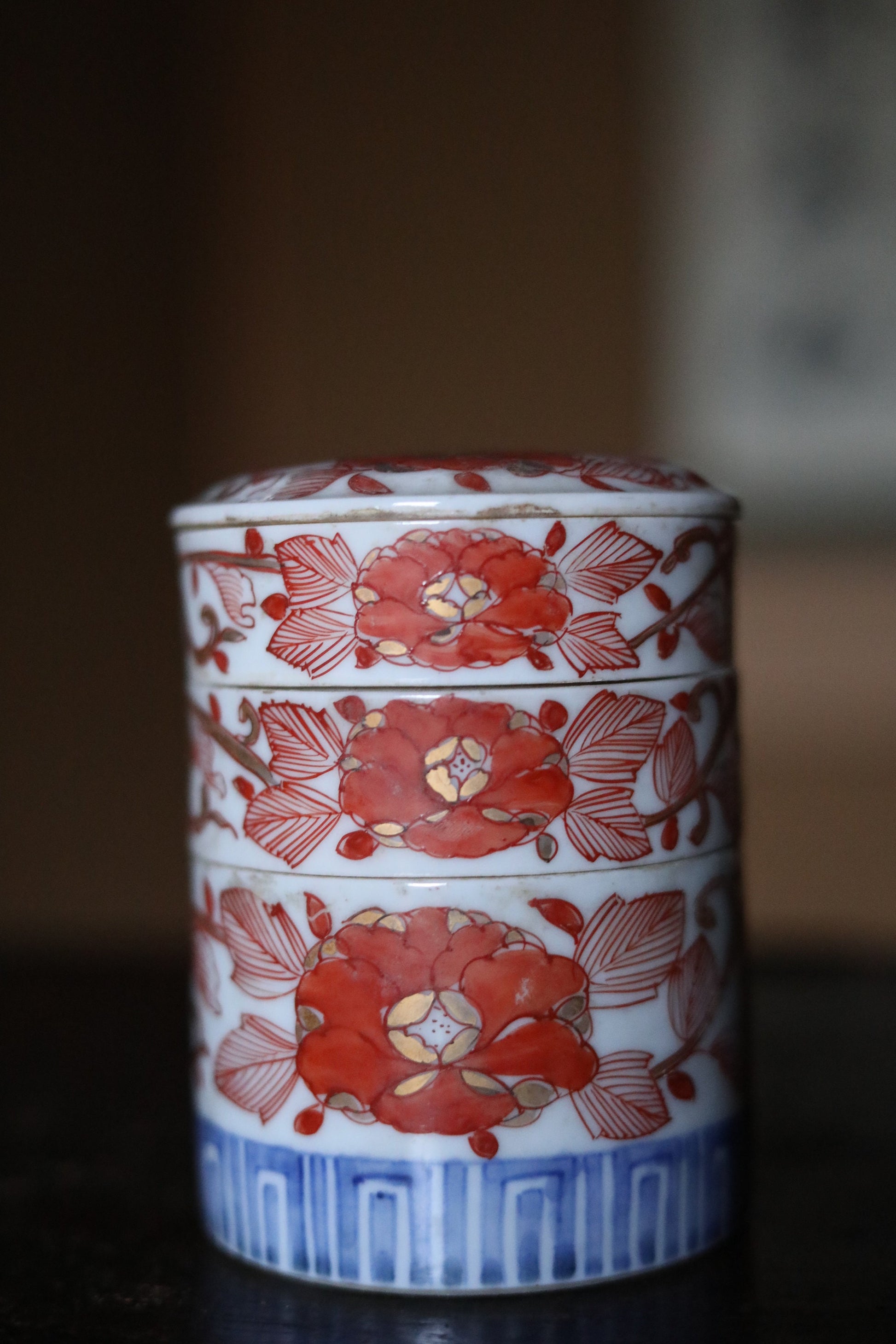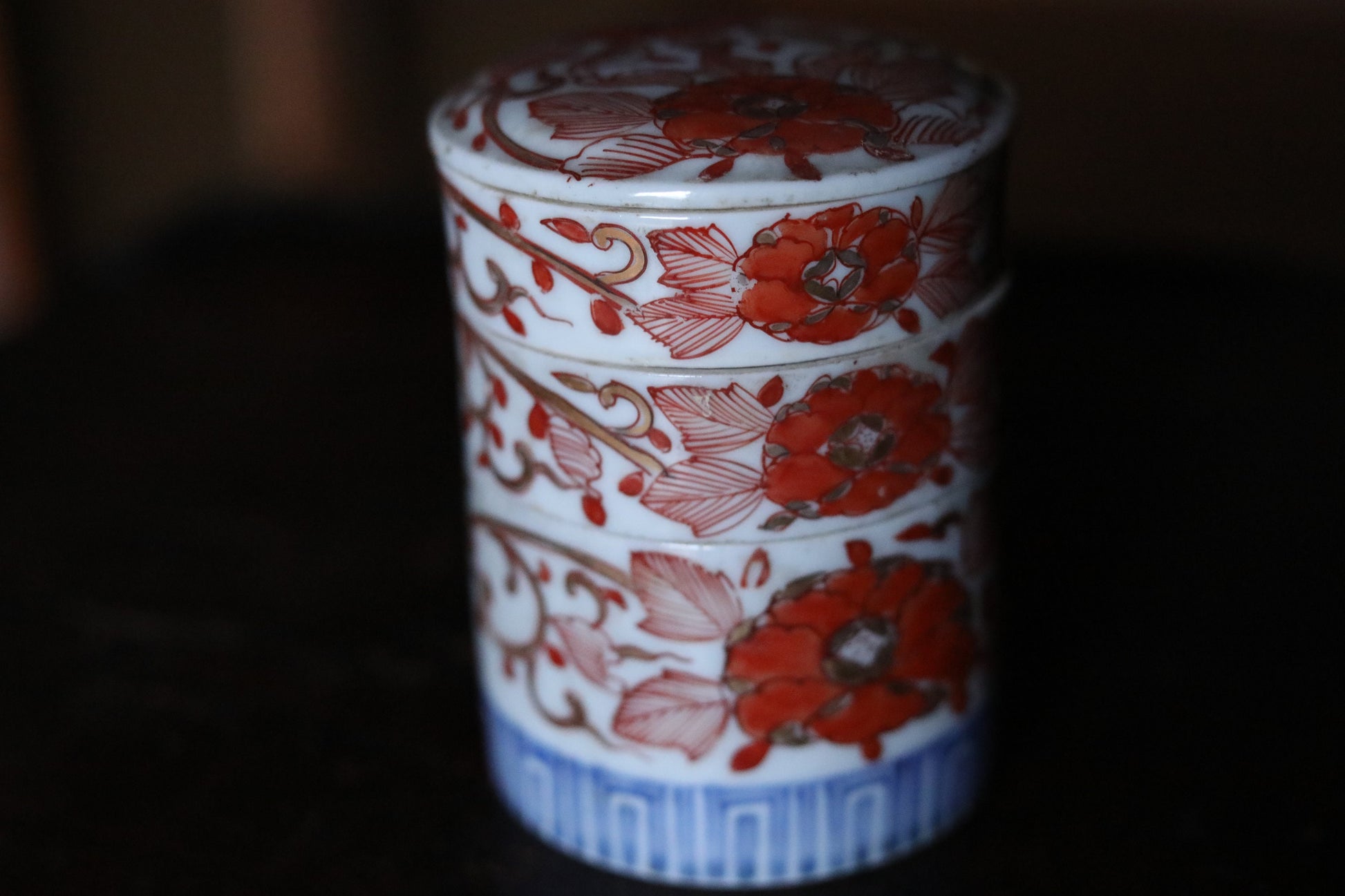 Japanese Antique Box Jūbako Imari Porcelain with flower hand painting Stacking ceramic jewelry Box Japanese furniture 1880s H4.3in/11cm