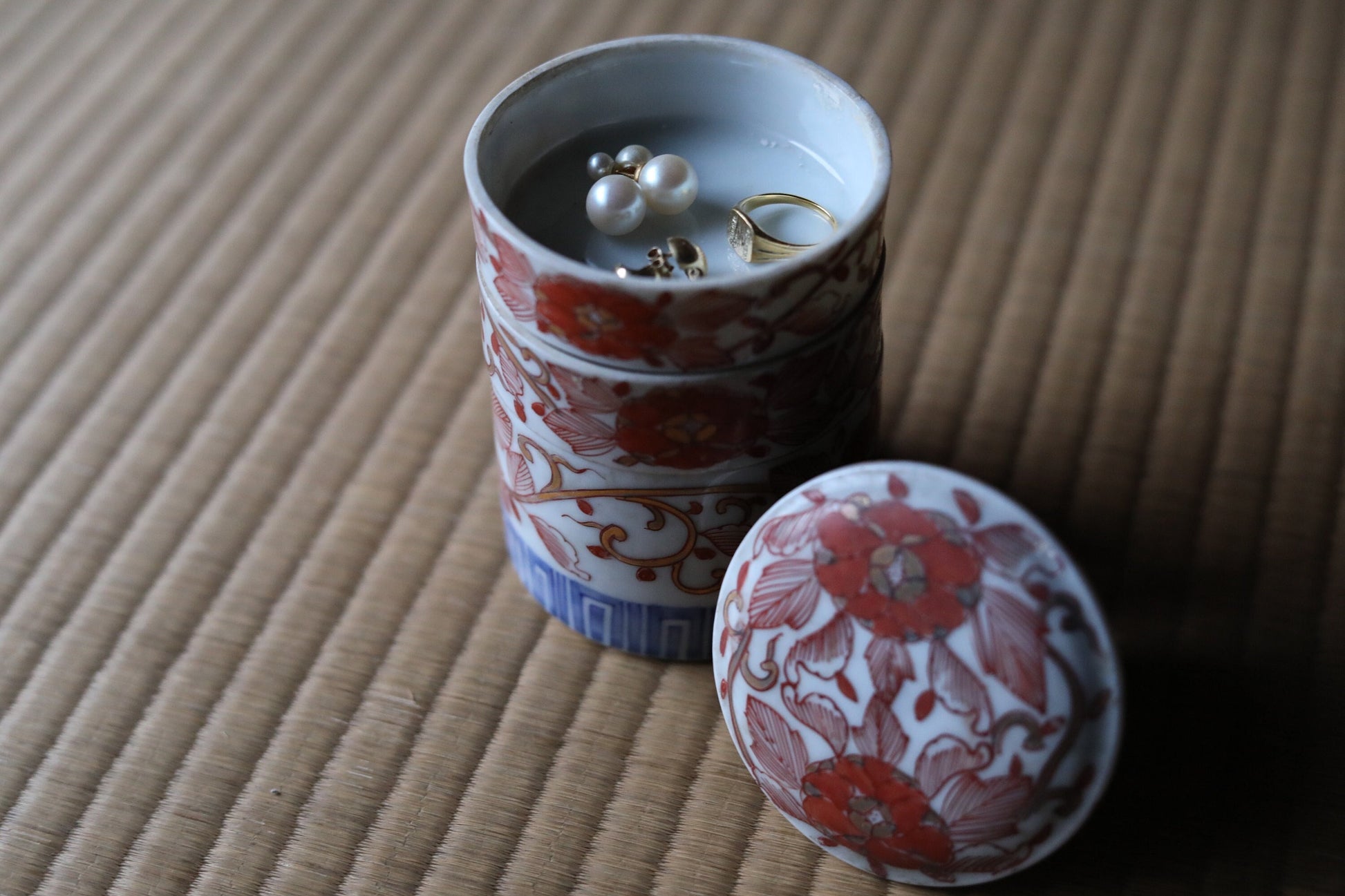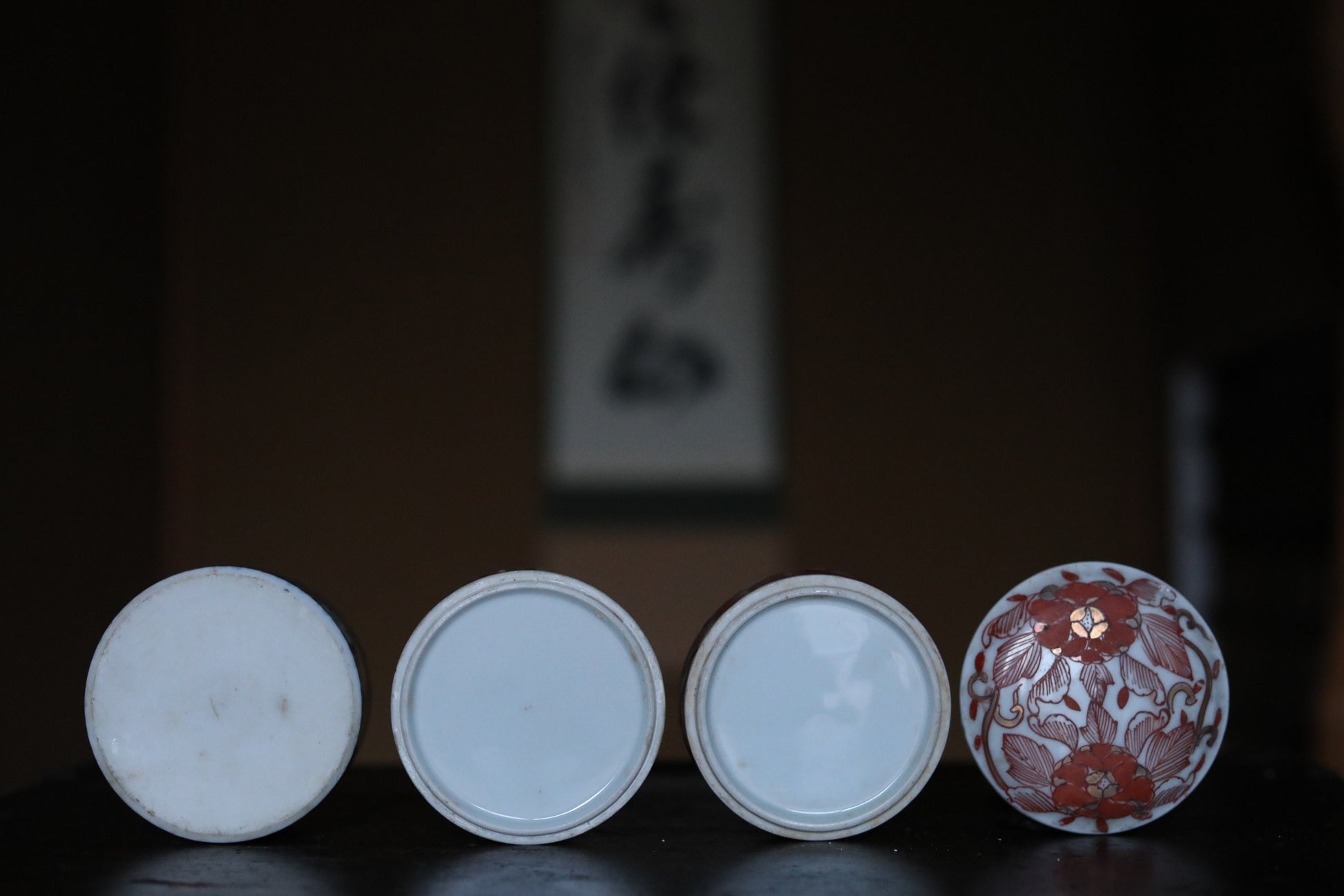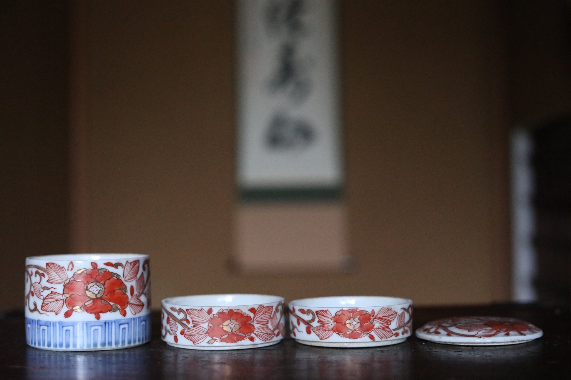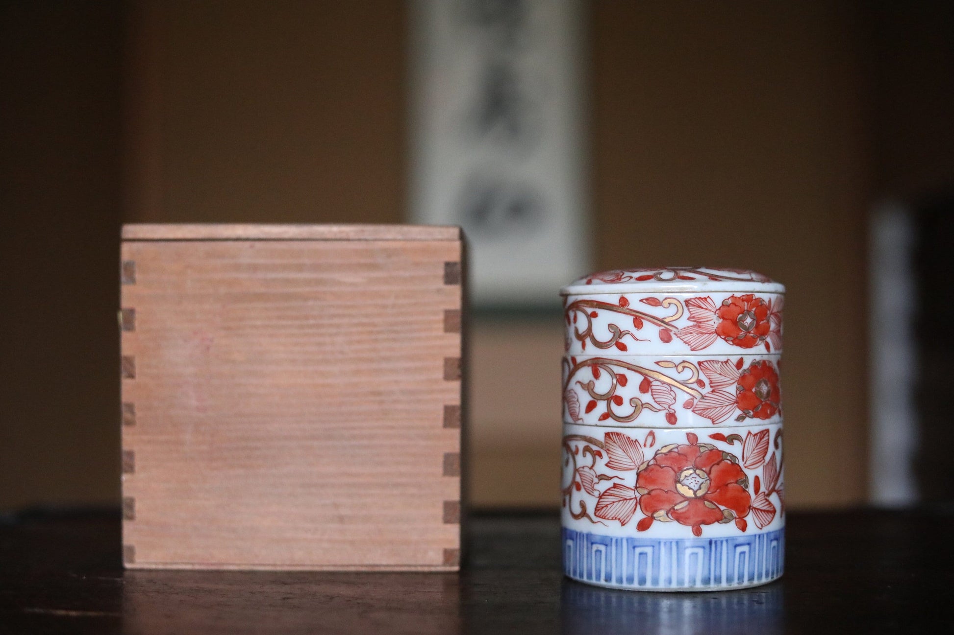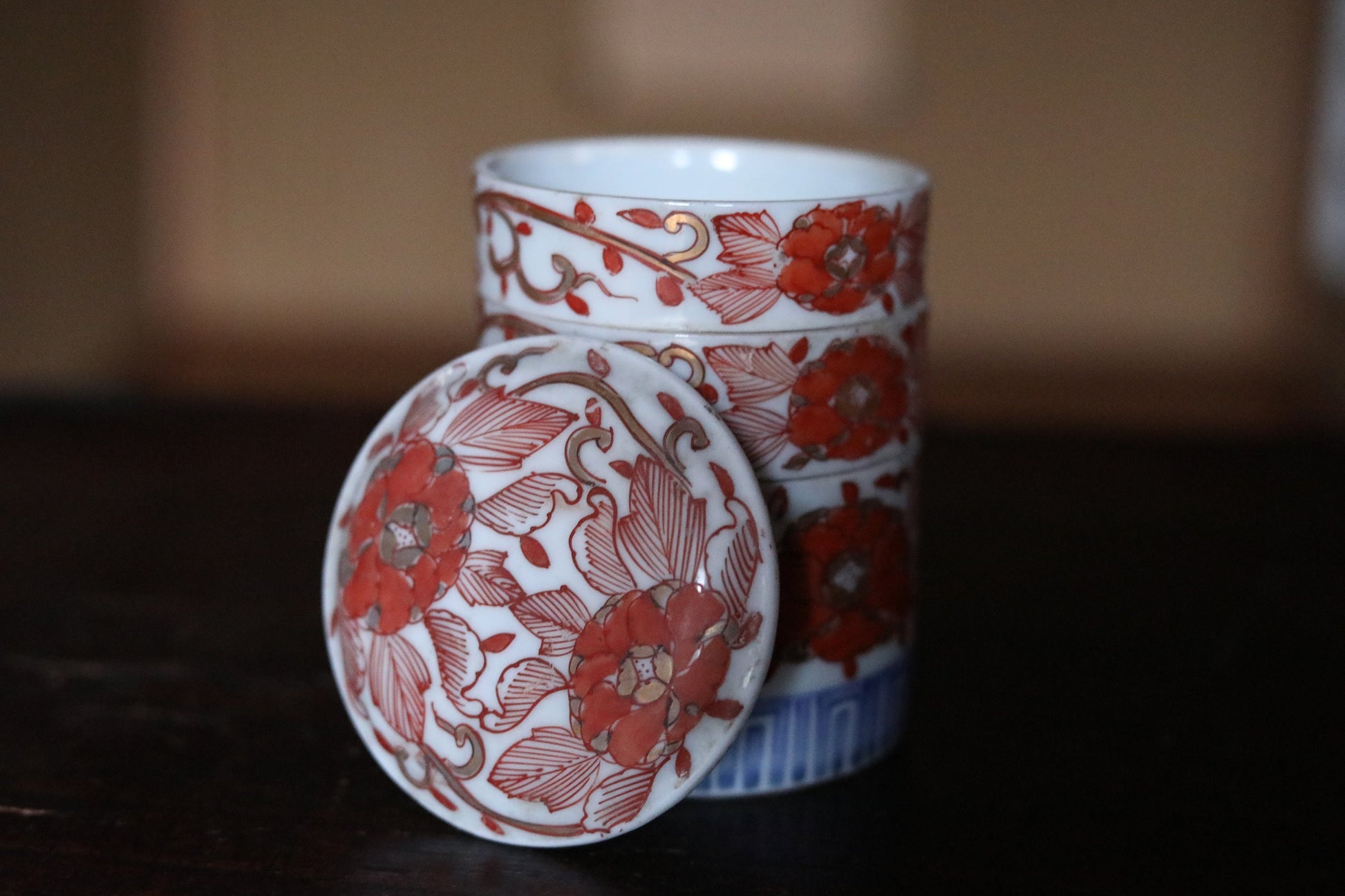 Japanese Antique Box Jūbako Imari Porcelain with flower hand painting Stacking ceramic jewelry Box Japanese furniture 1880s H4.3in/11cm