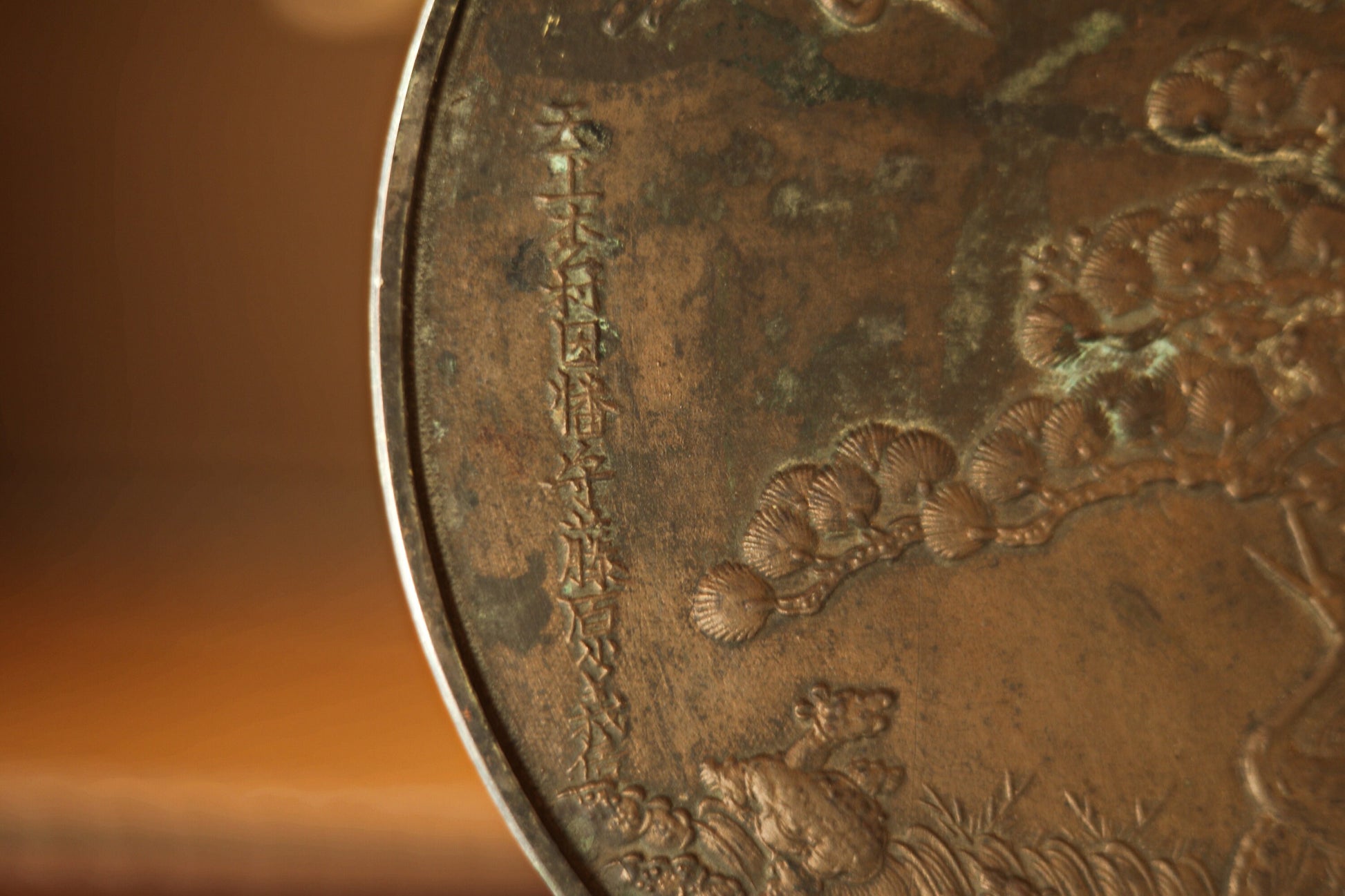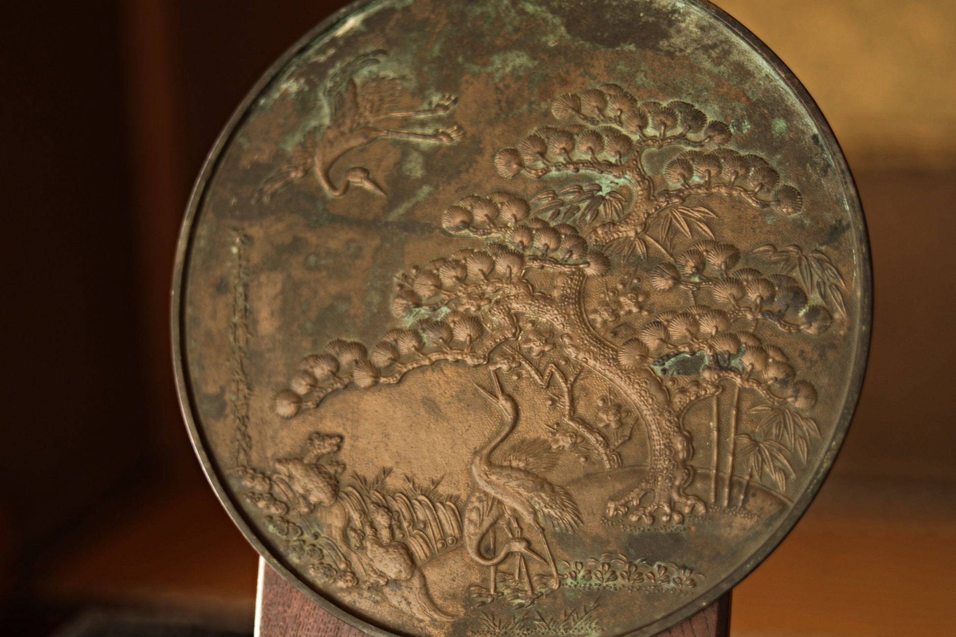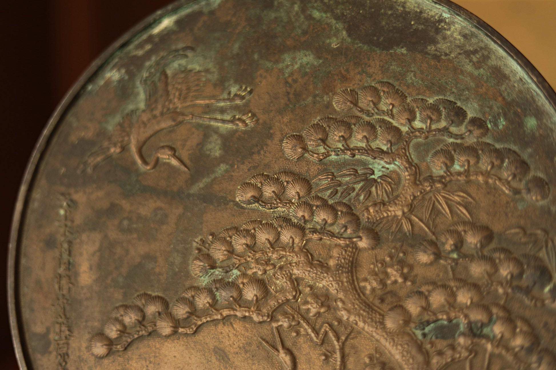 Japanese antique bronze mirror Kagami with relief of cranes pine with wooden case traditional Japan Geisha accessory SAMURAI1800sH13.2×9.3in