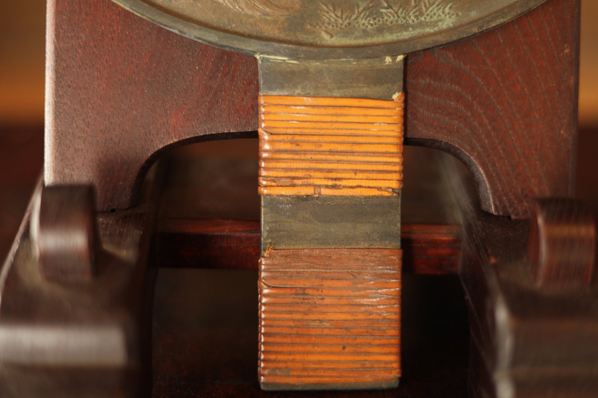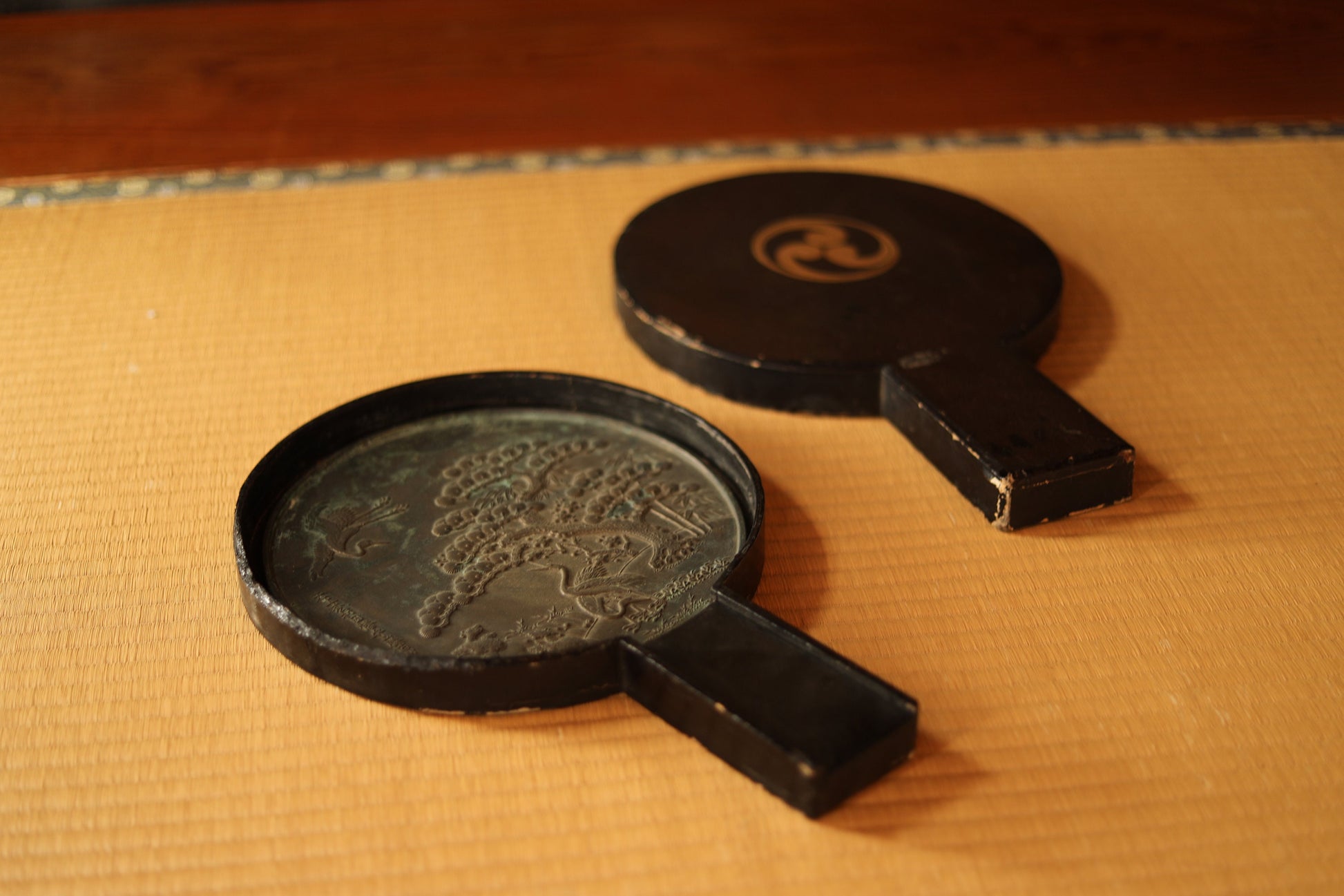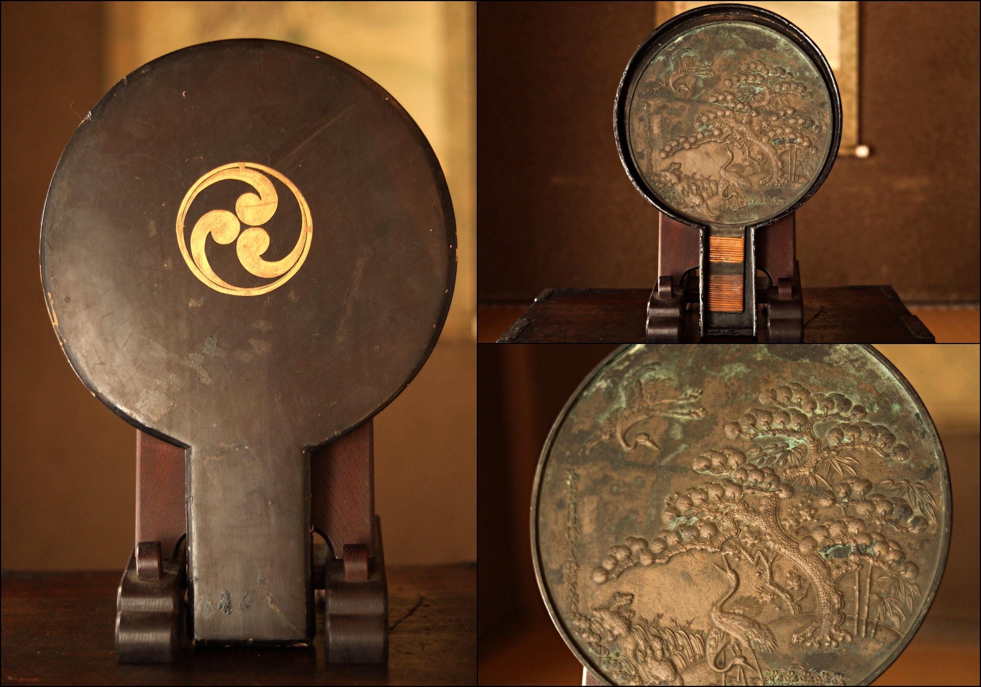 Japanese antique bronze mirror Kagami with relief of cranes and pine with wooden case traditional Japan Geisha accessory SAMURAI H13.2×9.3in.