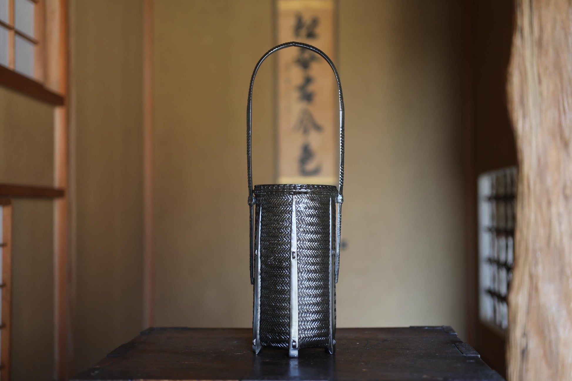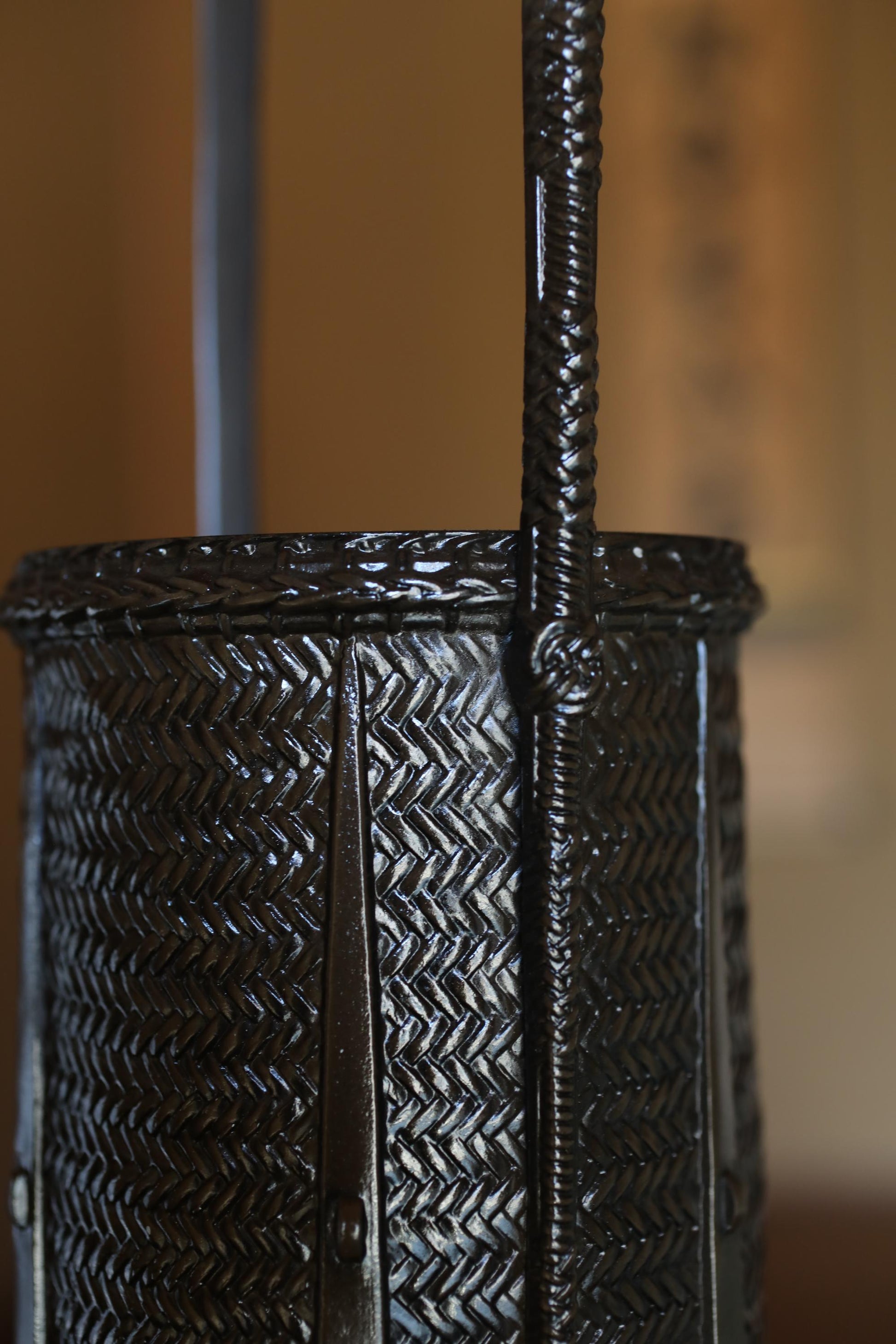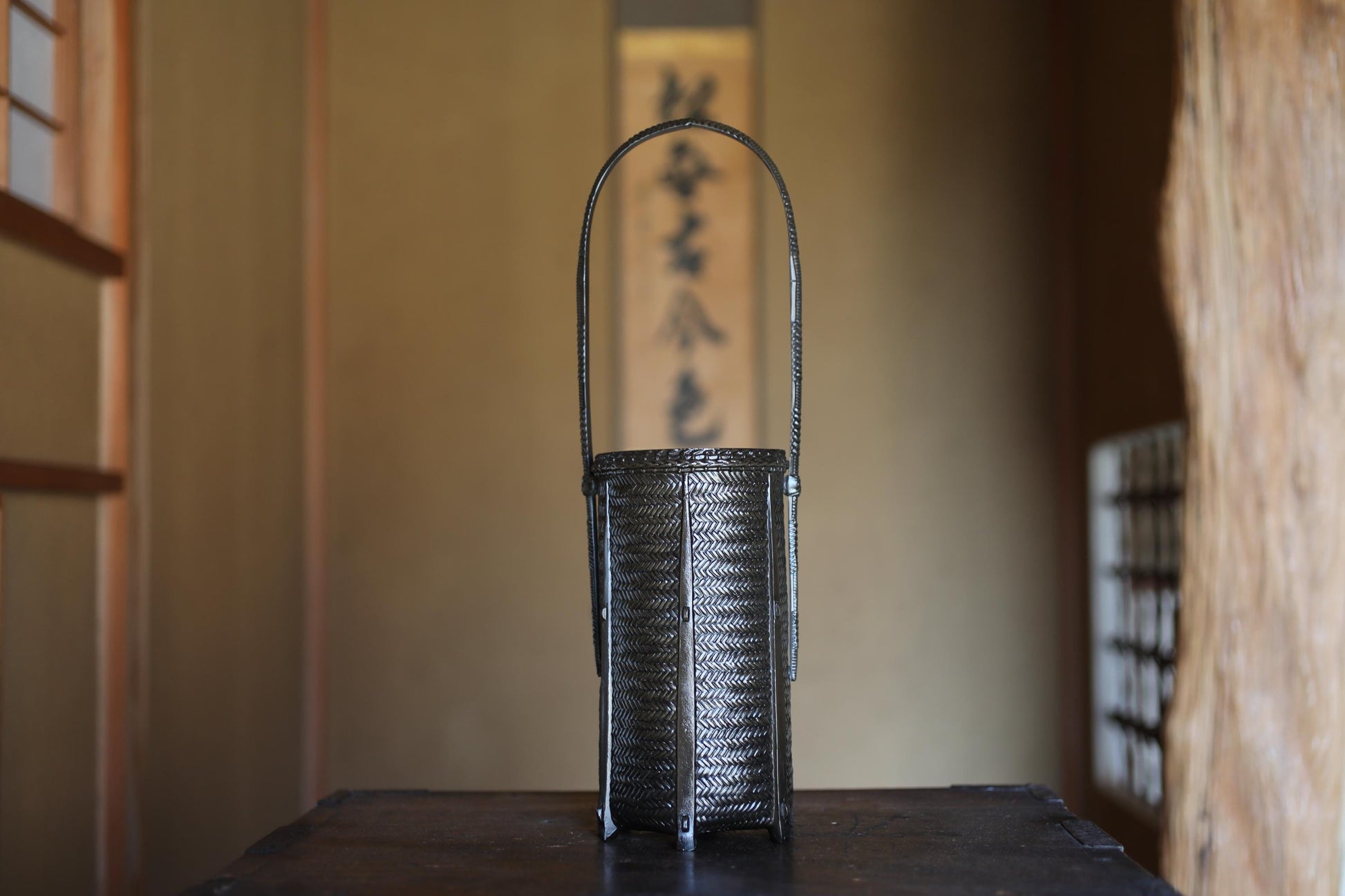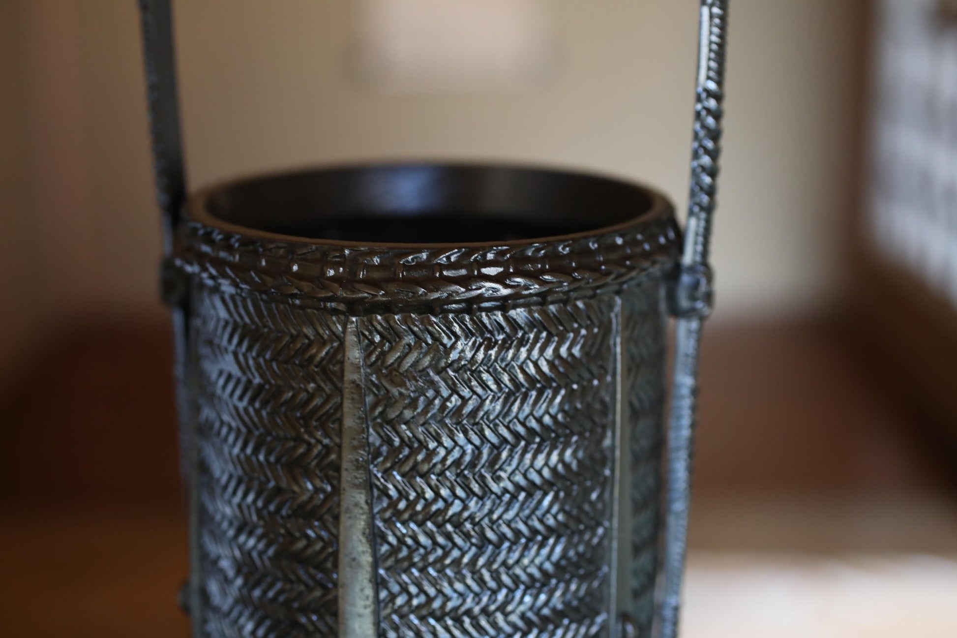 Japanese antique bronze Ornament vase shaped as bamboo basket 高岡Takaoka copper ware ikebana utensil Tea ceremony, H16.5in/H42cm