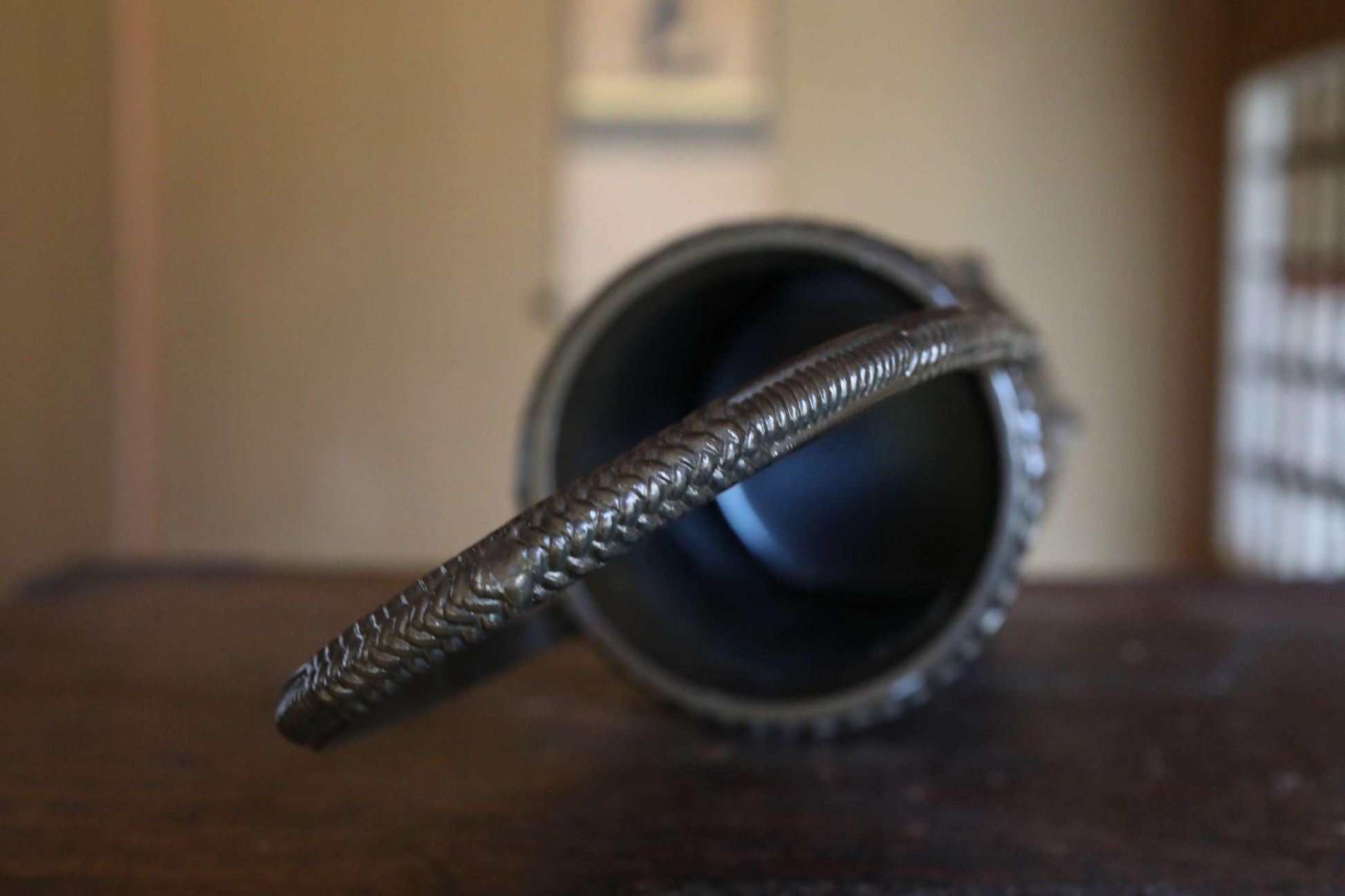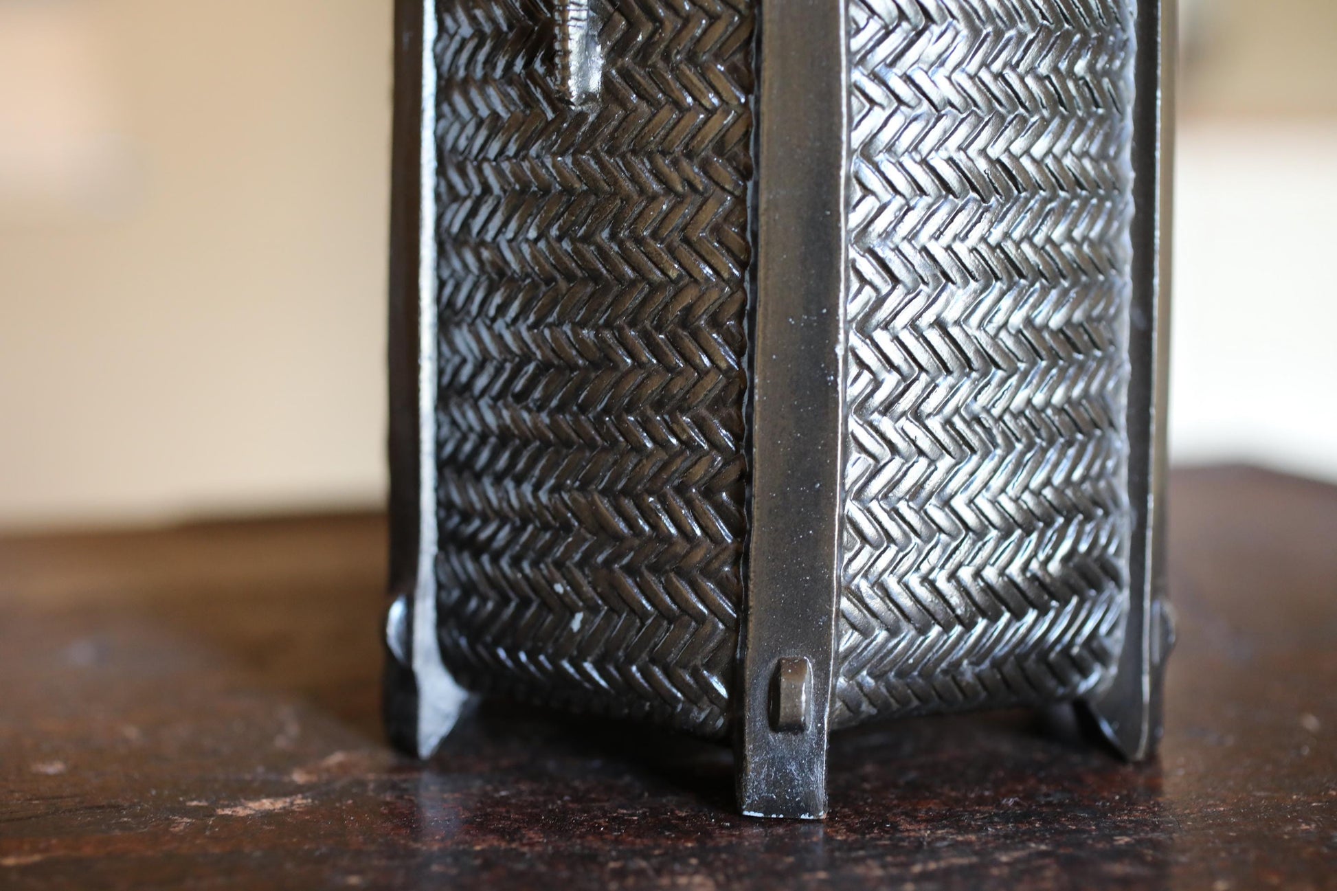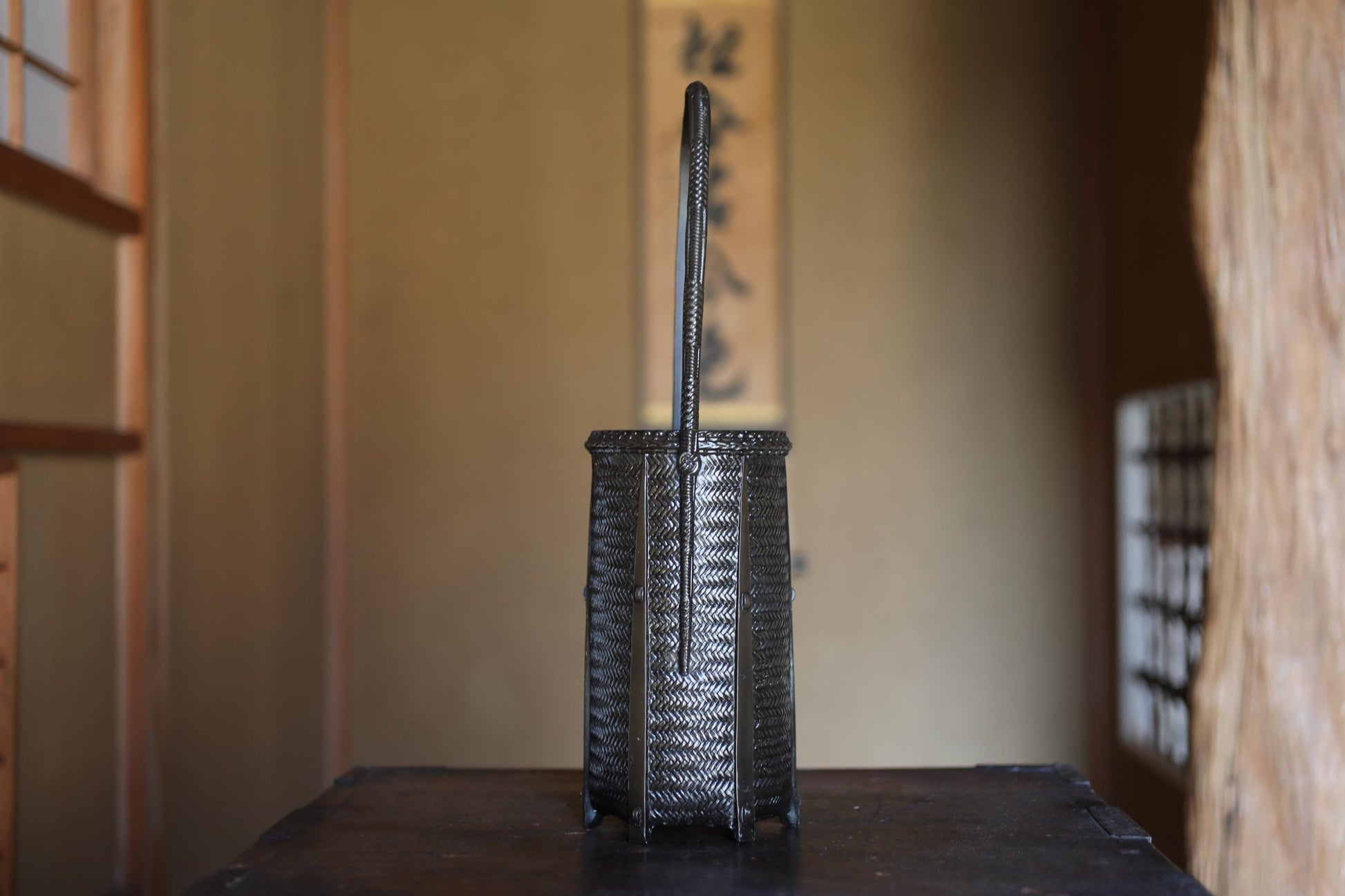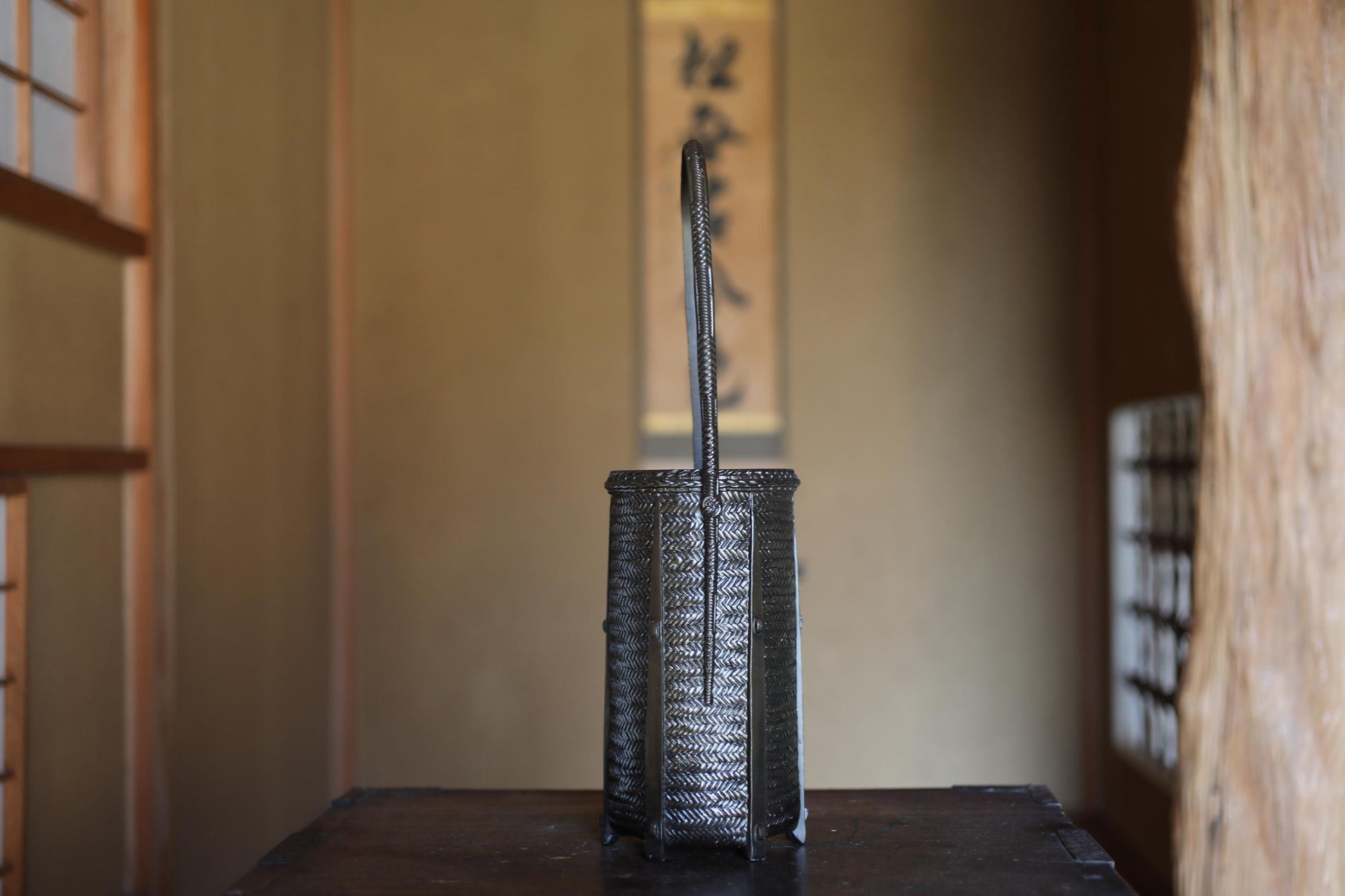 Japanese antique bronze Ornament vase shaped as bamboo basket 高岡Takaoka copper ware ikebana utensil Tea ceremony, H16.5in/H42cm