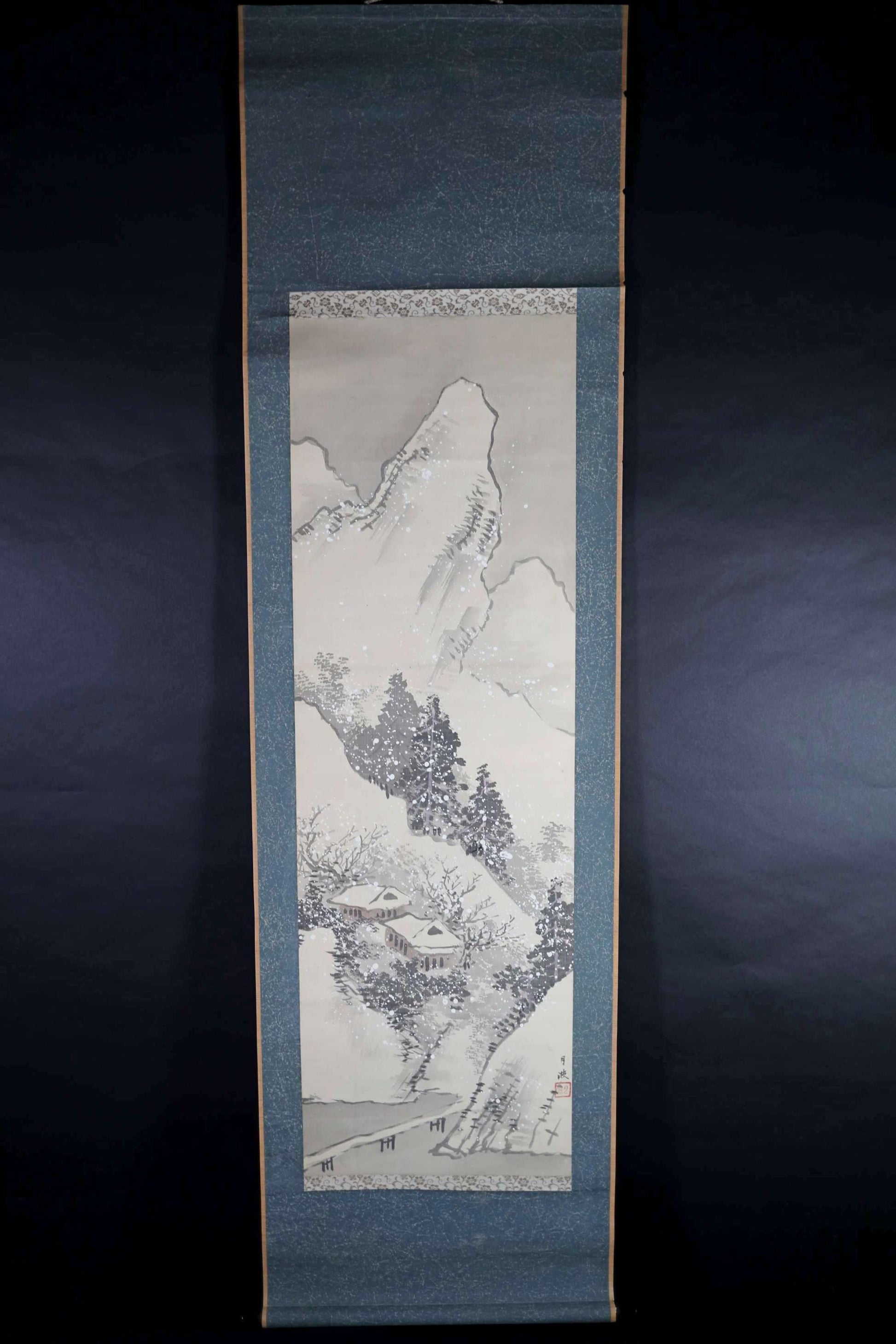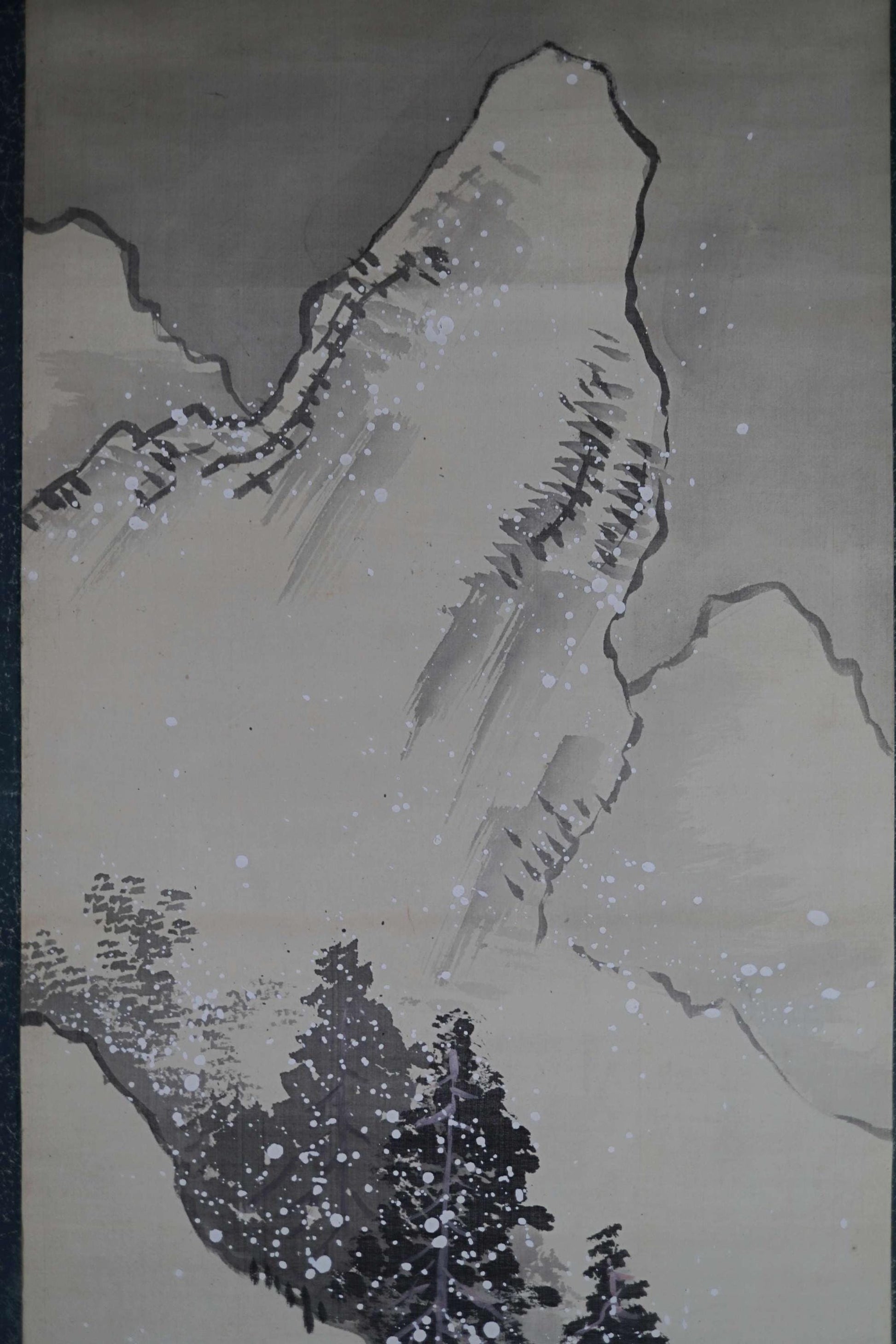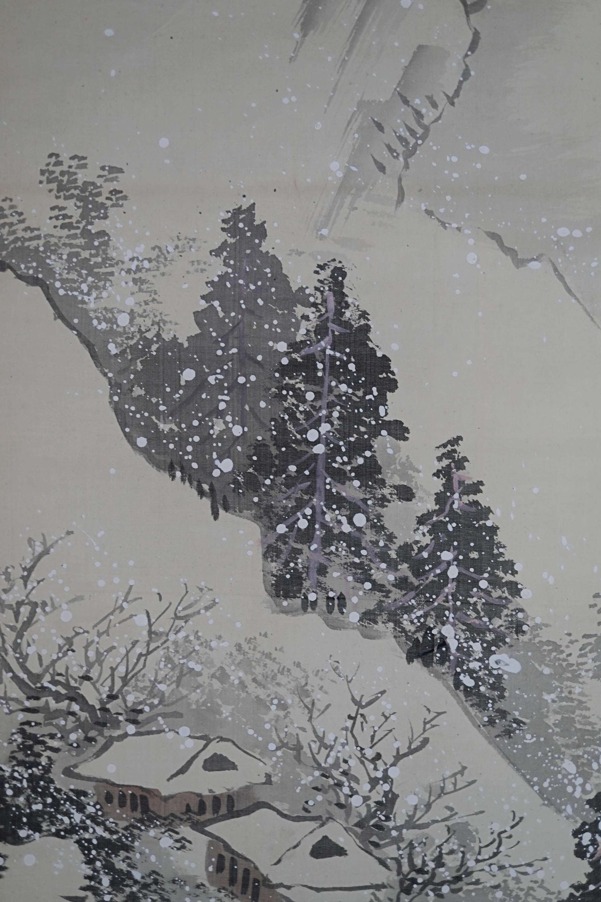 Japanese antique brush ink painting scroll fine Landscape in winter mountain valley, Kanji signature, KAKEJIKU H67.3×18.9in / 171x48cm