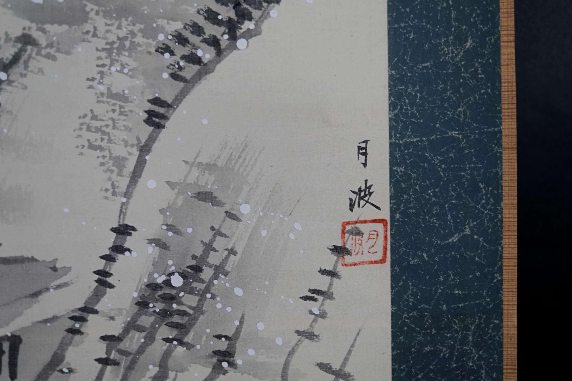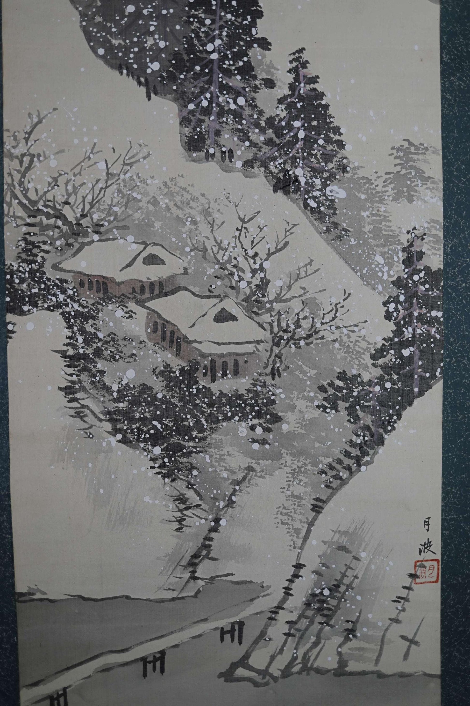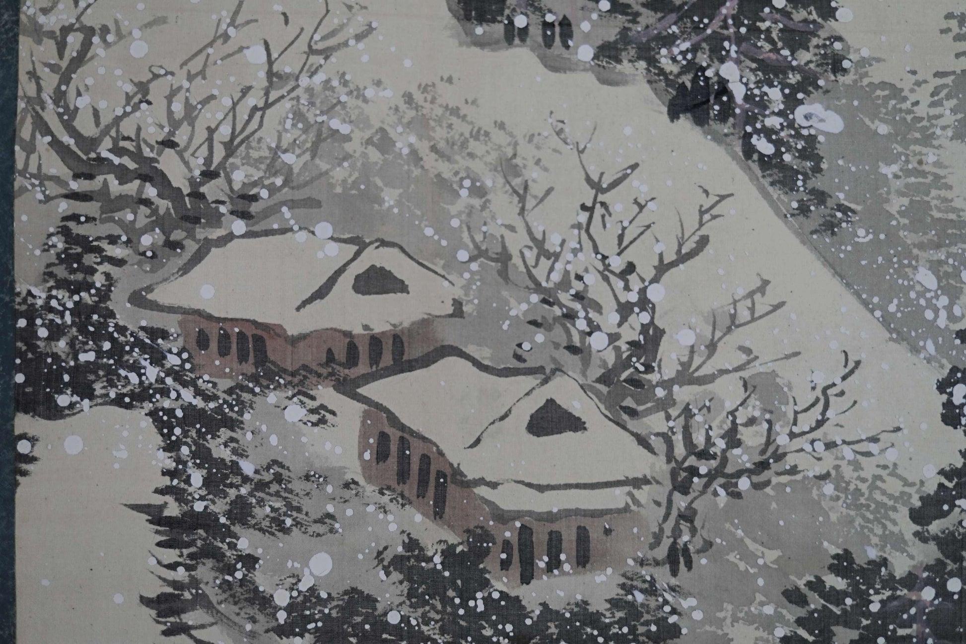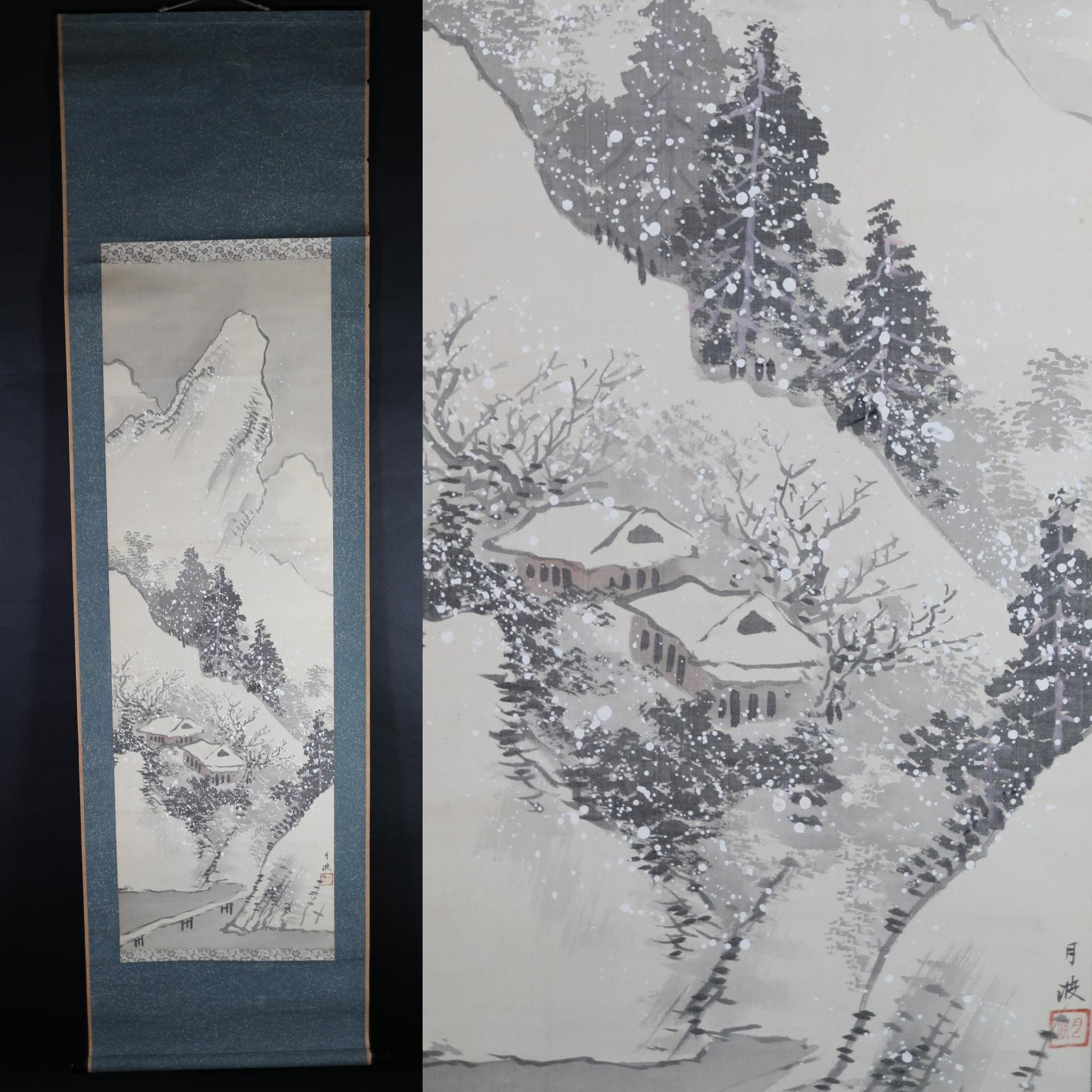 Japanese antique brush ink painting scroll fine Landscape in winter mountain valley, Kanji signature, KAKEJIKU H67.3×18.9in / 171x48cm