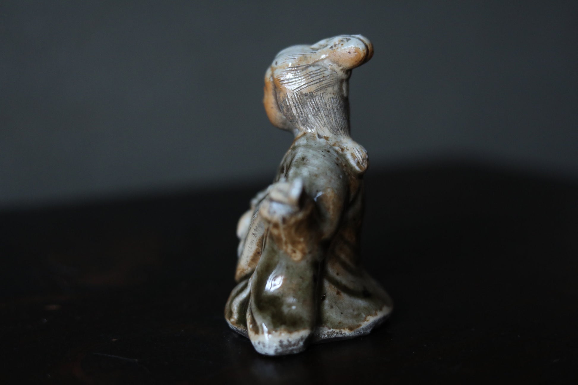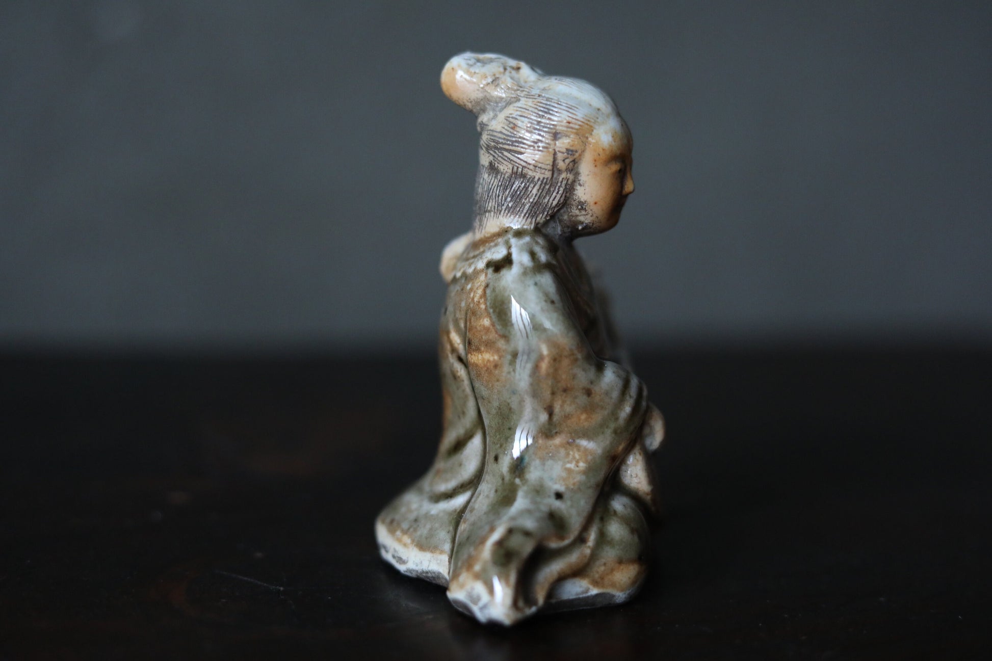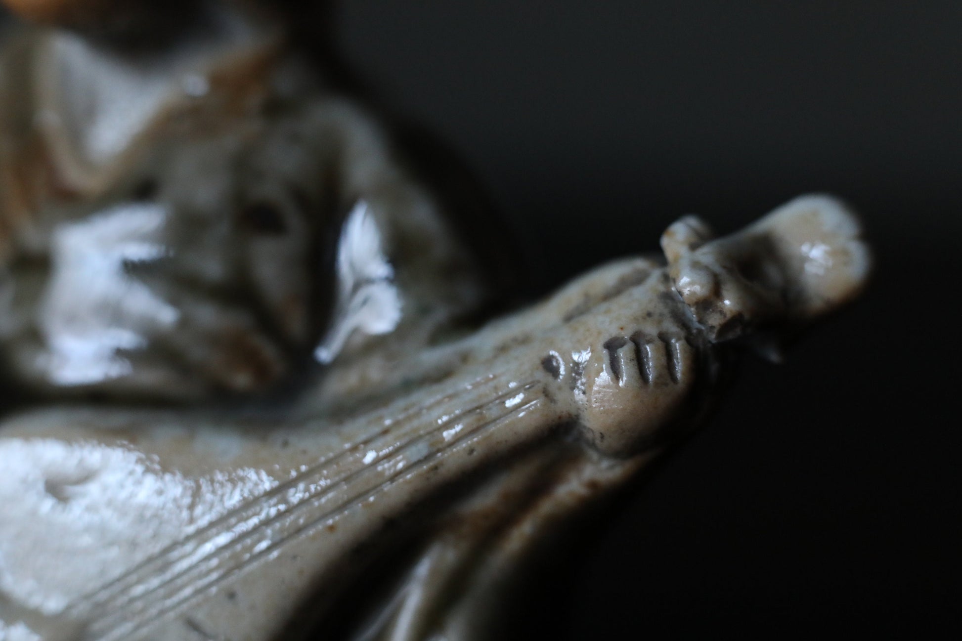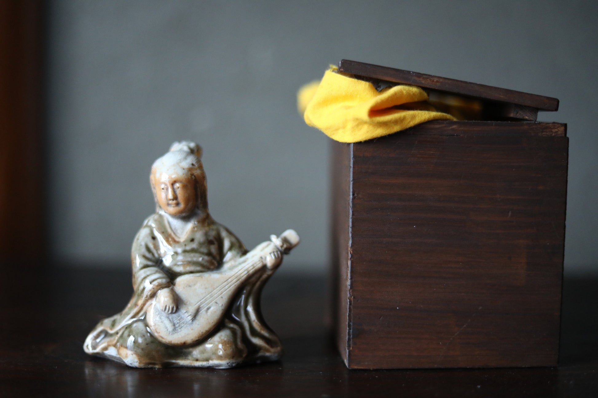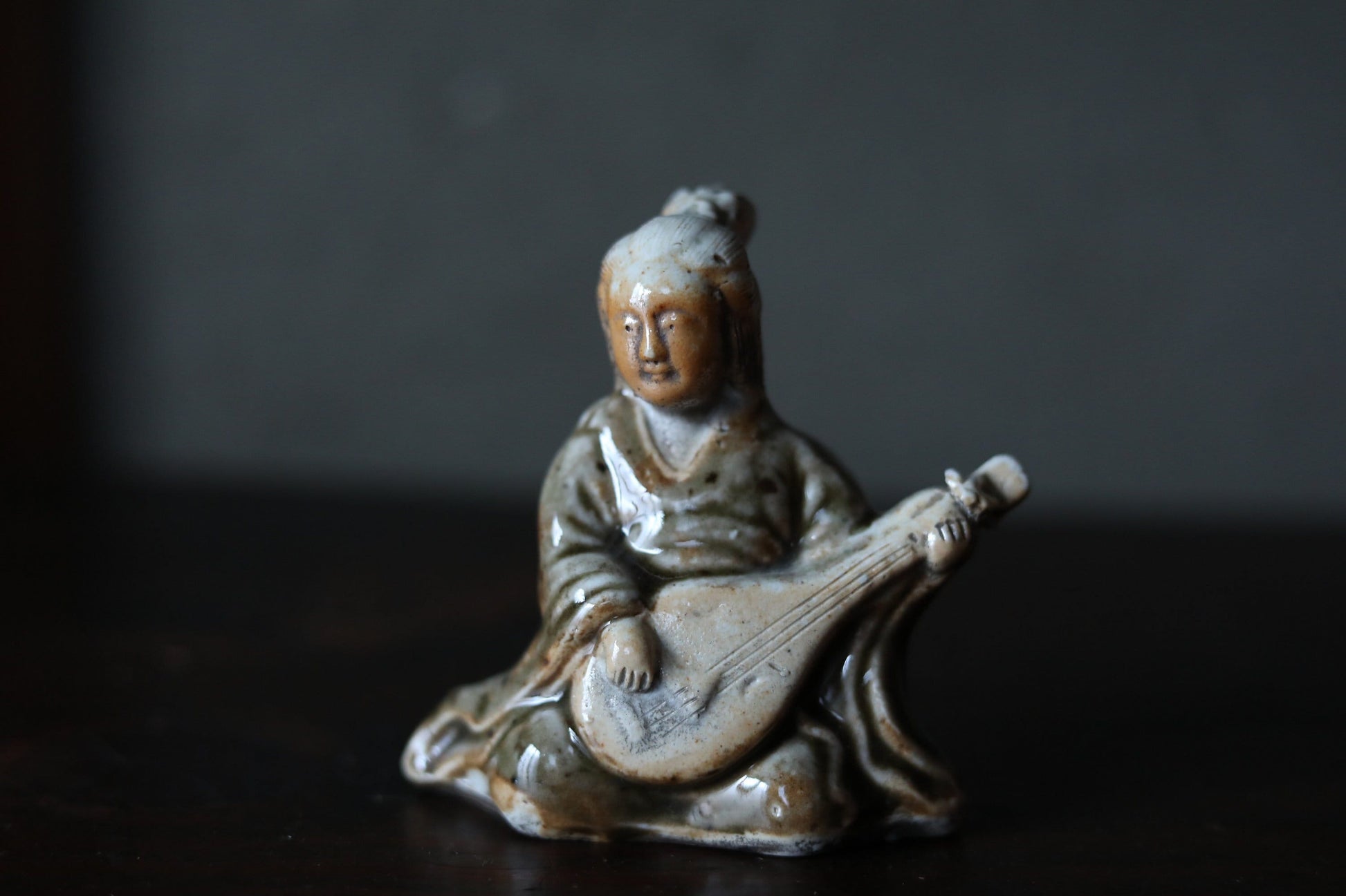 Japanese Antique ceramic doll small Figurine of Japanese lucky god 弁天benten ,Kimono Woman playing the biwa lute 1880s H4.1×3.7in/10.5×9.5cm