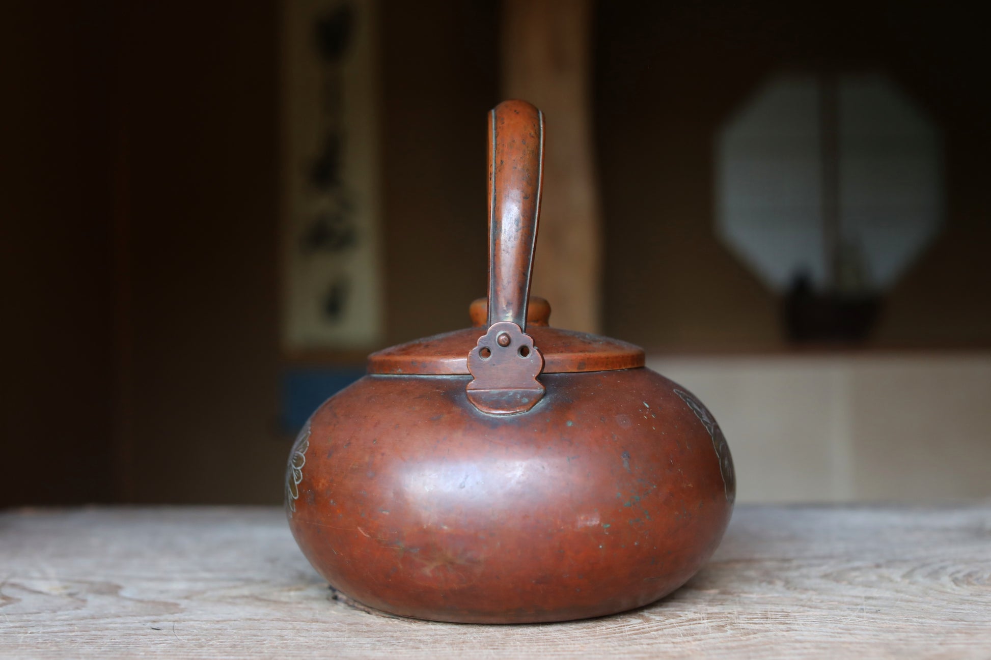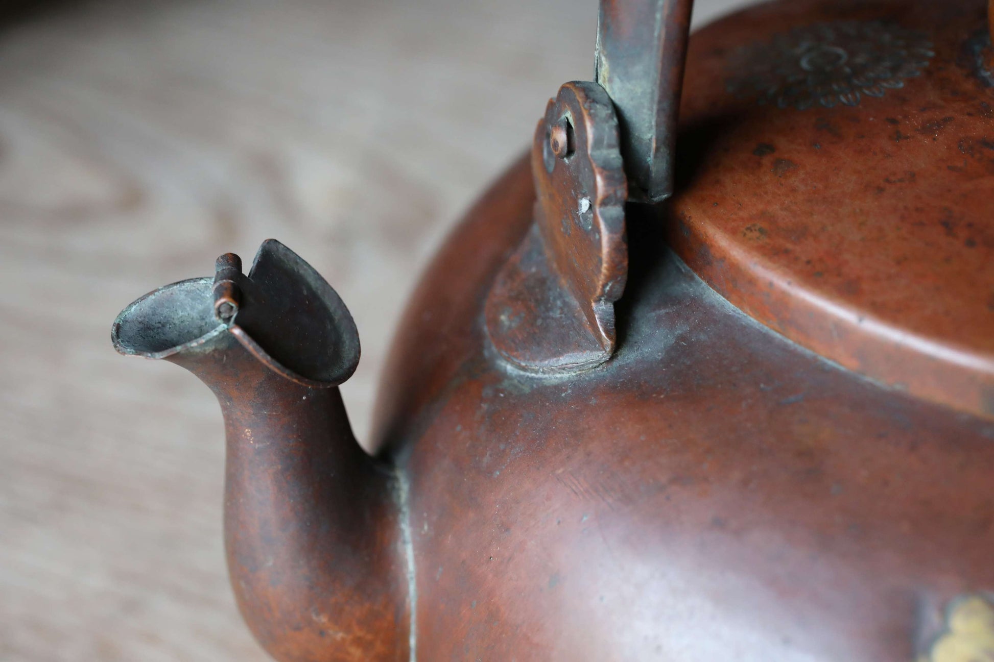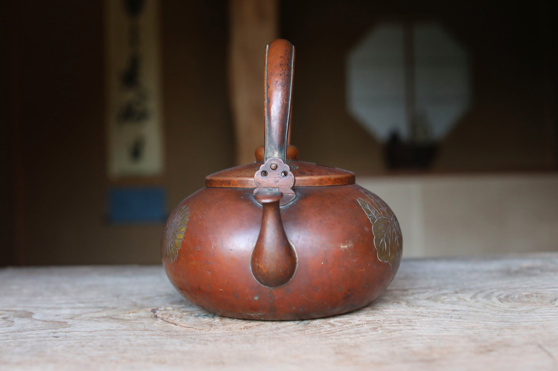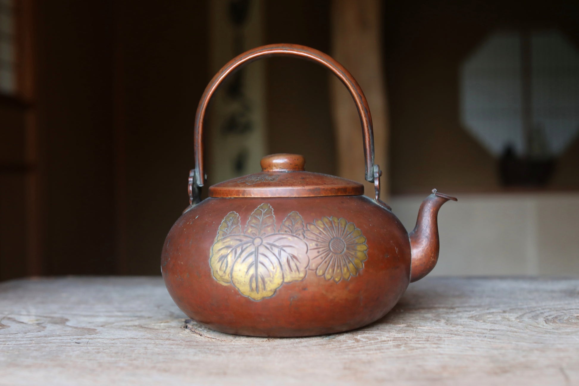 LARGE Japanese antique copper kettle tea pot chrysanthemum, paulownia hand metal craft kitchen ware tea pot, tea ceremony W10.2in/W26cm