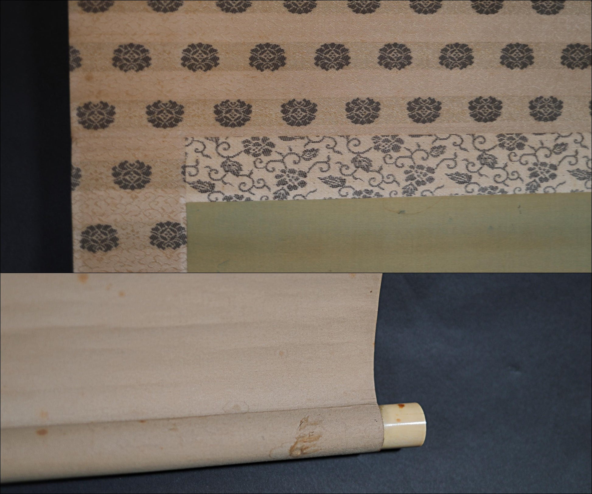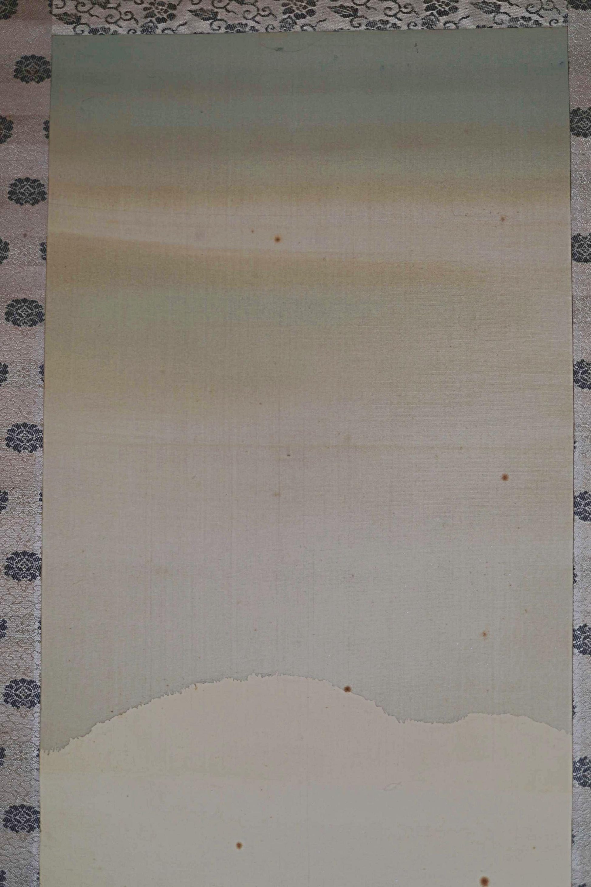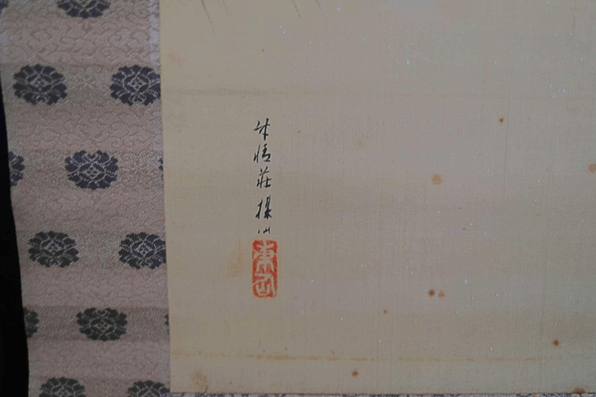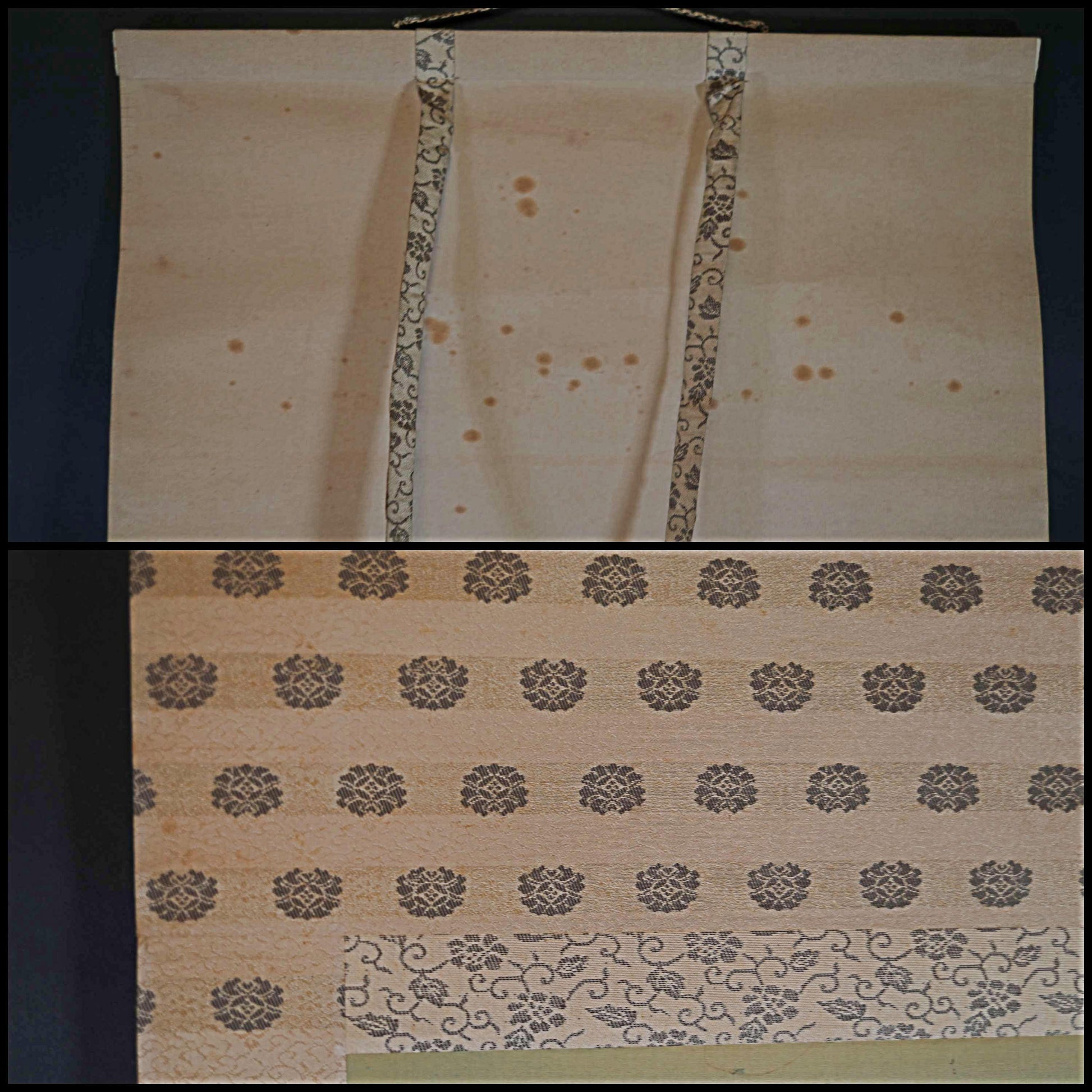 The name and stamp of the painter is on the left bottom. There are stains and spots on all over the scroll.
