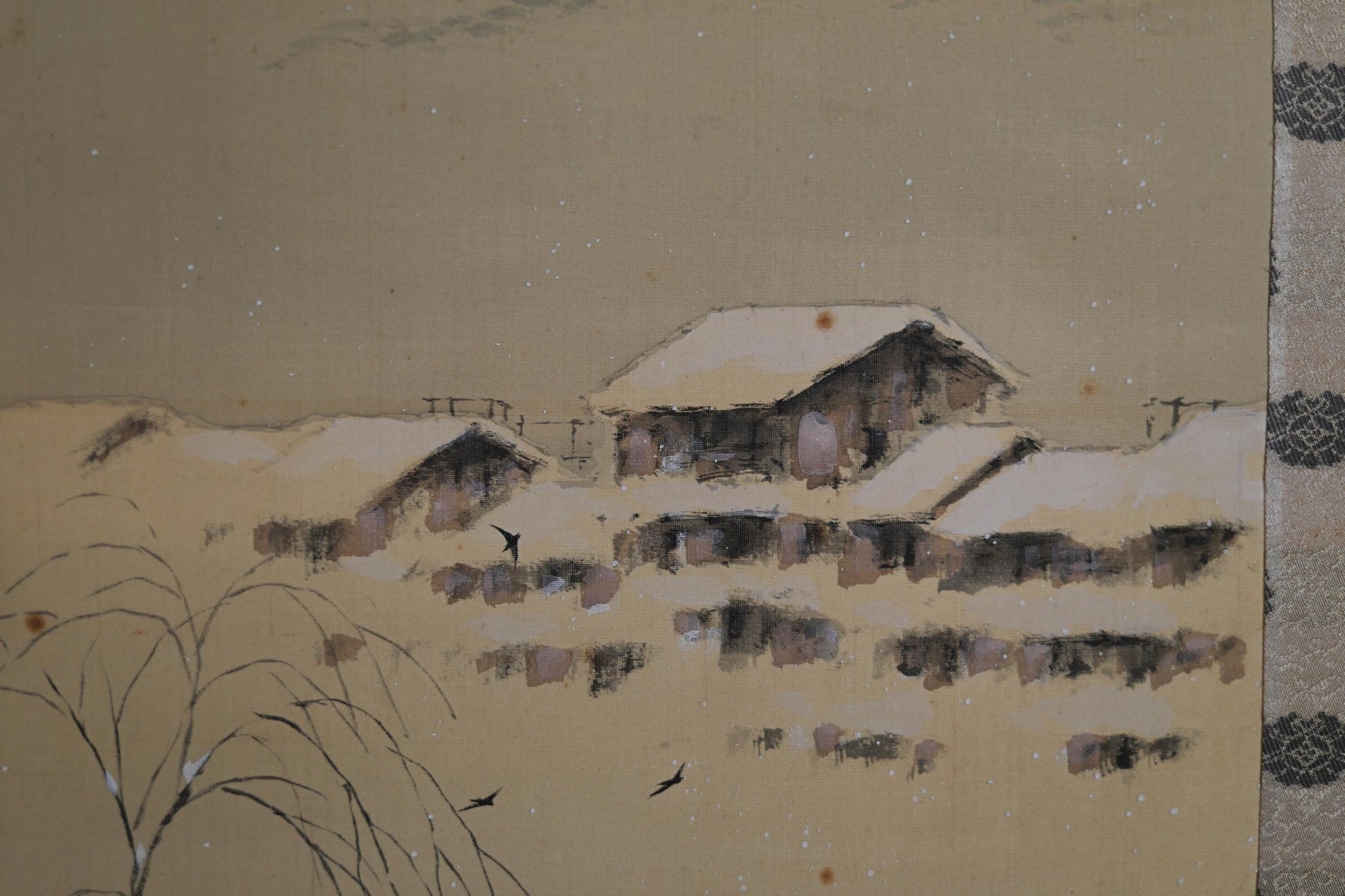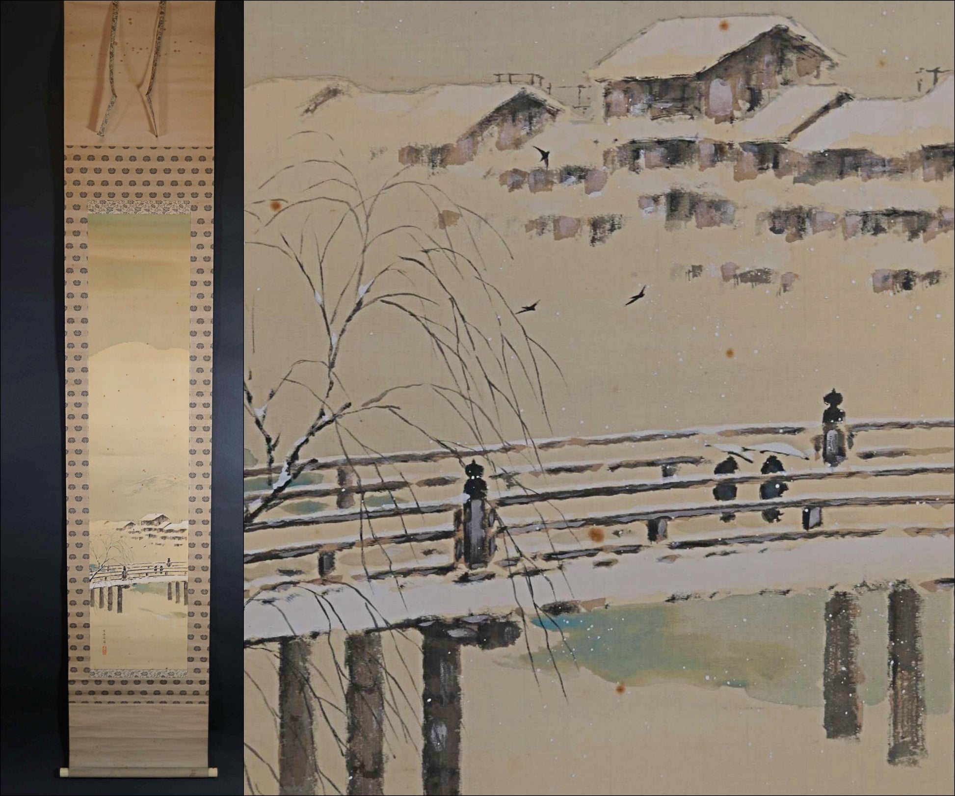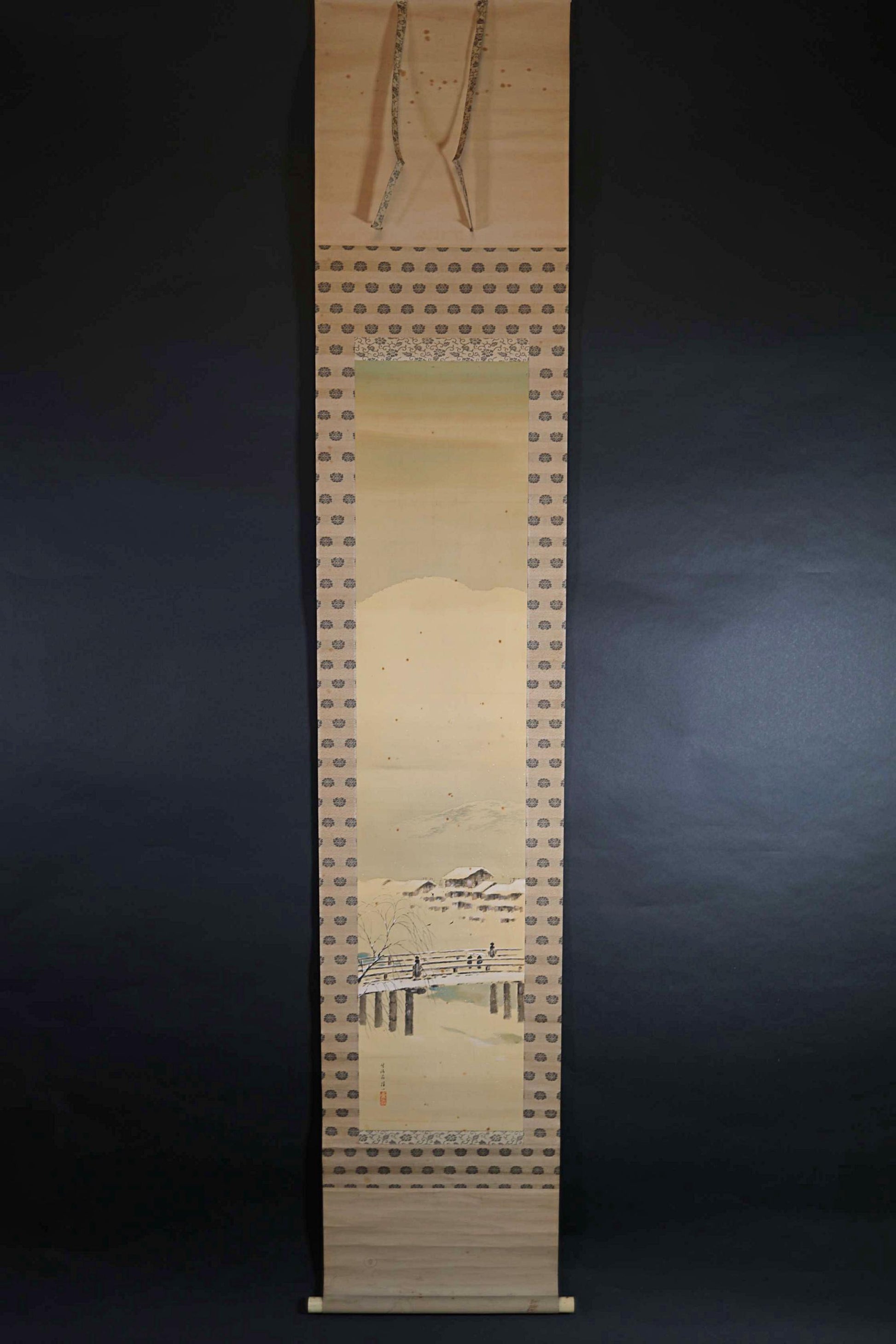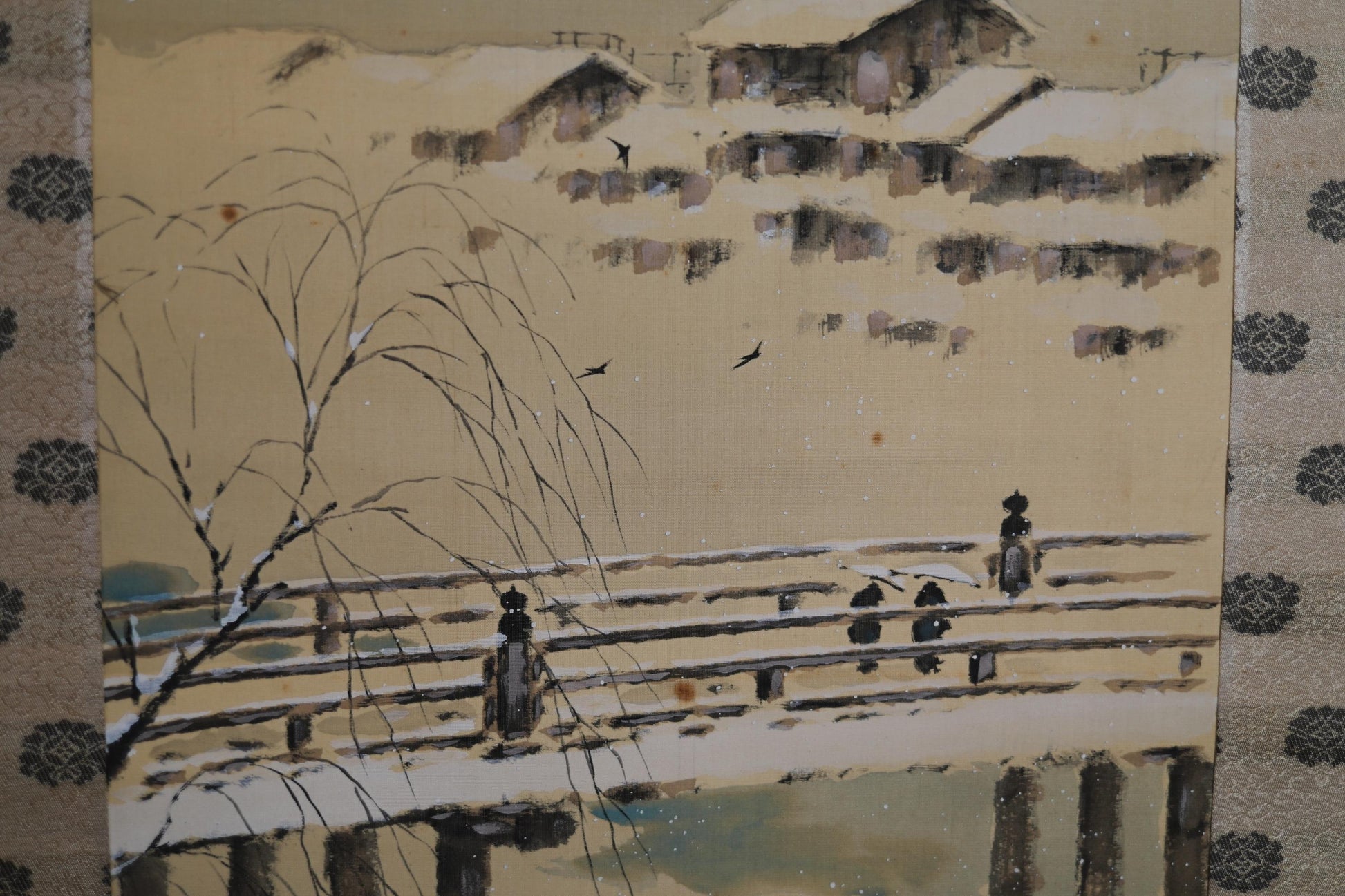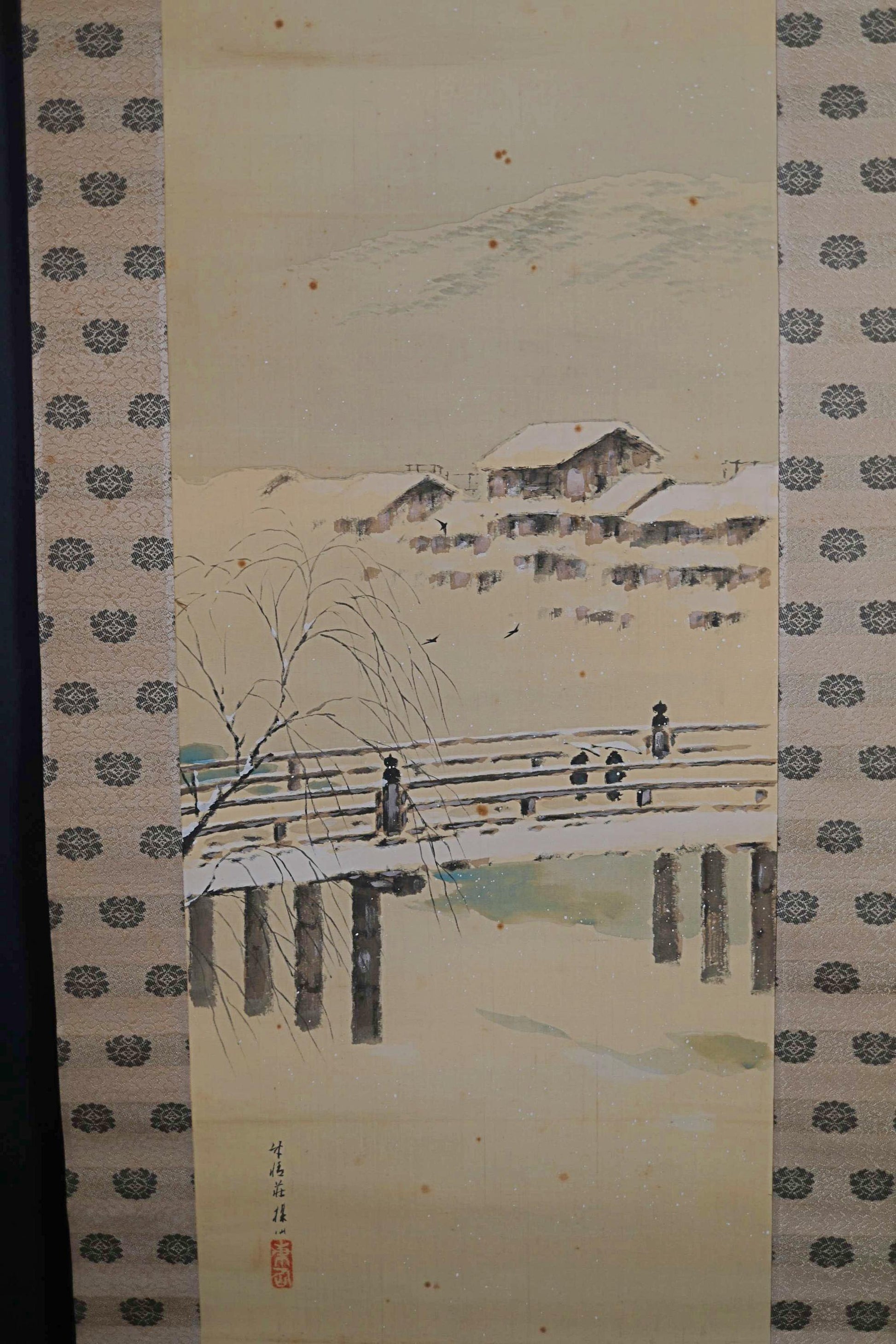 Japanese antique hanging scroll of water color painting, Kyoto Kamogawa in snow, with signature, early 1900s H78.3×14.6in / H199x37cm