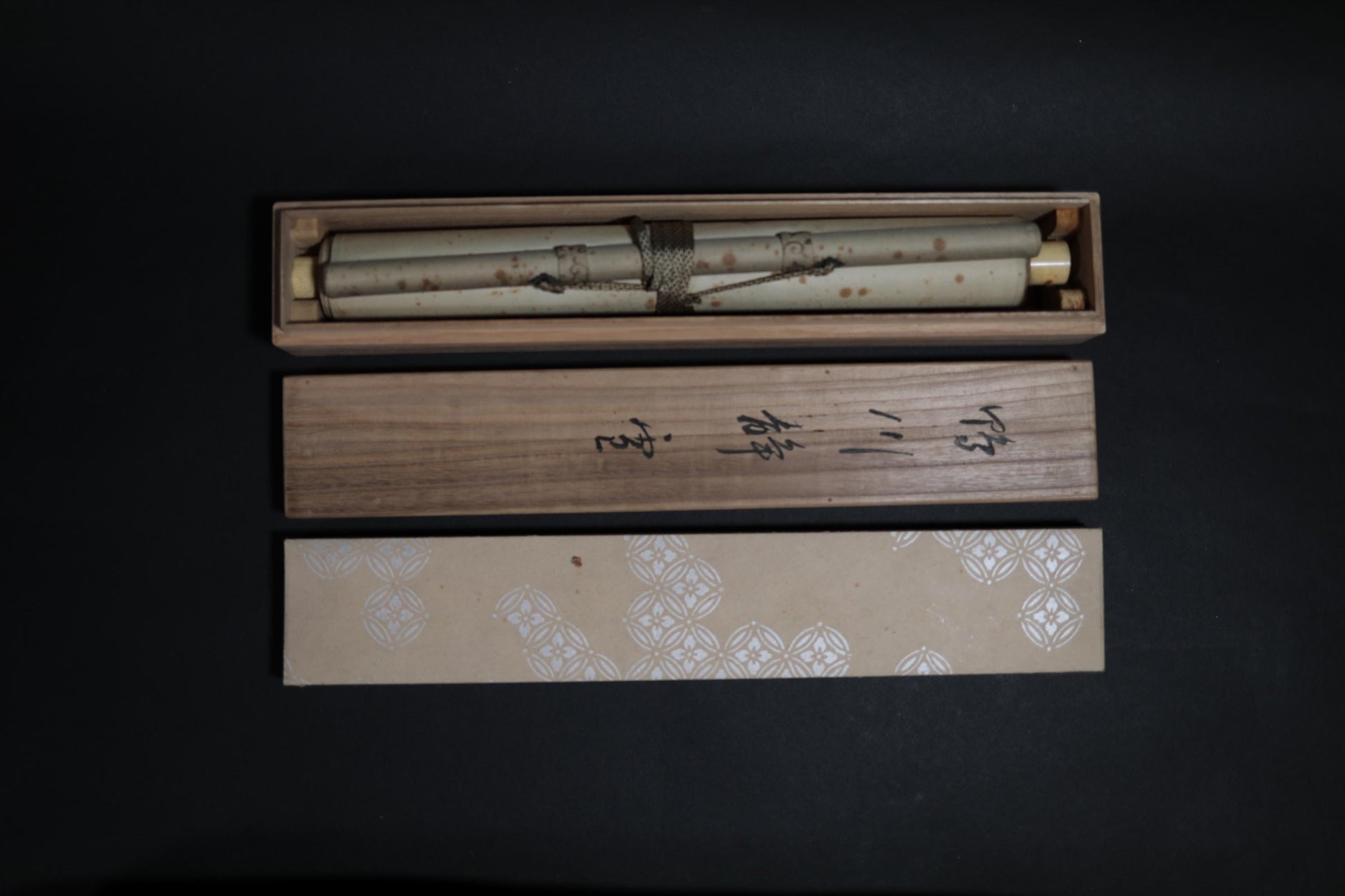 This hanging scroll has a Japanese water color painting for river side of Kamogawa in Kyoto. The painter named "平井楳仙 Hirai Baisen" born in 1889, set his view point in Kawabata street just along Kamogawa river looking the left bank. In his time, the street across from Kawabata street was crowded with three- and four-story wooden buildings, each housing numerous restaurants and bars. Wooden buildings are now a rarity, but this painting provides a vivid glimpse into the past. Even though there is no wooden bridge left there, mountains are exactly as they were. It looks cold and lonely with all the snow, but it makes people excited thinking about the warm food and people on the other side of the bridge.