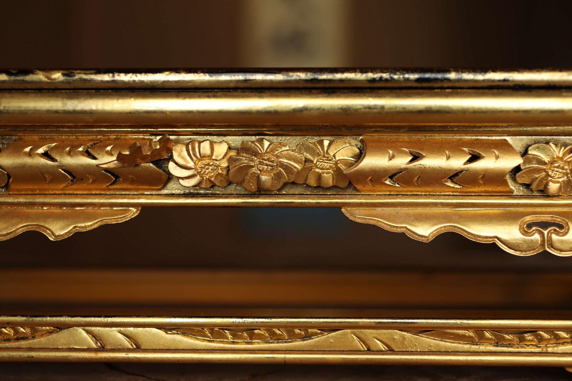 The shape is very beautiful and delicate. The realistic gold leaf is also beautiful. The tabletop has some scratches and stains from years of use.
