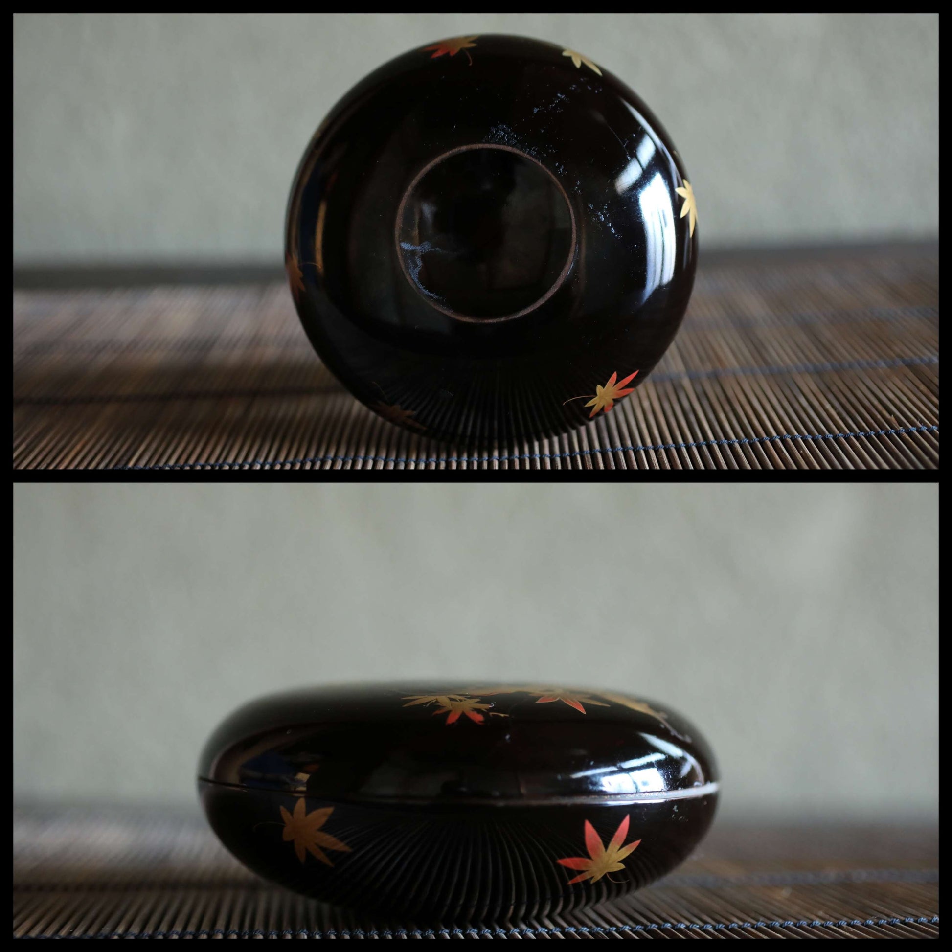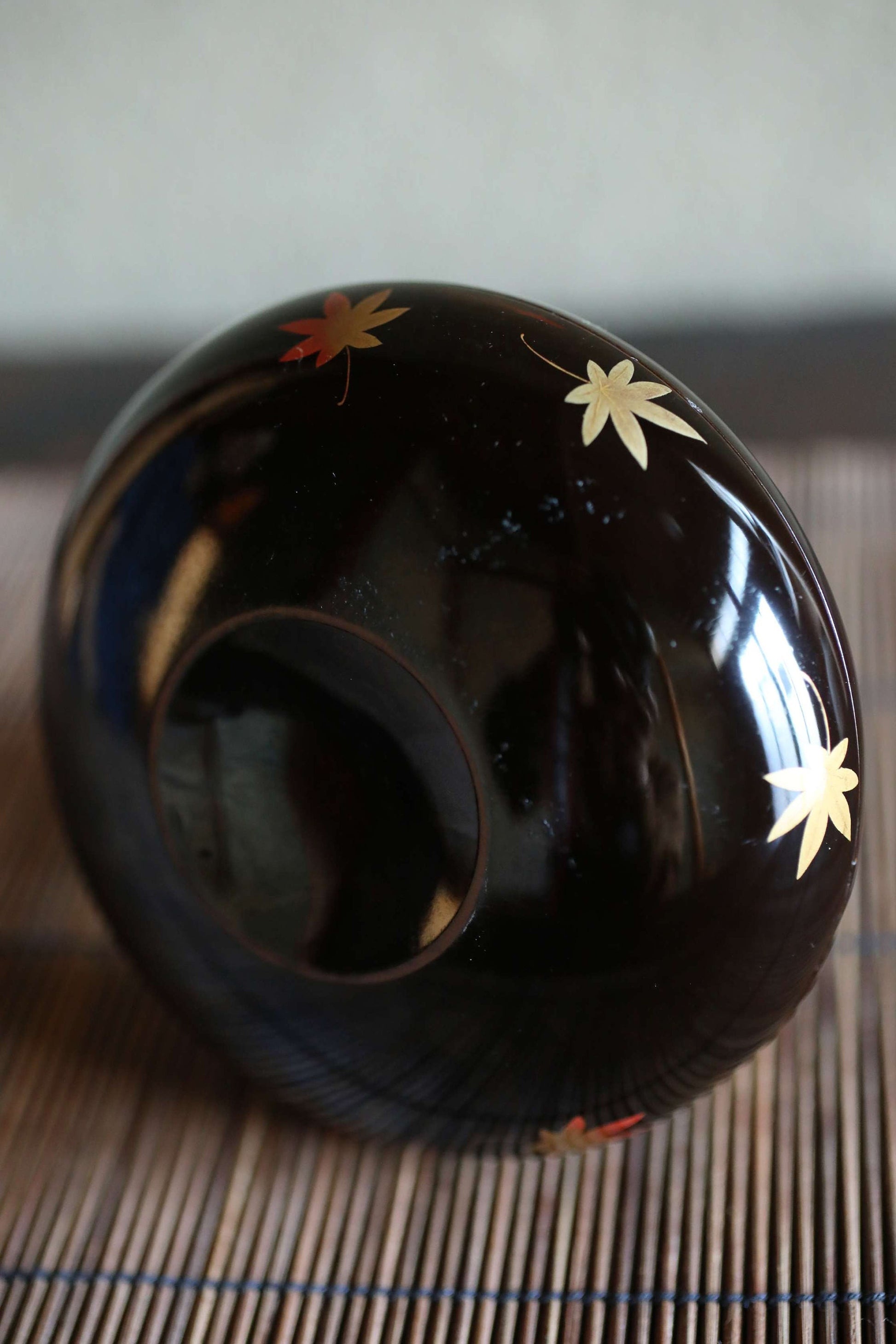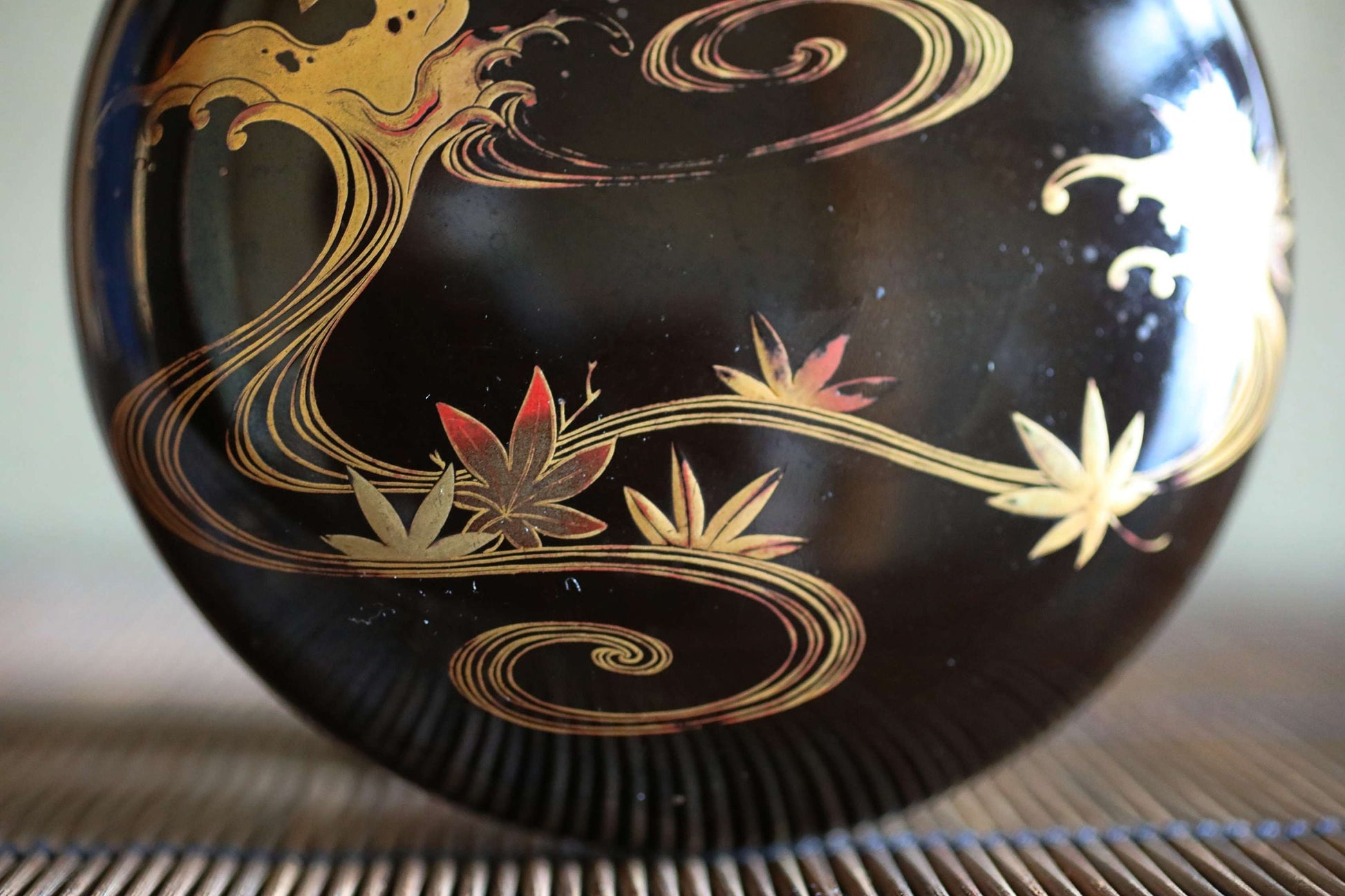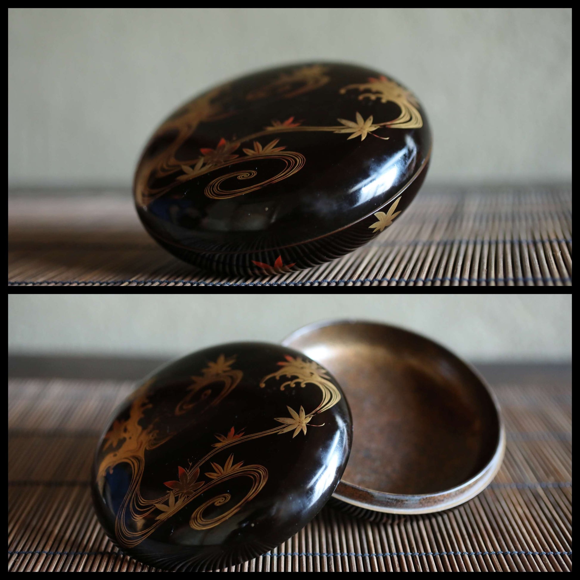Japanese antique MAKIE fine lacquer incense holder with Rimpa's gold paintings of maple leaves and water, H1.9 x W 4.5in