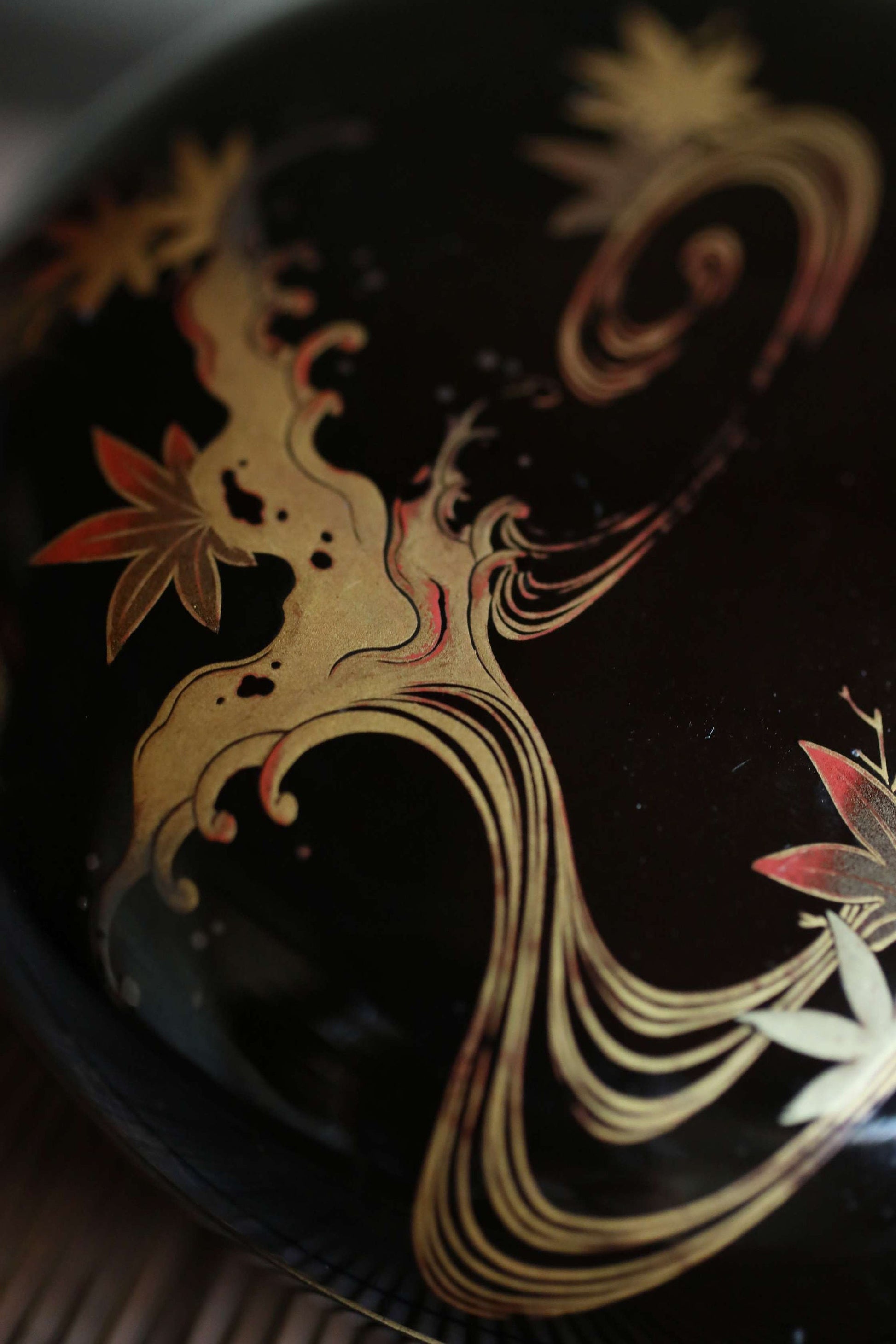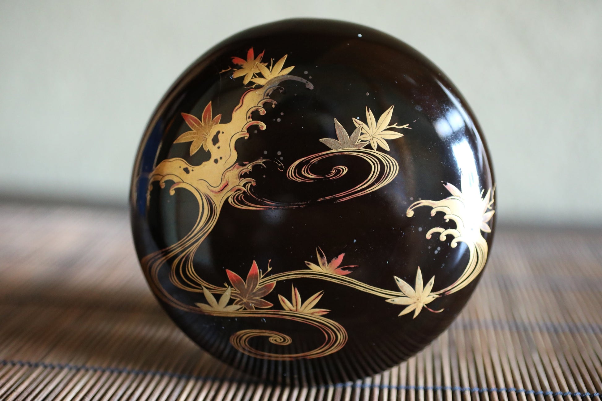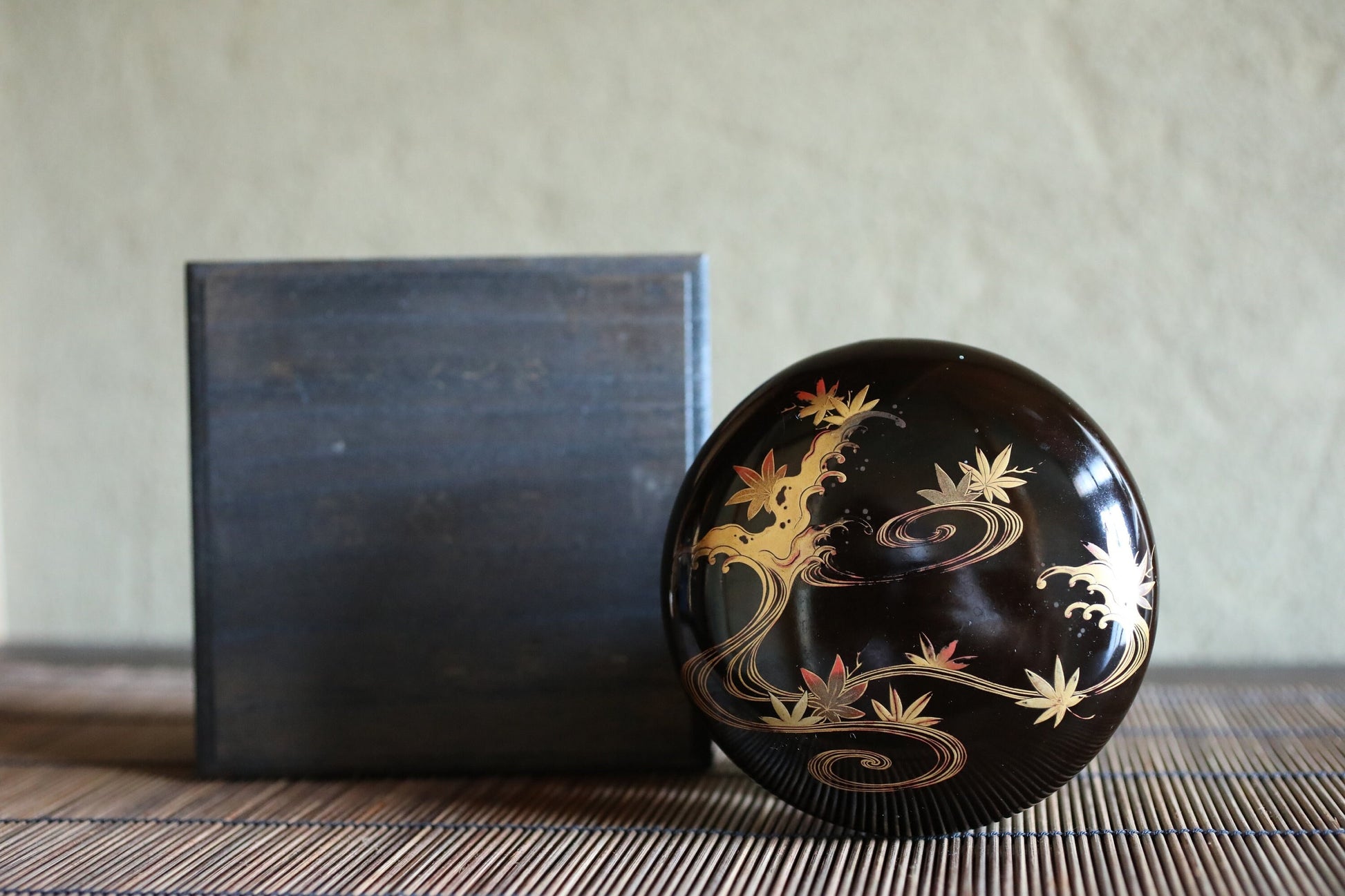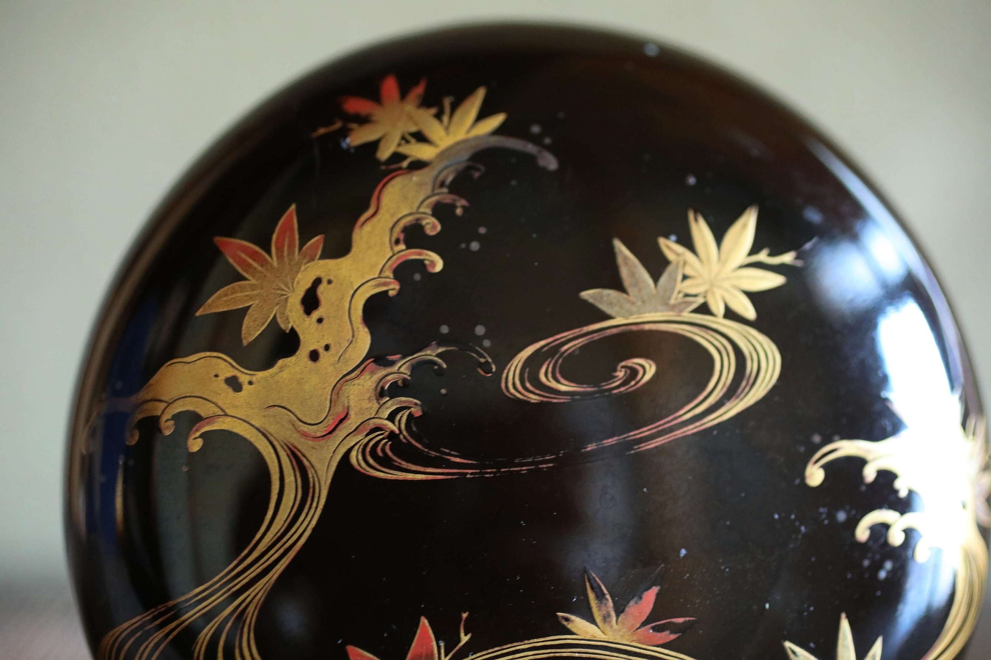 Japanese antique MAKIE fine lacquer incense holder with Rimpa's gold paintings of maple leaves and water, H1.9 x W 4.5in