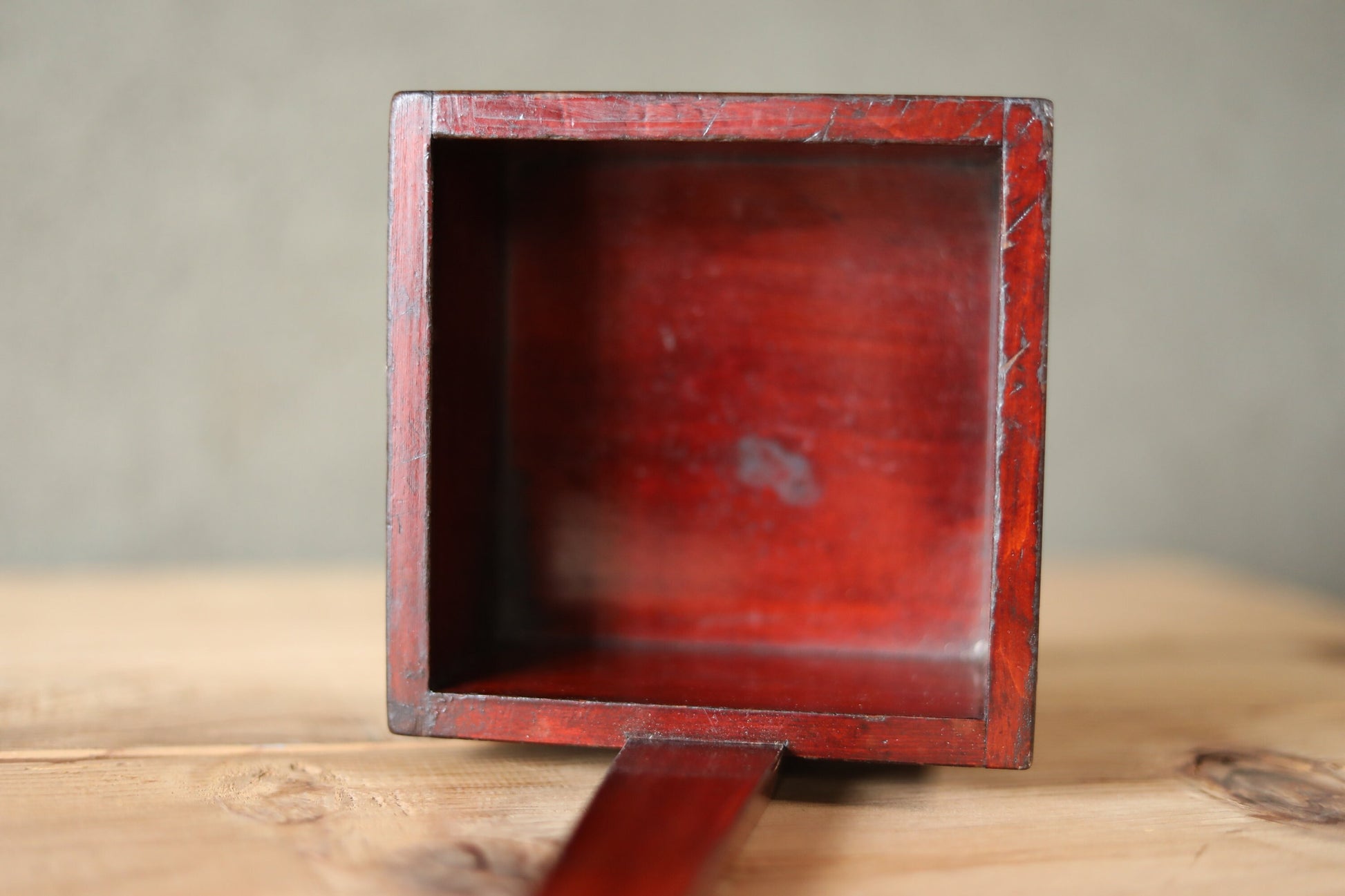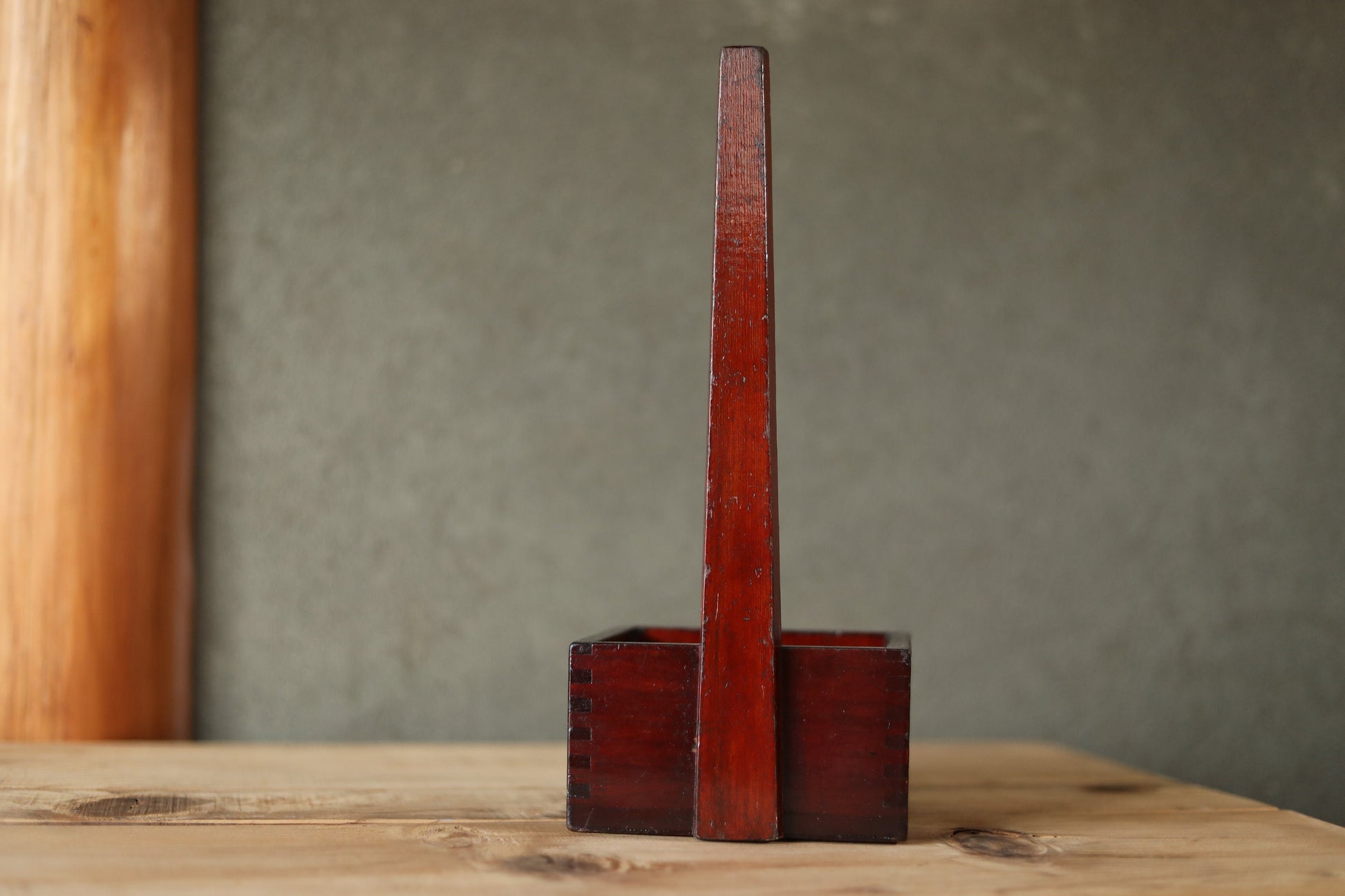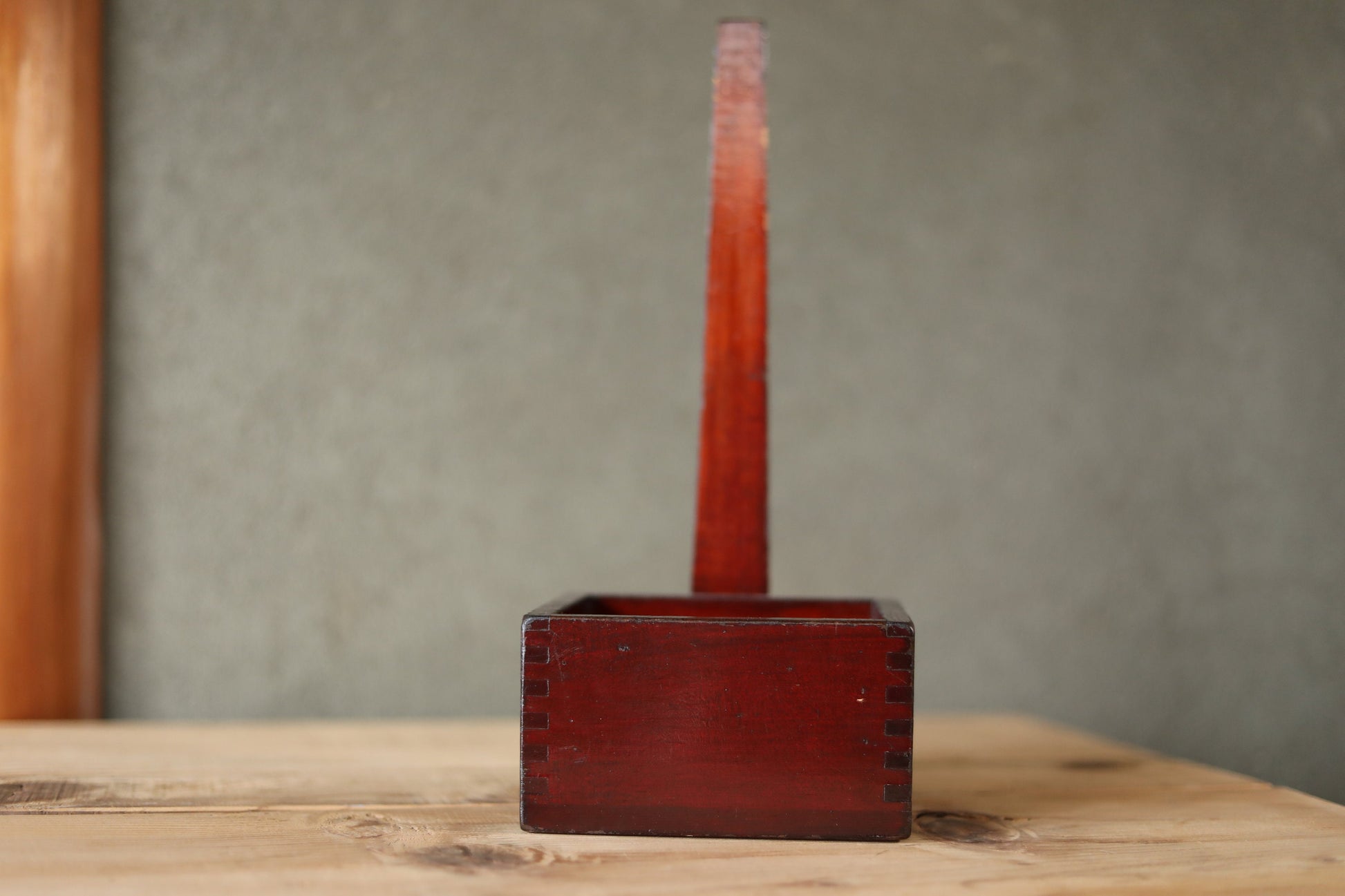 Japanese antique measuring box urushi Lacquer"枡MASU" with a handle ,sake ladle wood Kanji calligraphy 1920s H12.8×5.5in/H32.5×14cm.