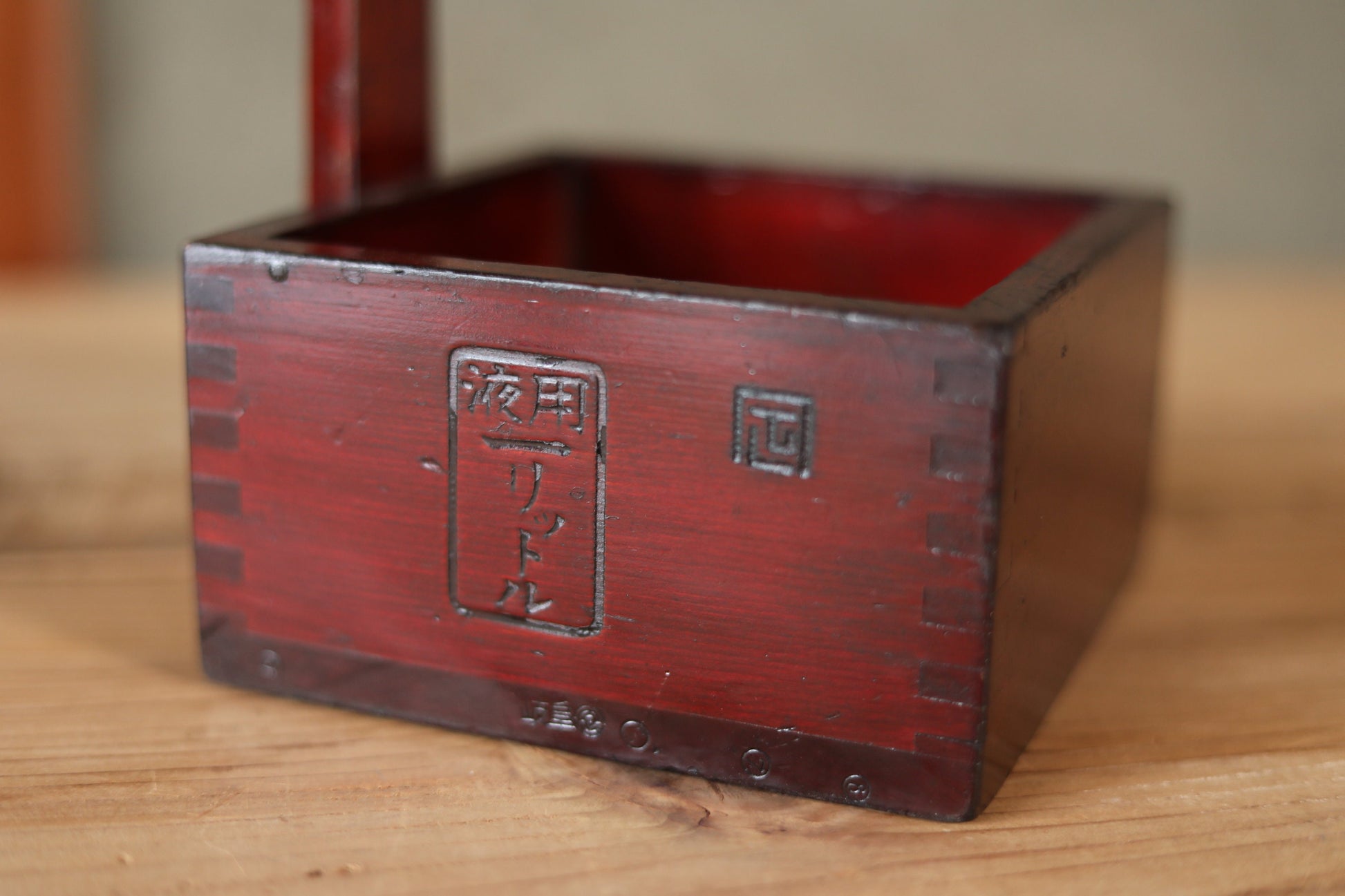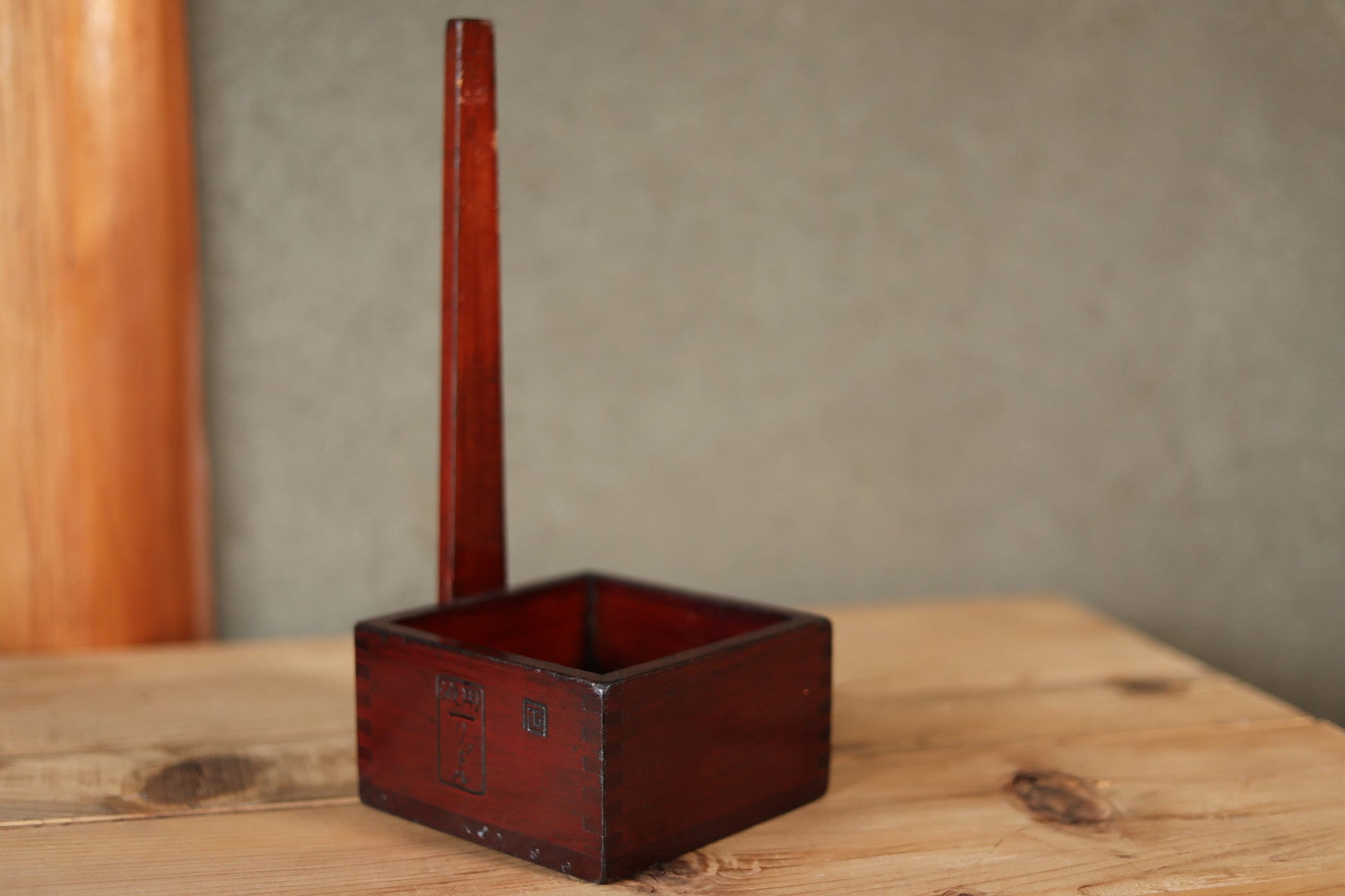 Japanese antique measuring box urushi Lacquer"枡MASU" with a handle ,sake ladle wood Kanji calligraphy 1920s H12.8×5.5in/H32.5×14cm
