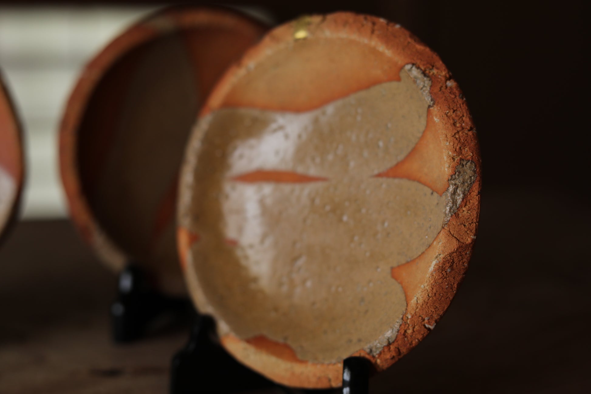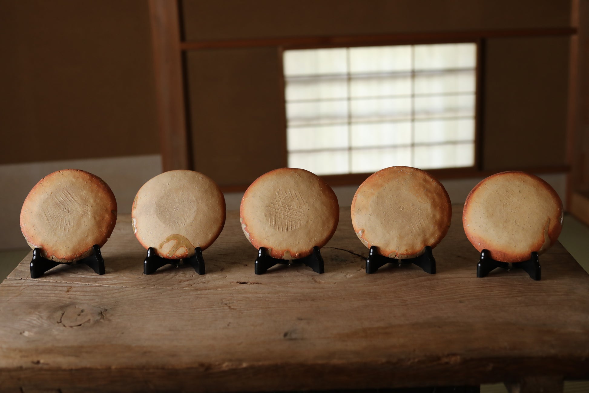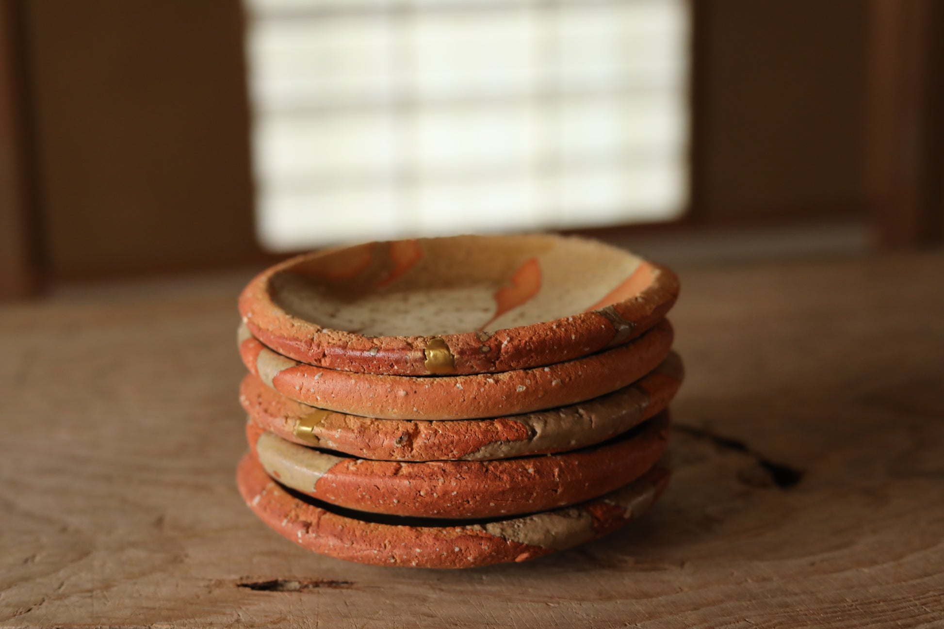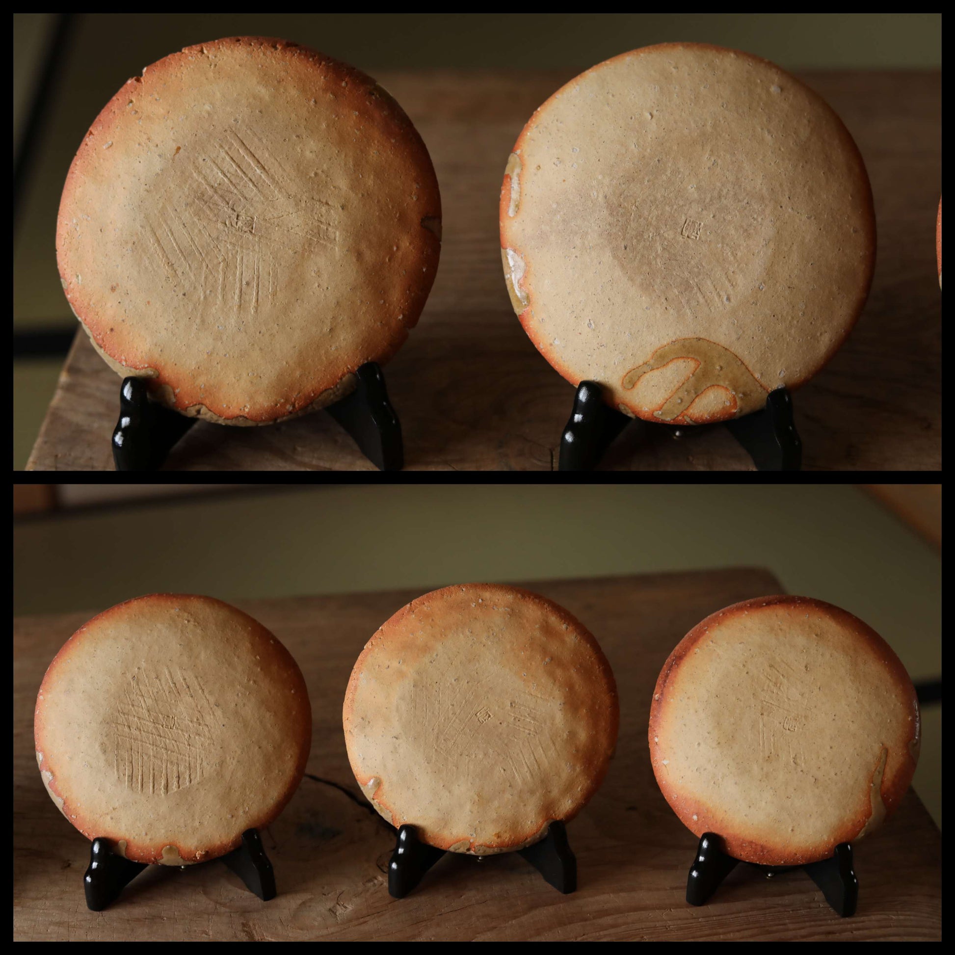 Works by a 信楽焼 Shigaraki-ware potter. Each of these five beautiful small plates is handmade, so the patterns, shapes, and hues vary slightly from piece to piece.