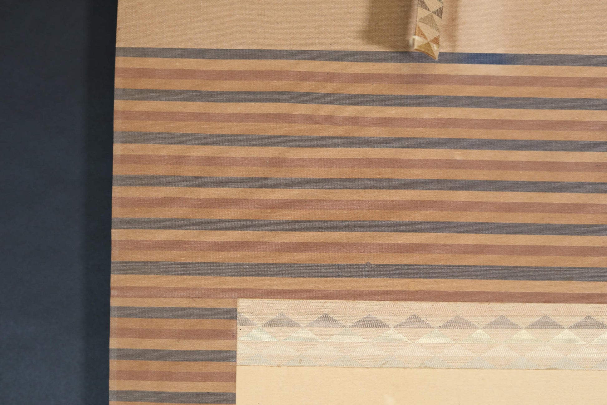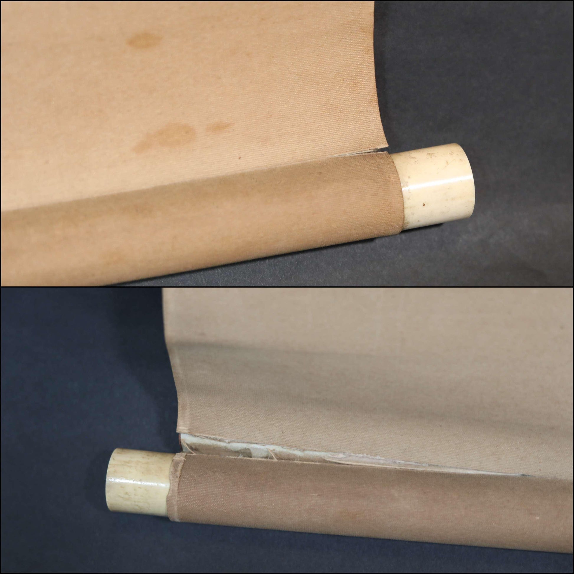 There are tears where the scroll rod meets the fabric, but the back has been reinforced. There are some stains and wrinkles as shown in pictures.