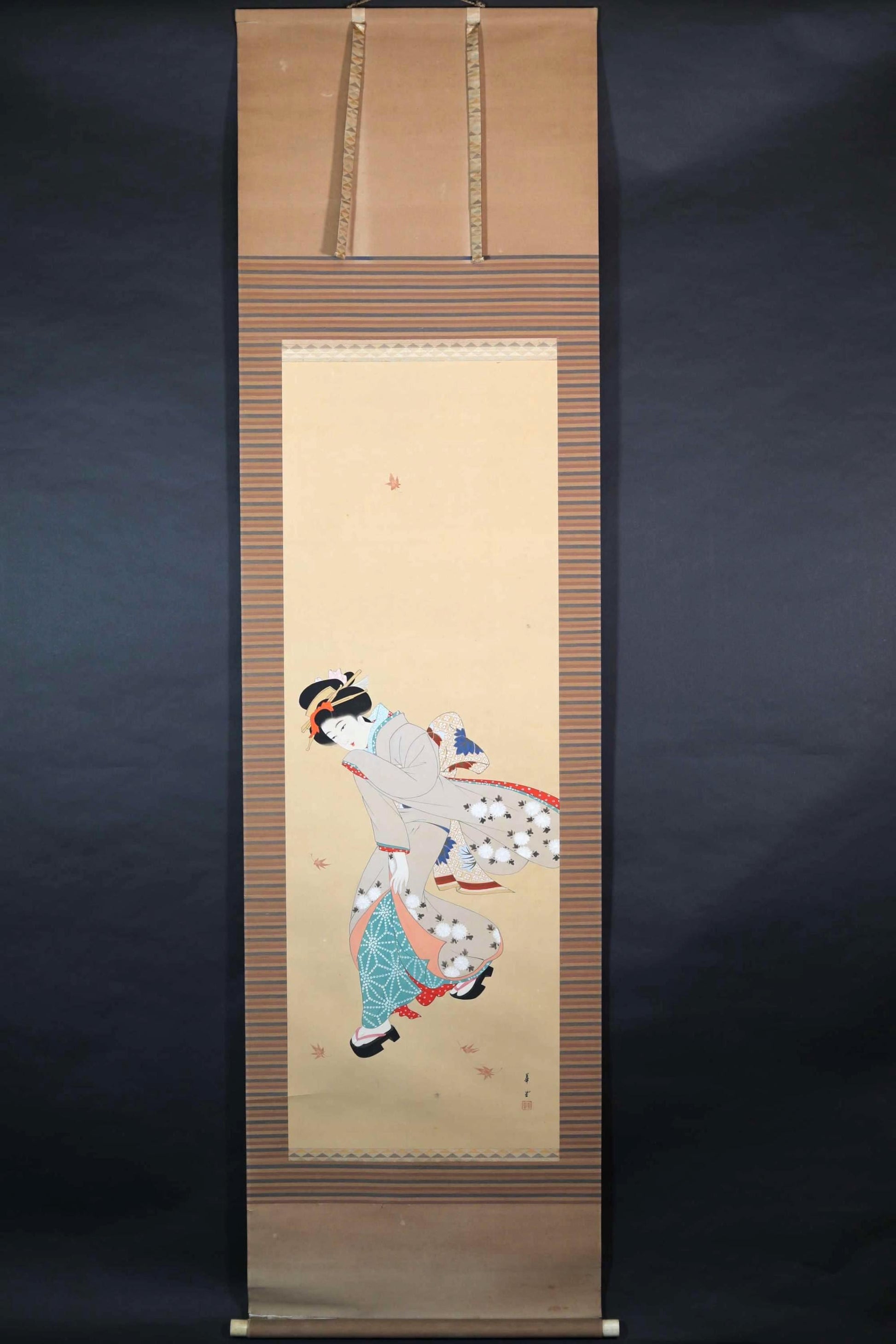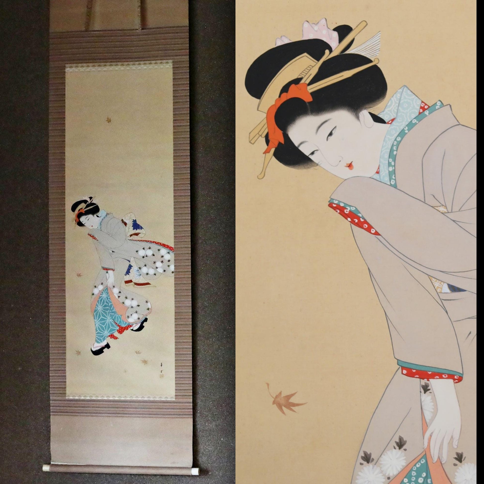 This one depicts a young woman in Kimono fluttering in the wind. Maple leaves are also swirling and chrysanthemum flowers are drawn on kimono, so it's likely autumn.