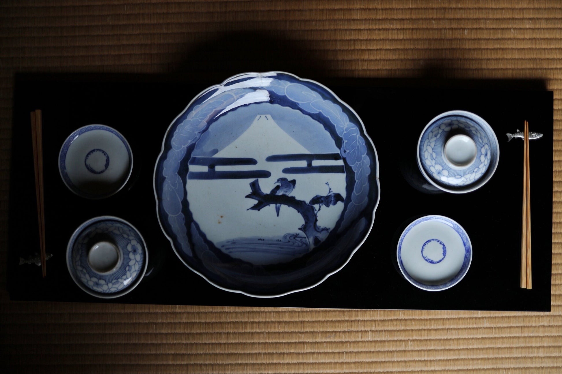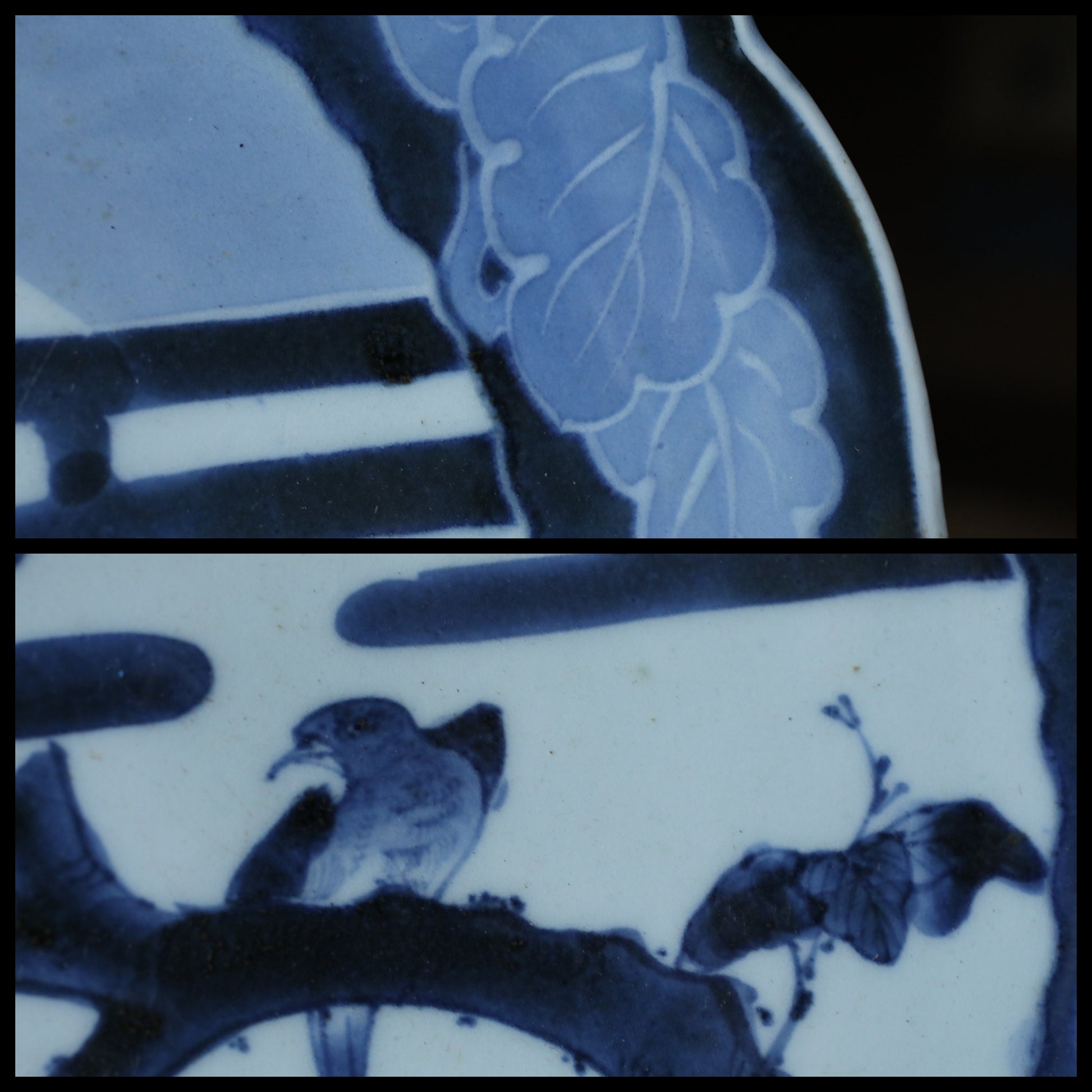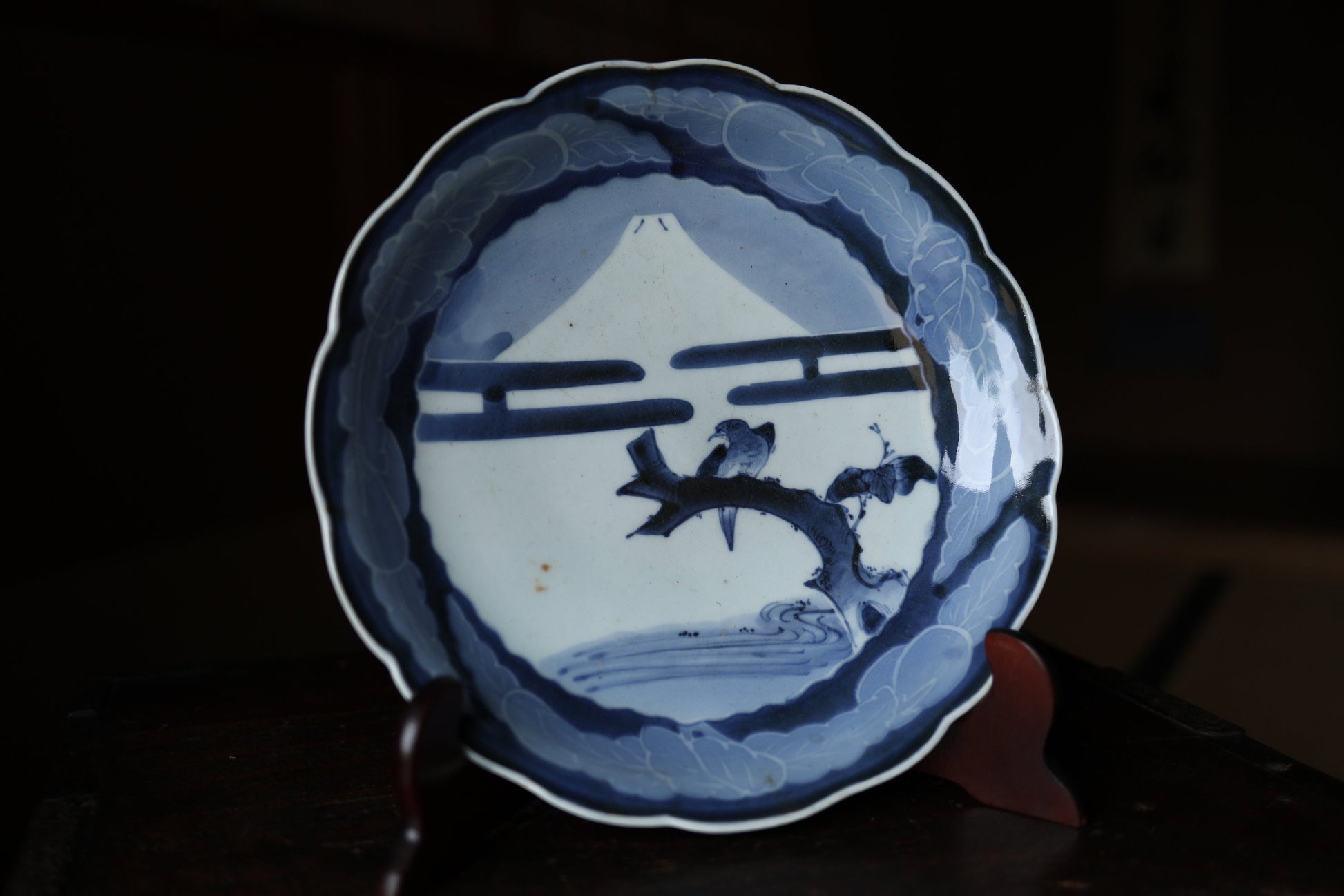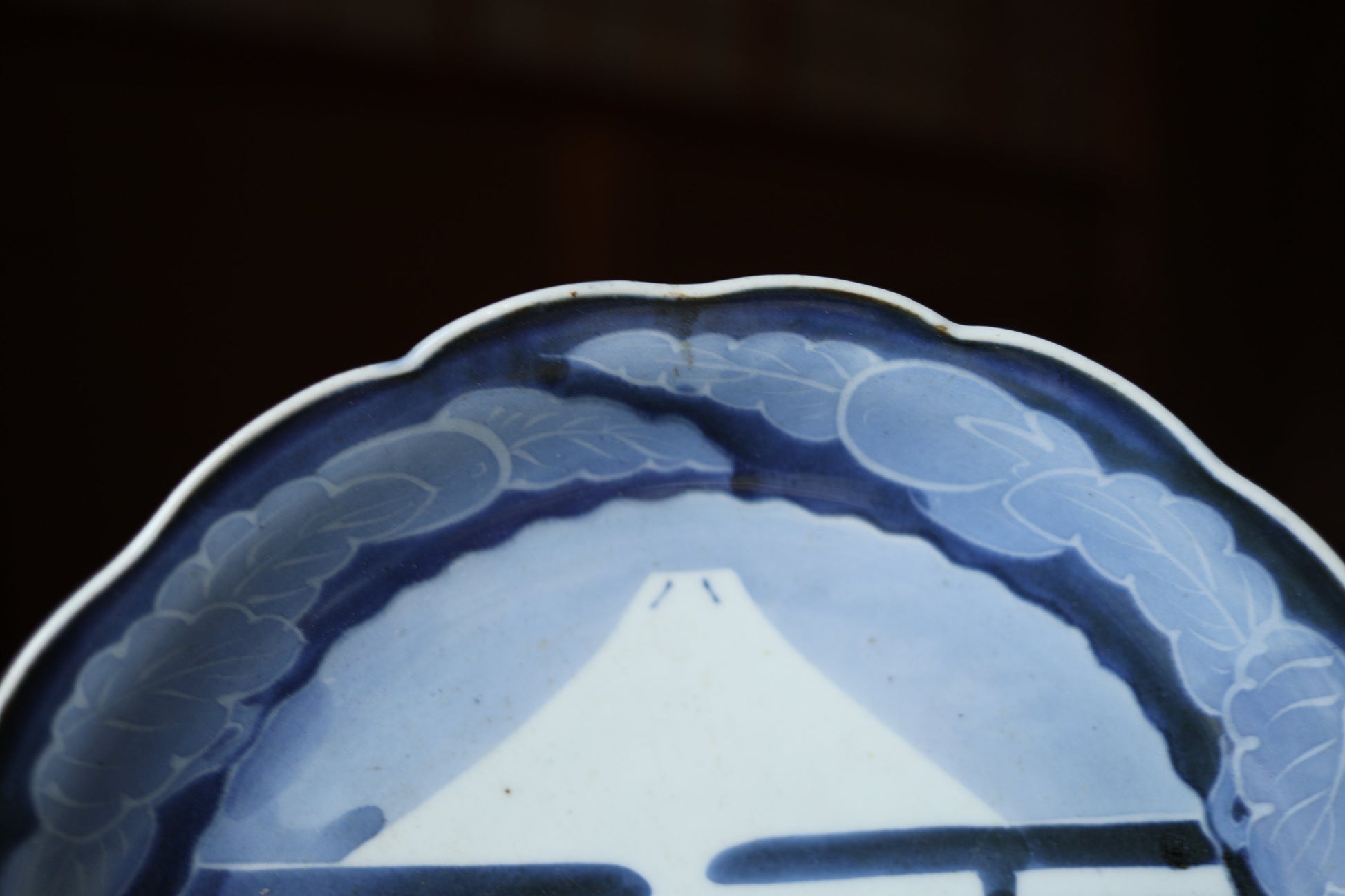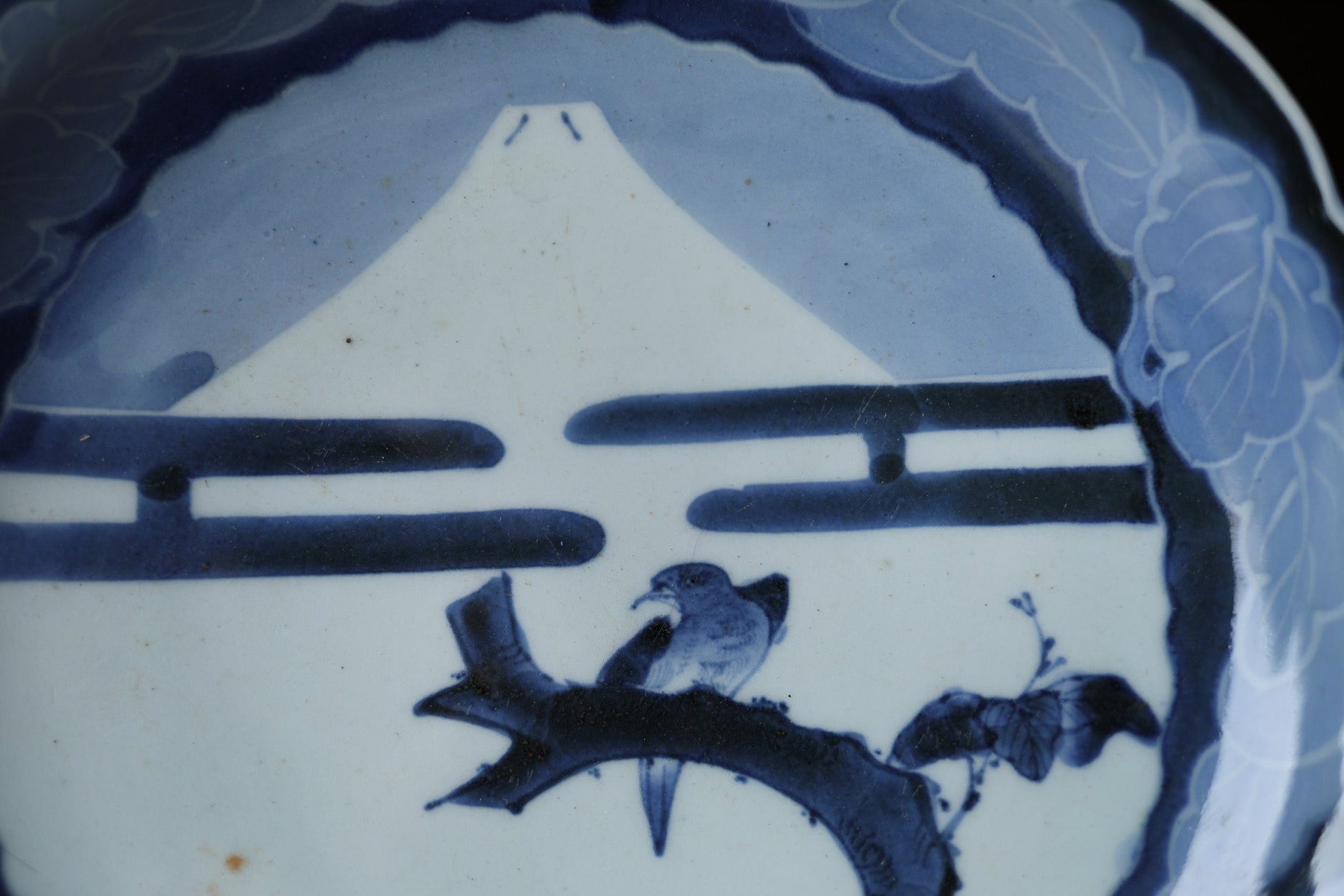 Japanese antique porcelain plate indigo Blue hand painting of Mt.Fuji and birds Authentic platter big dish KOIMARI edo 1800s 11.4in/29cm