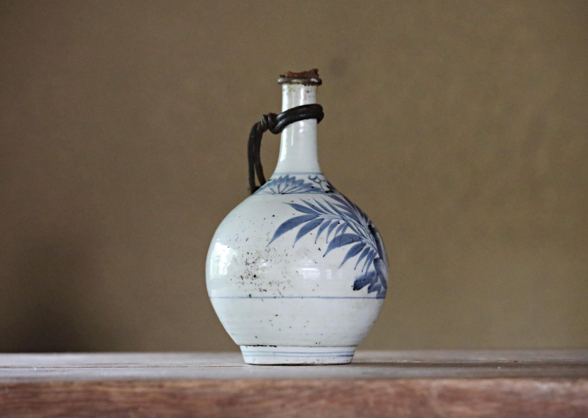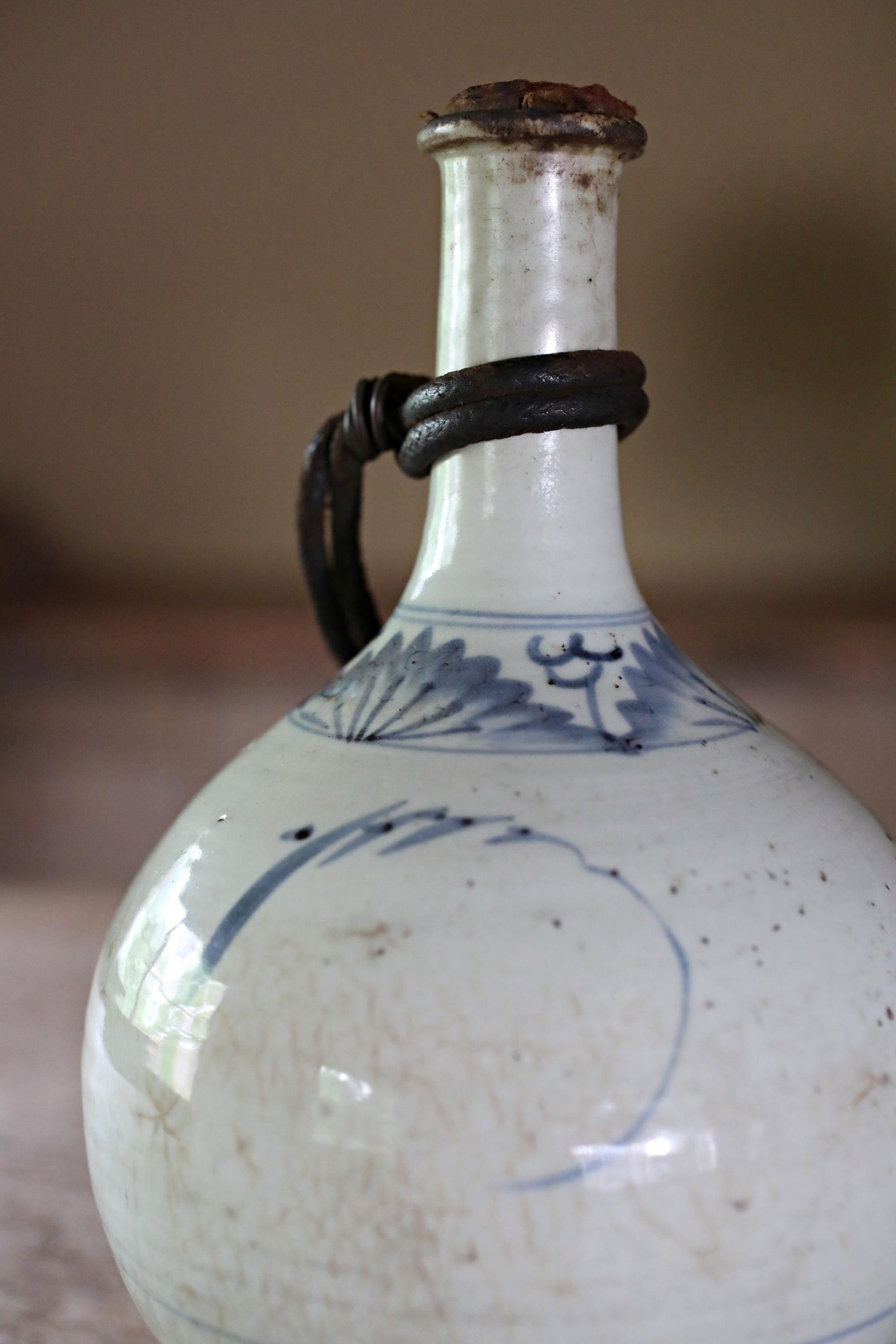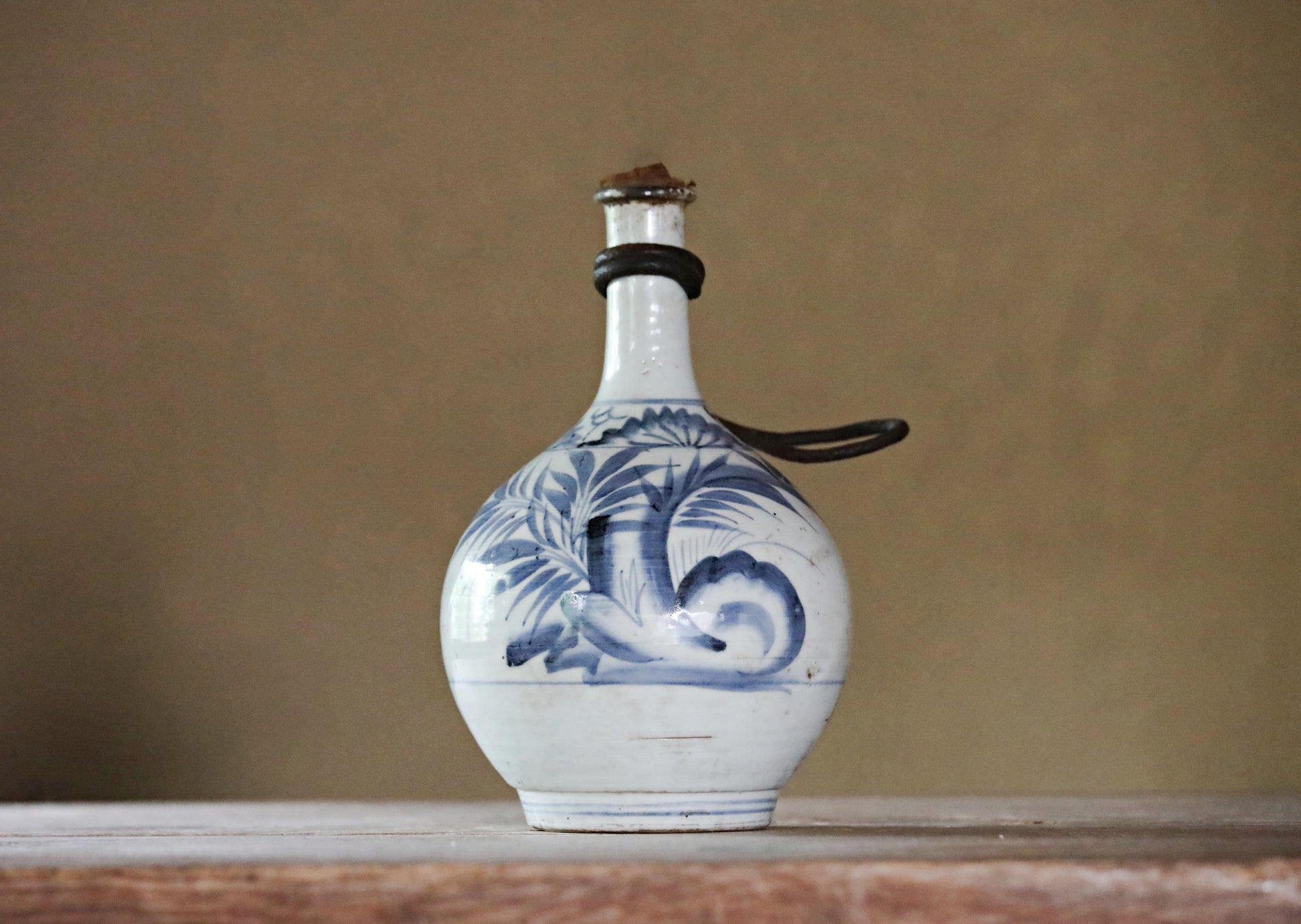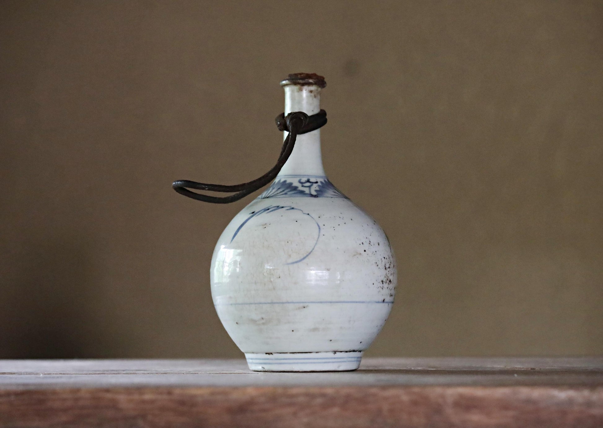 Many similar pieces were made until around the Taisho period (1912-1926), but the pale indigo color, overall glaze hue, and shape of this piece indicate that it is from the Edo period. The darker indigo seen in this tokuri is from a relatively newer period.