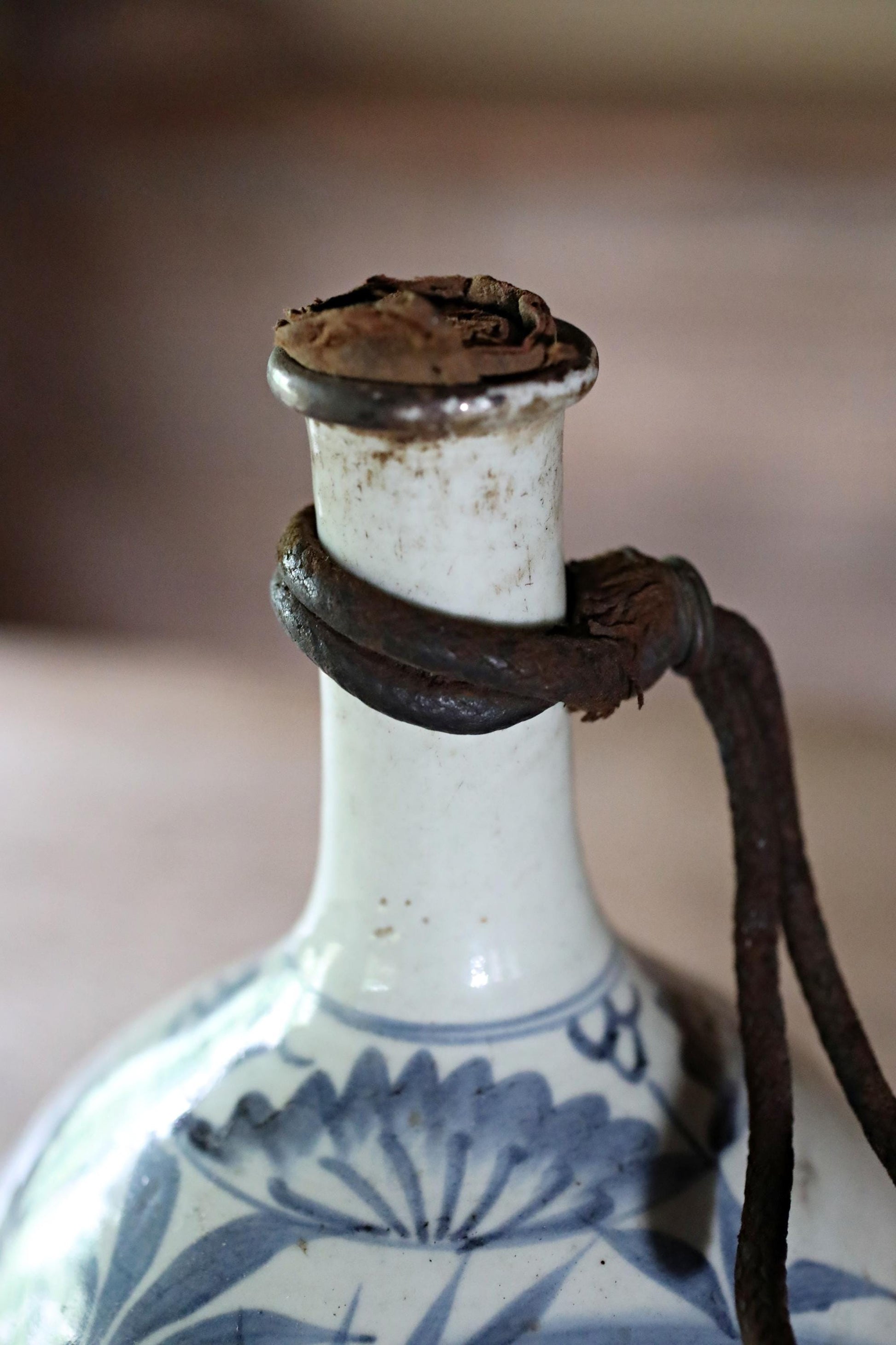 There are black spots where the glaze has not been applied in some places, which is peculiar to old pottery, and this is called “leaf warbler/ Mushi-kui” in Japan, and is loved as one of the interesting sights. There are scratches on the surface, but no major damage. What is unique is that the lid and leather strap are still intact.
