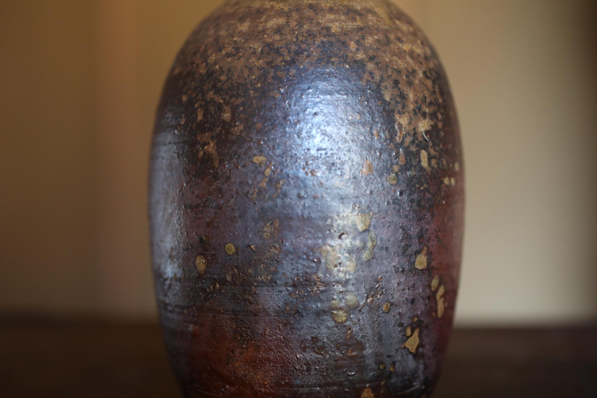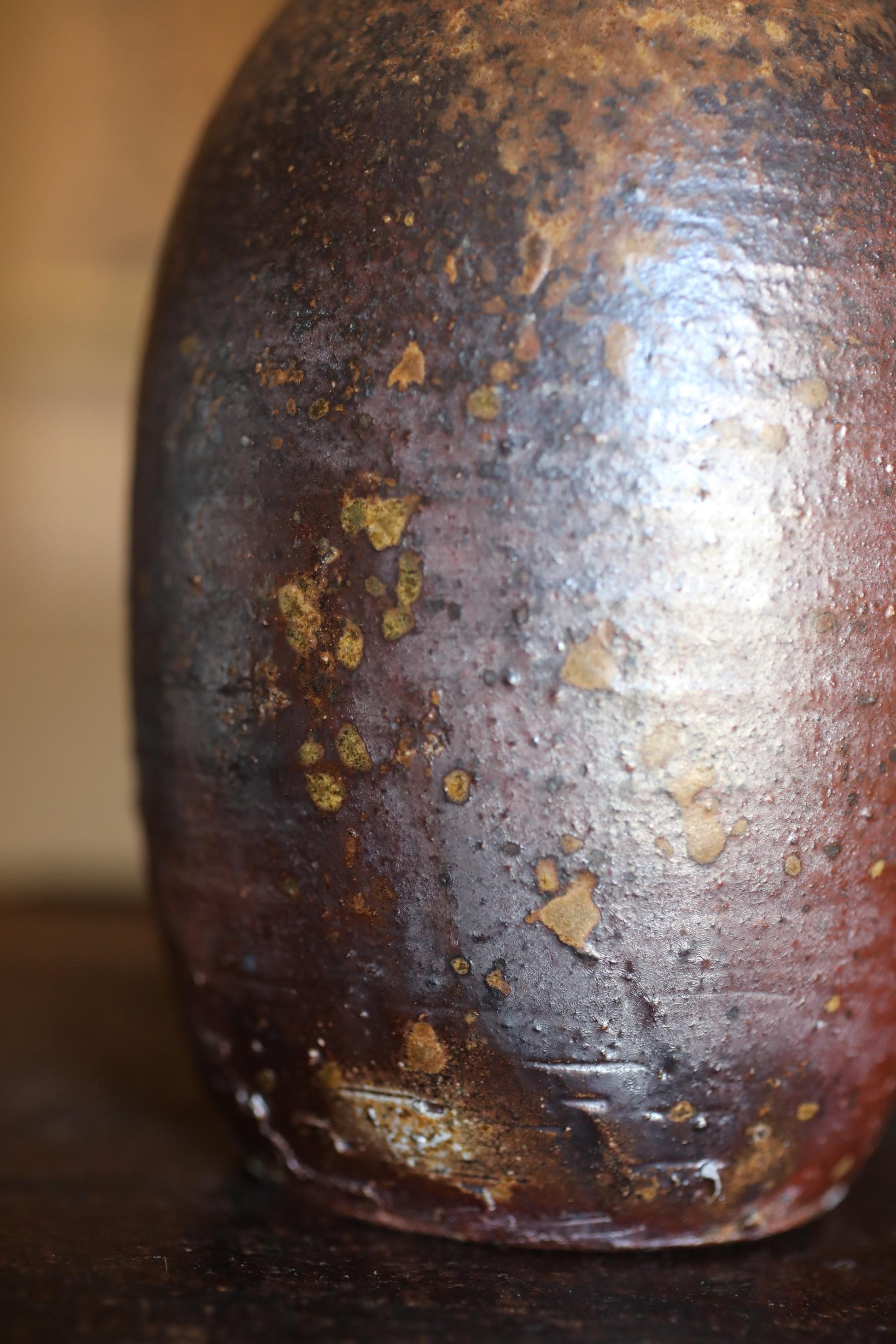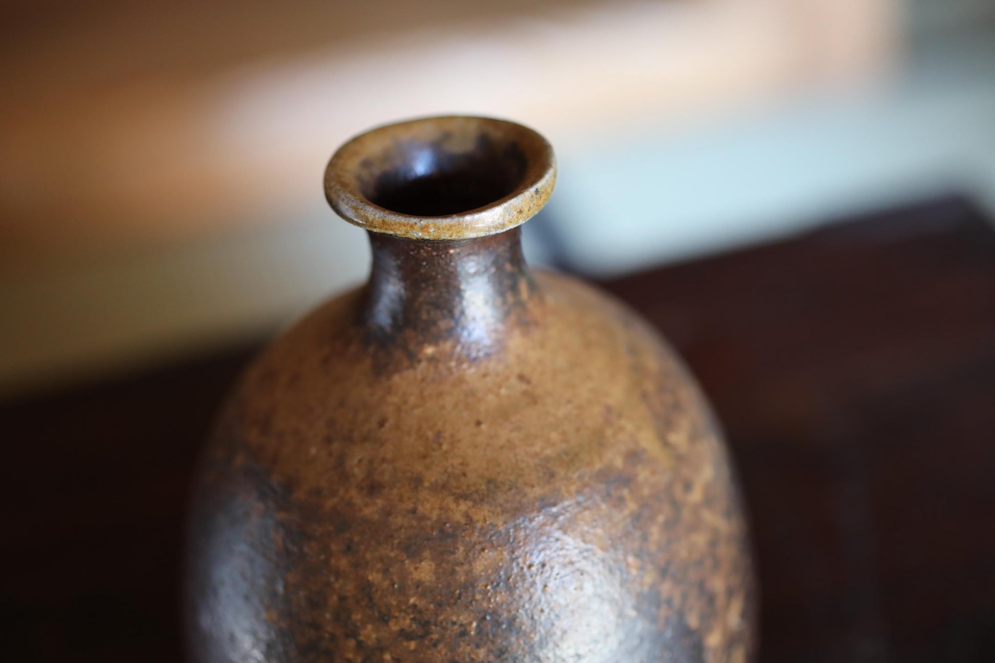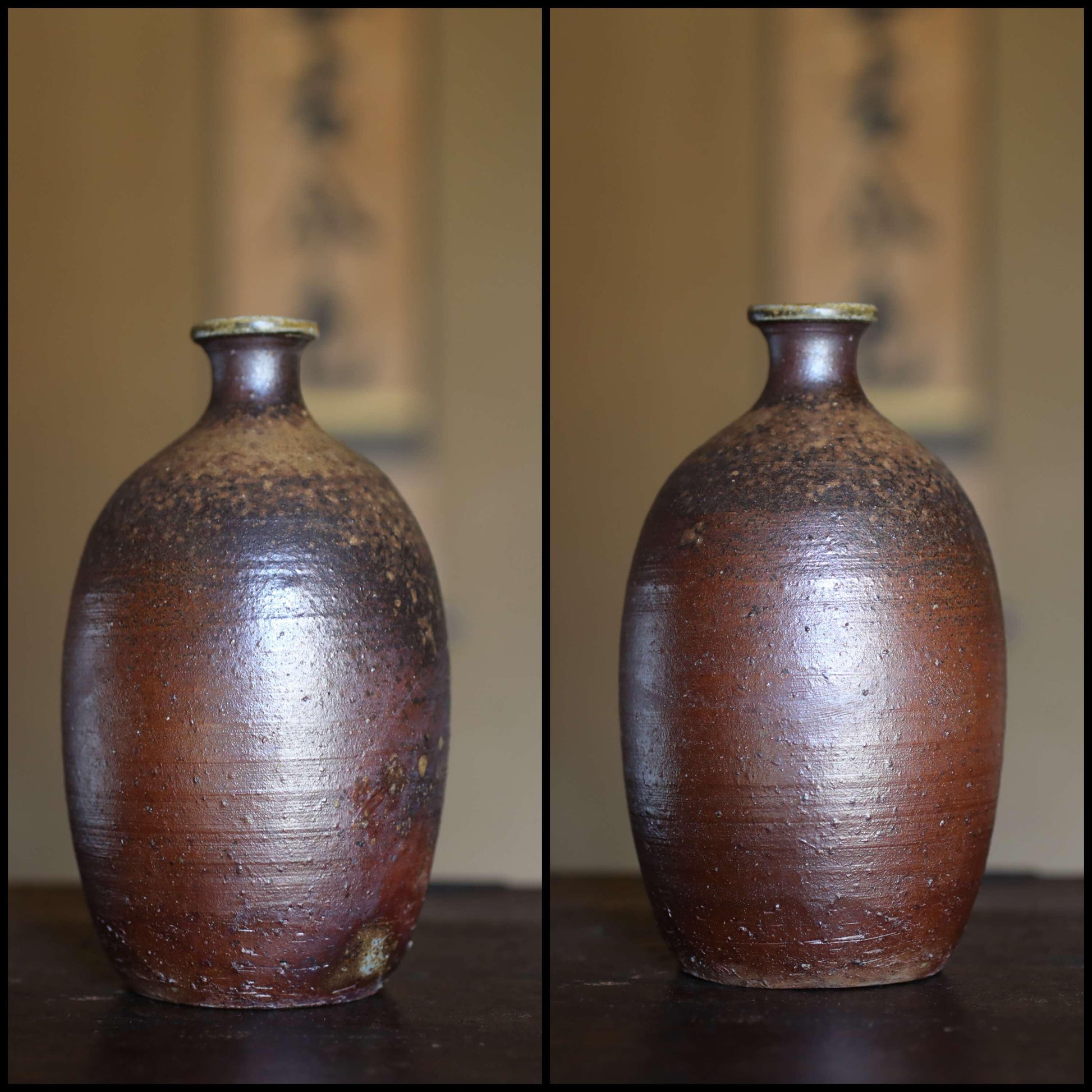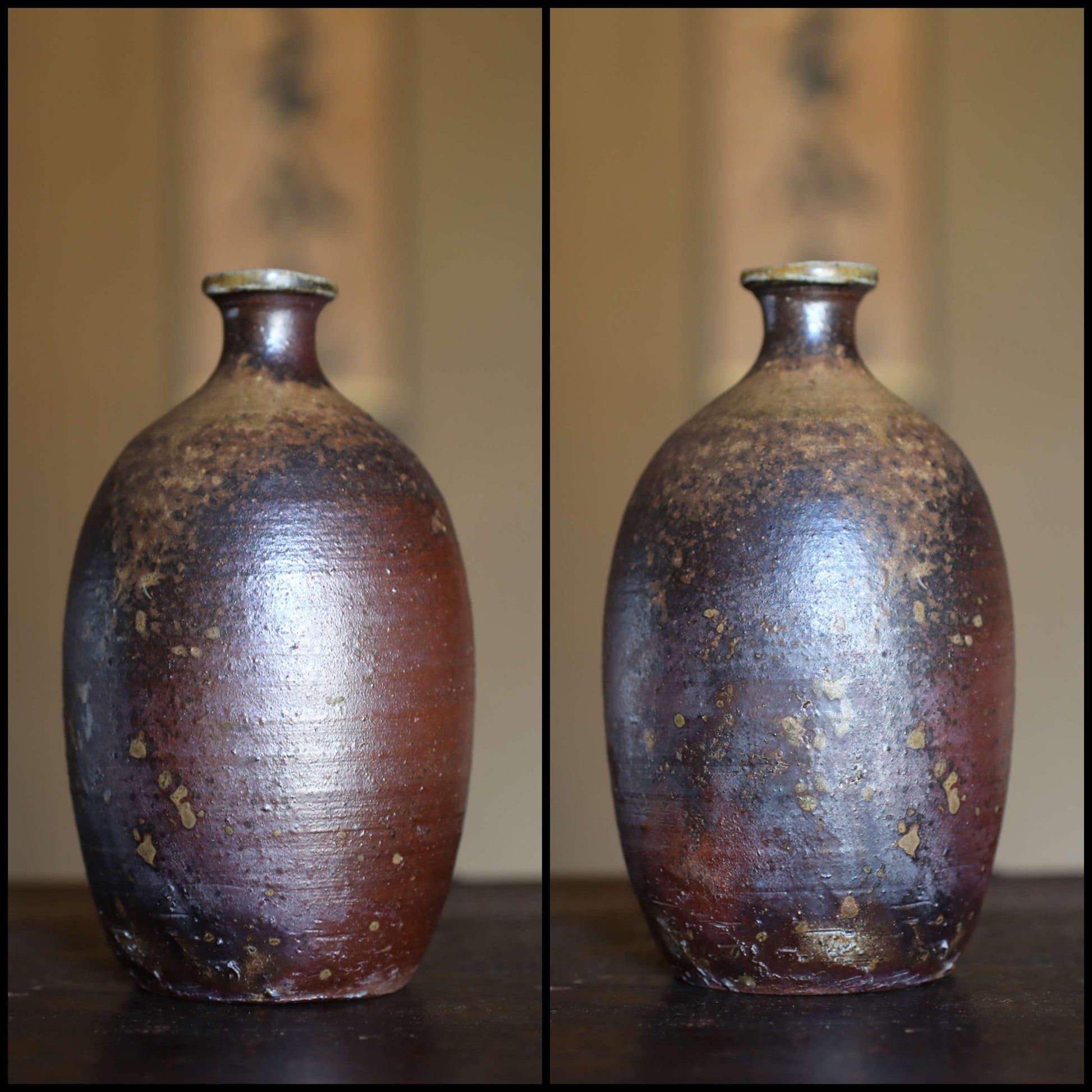This vase has a typical pattern of Bizen called as "Hidasuki" which is a unique kiln transformation in Bizen ware where rice straw is wrapped around the pottery before firing. When the straw burns, it reacts with the iron in the clay, creating reddish-brown patterns resembling a tied sash. No two patterns are the same, and it is a prized characteristic that highlights the natural beauty of Bizen ware. The shape is a 'tokkuri' type, resembling a Japanese sake bottle, and its narrow opening is perfect for displaying a few stems of natural grasses or branches.