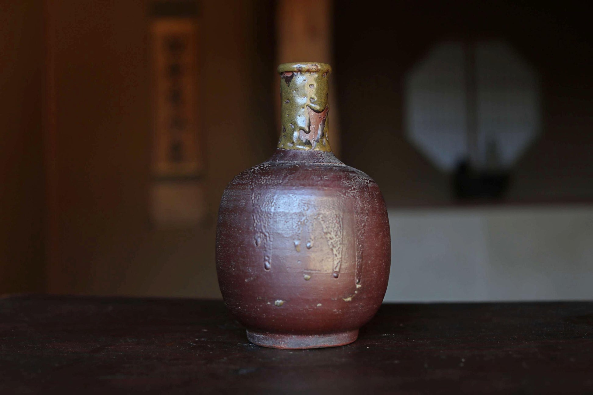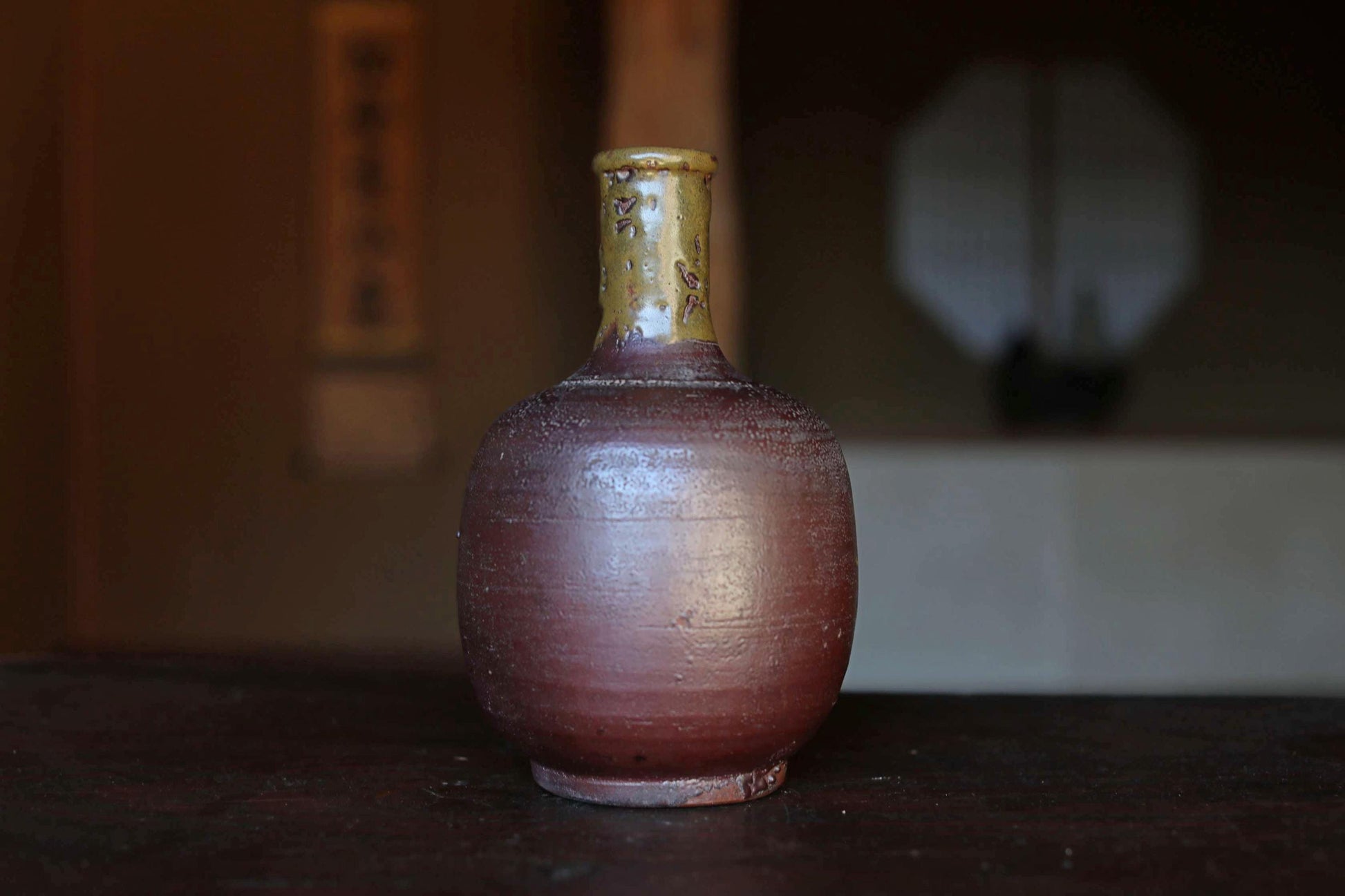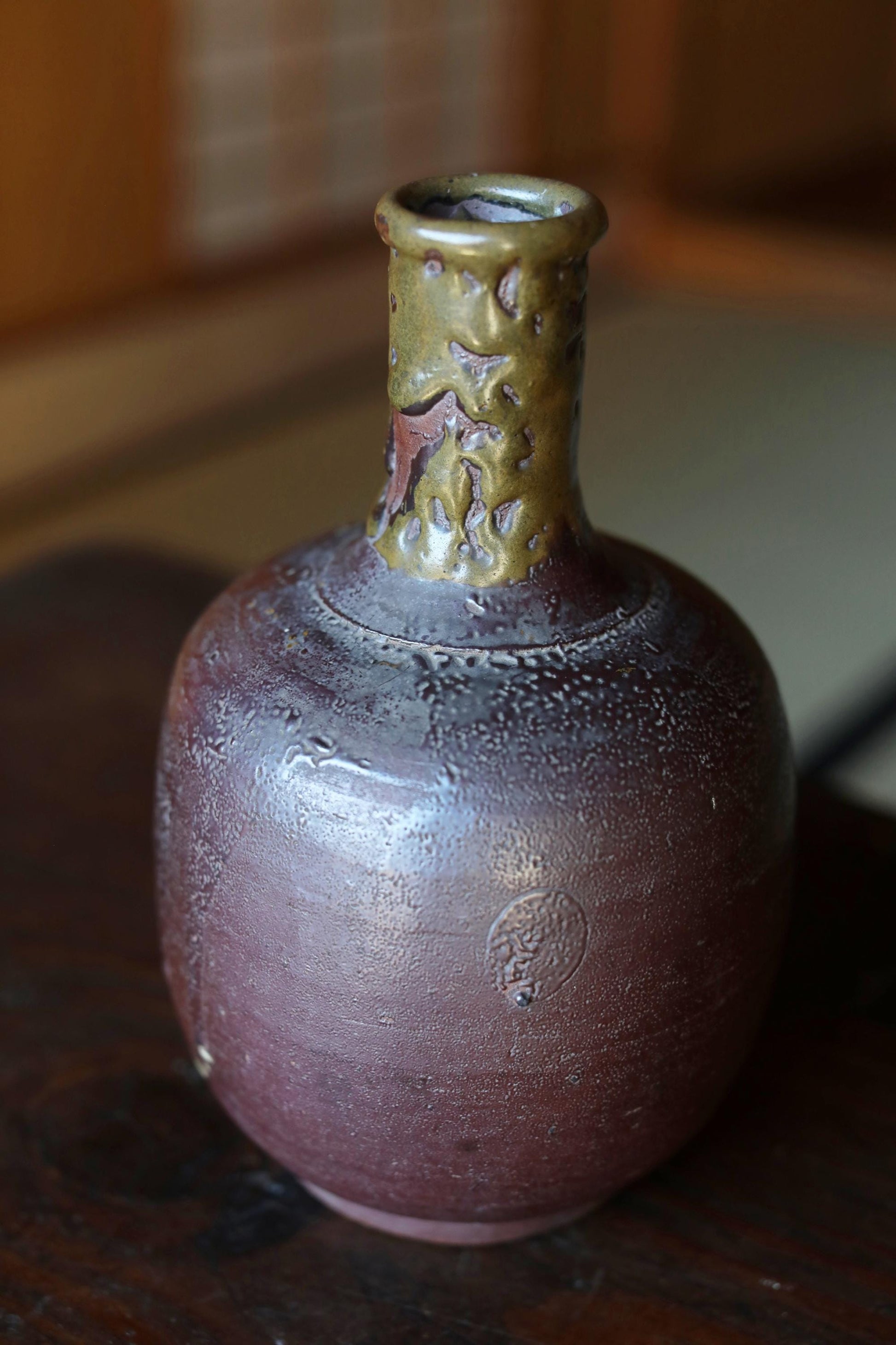 Japanese antique pottery "Bizen ware" Tokkuri flower vase 1800s Beautiful soil color and Green glaze H8.5×5.5in/H21.5×14cm.