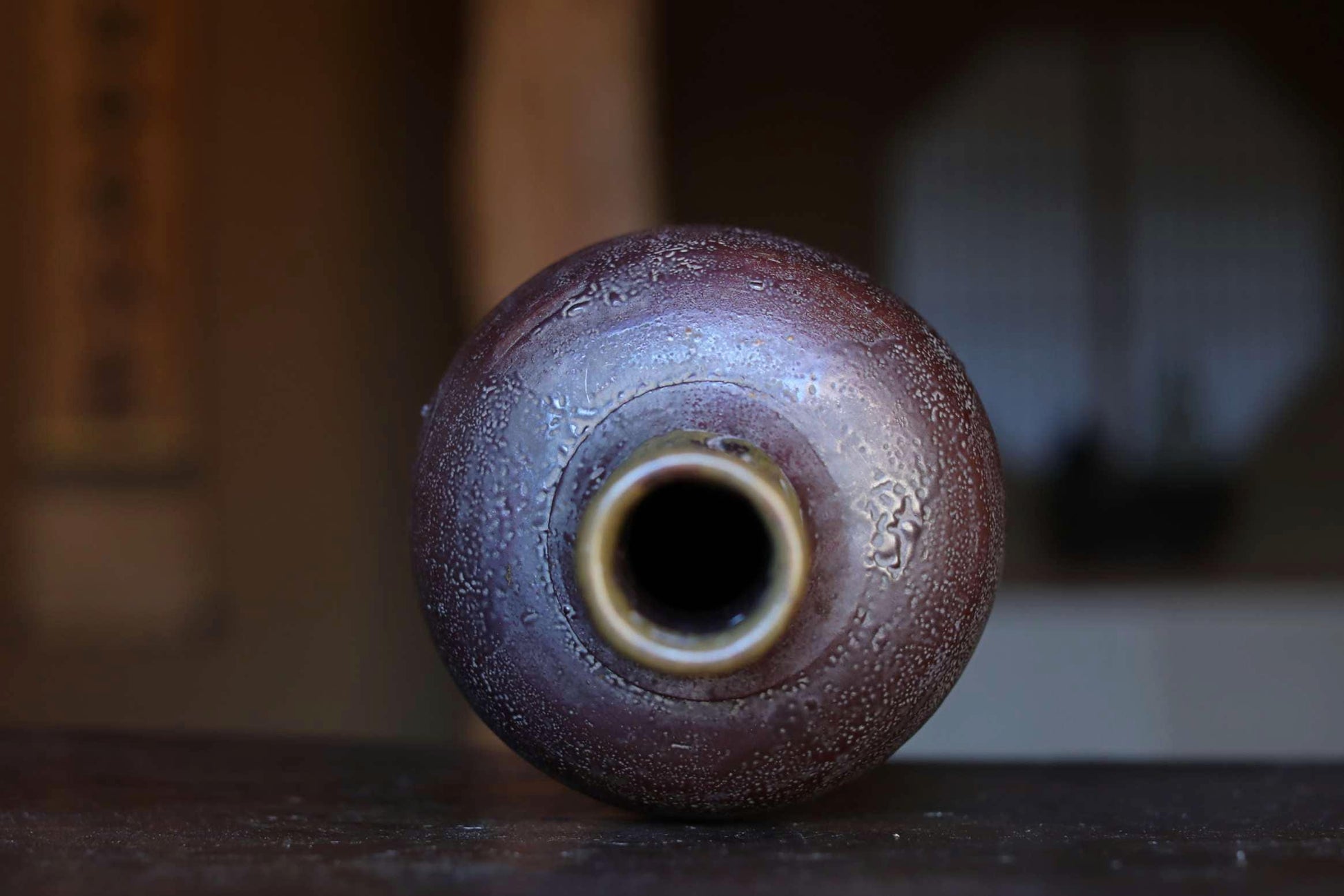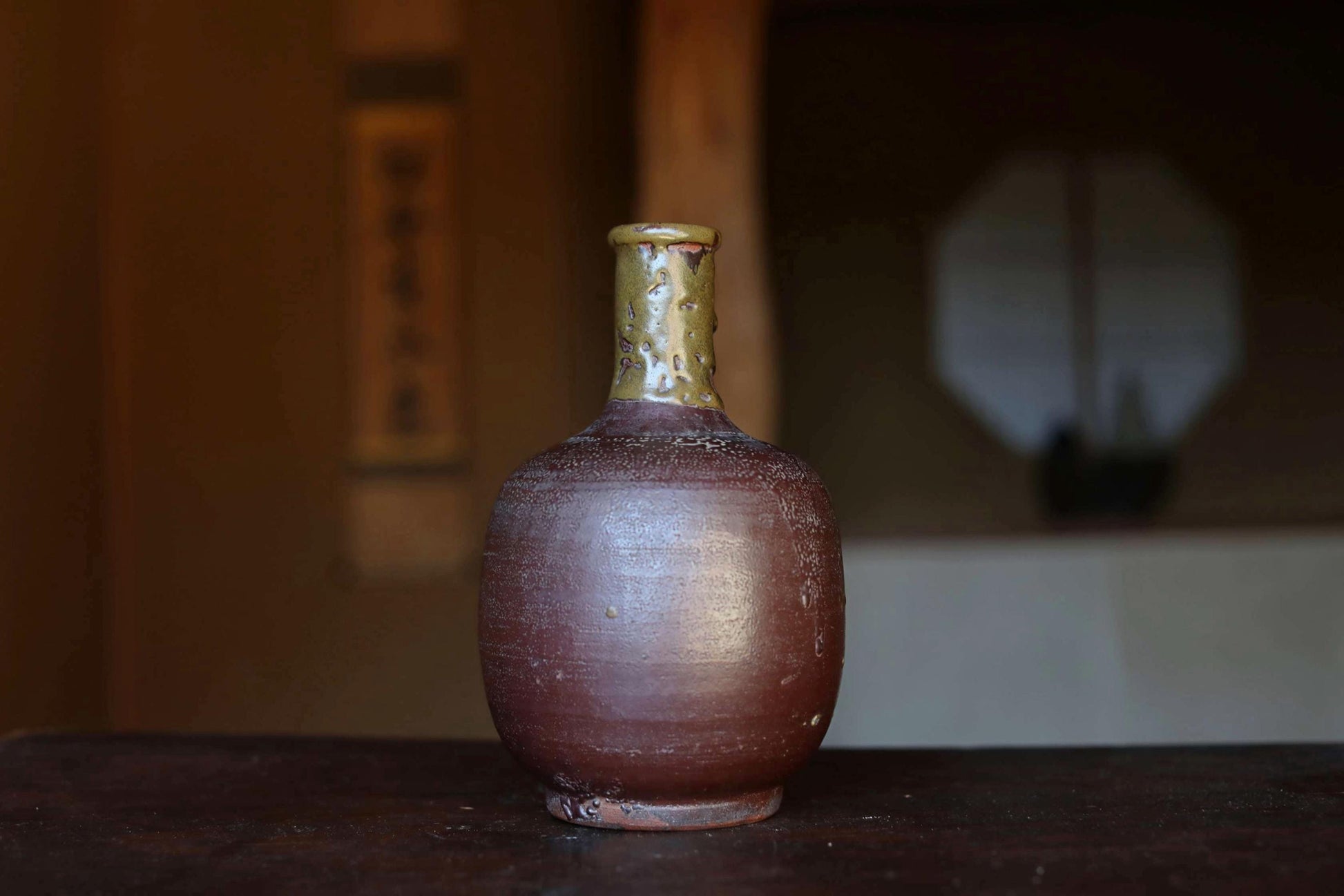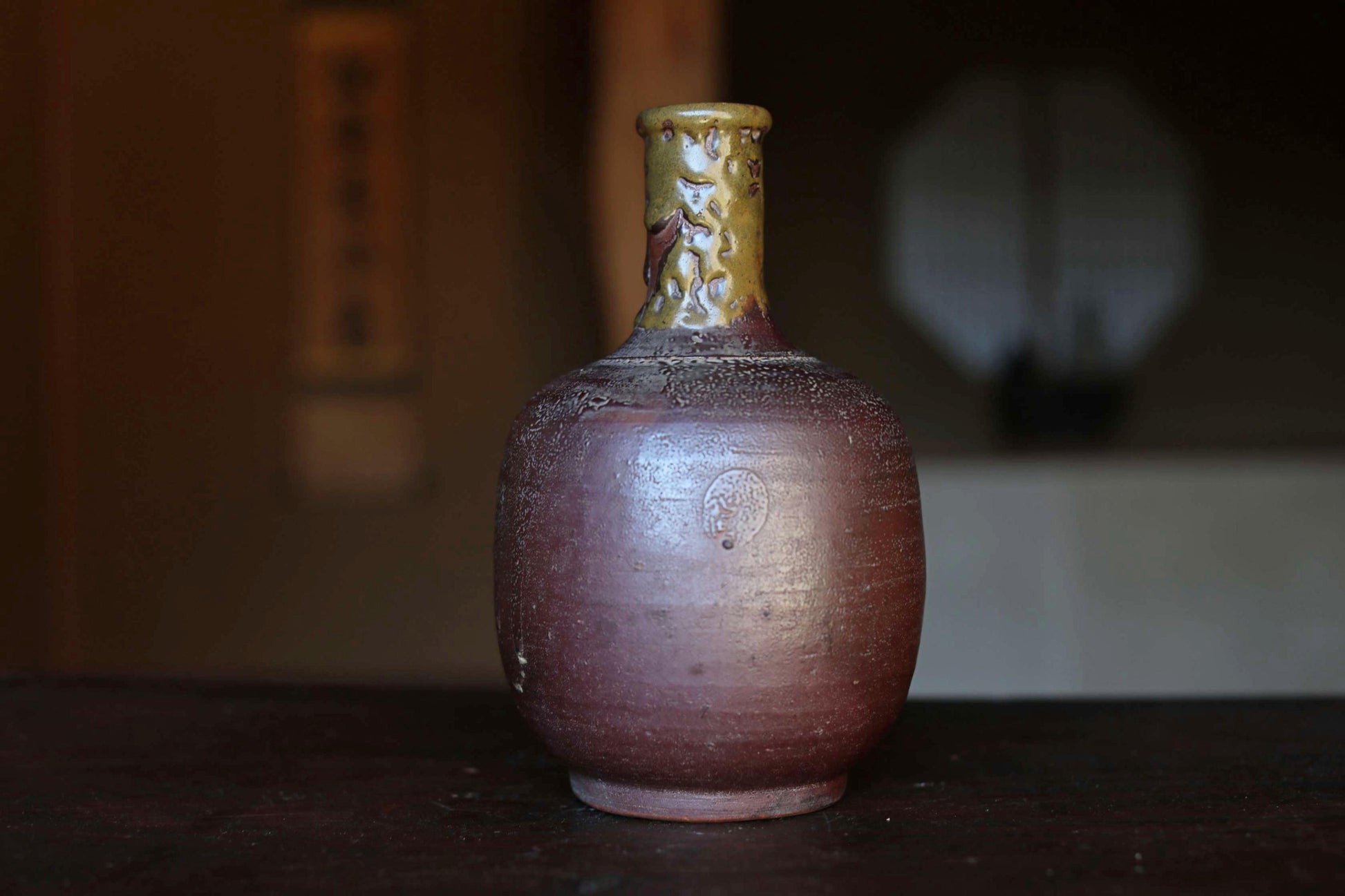 Japanese antique pottery "Bizen ware" Tokkuri flower vase 1800s Beautiful soil color and Green glaze H8.5×5.5in/H21.5×14cm.