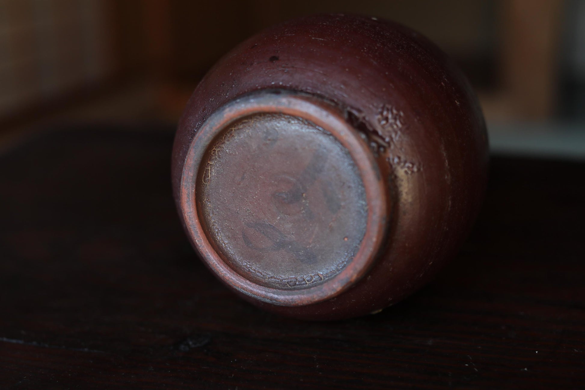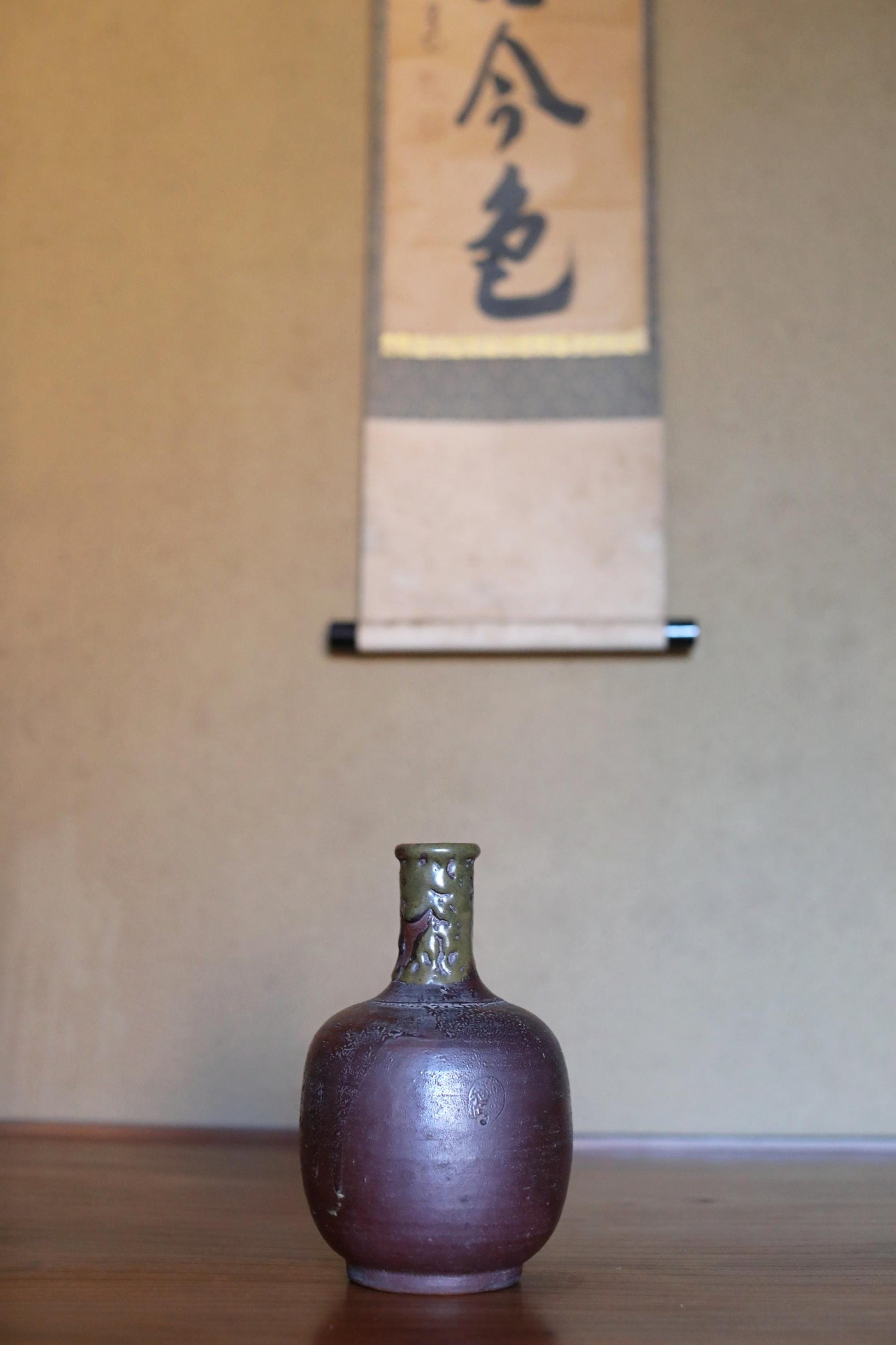 This was made around the end of the Edo period (1603-1867). The characteristic feature is the green glaze created by natural ashes and other substances on the neck. The shape is also distinctive, with the body (lower half) protruding widely and tapering off sharply from the shoulders to the neck.