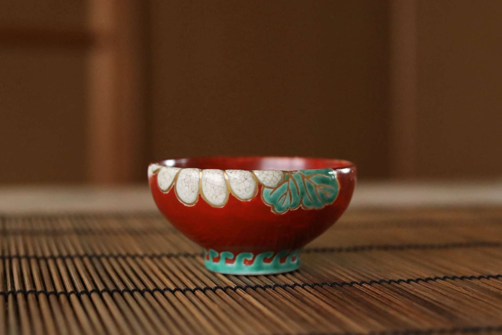 This sakazuki (sake cup) is remarkable for its innovative use of white glaze—a color traditionally left unpainted in Kutani Ware—applied to express the texture of a chrysanthemum, complete with fine crackling (kannyu). The flower design dynamically expands from the interior of the cup outwards, and a wave pattern has been added to its base, adding a final delicate touch.