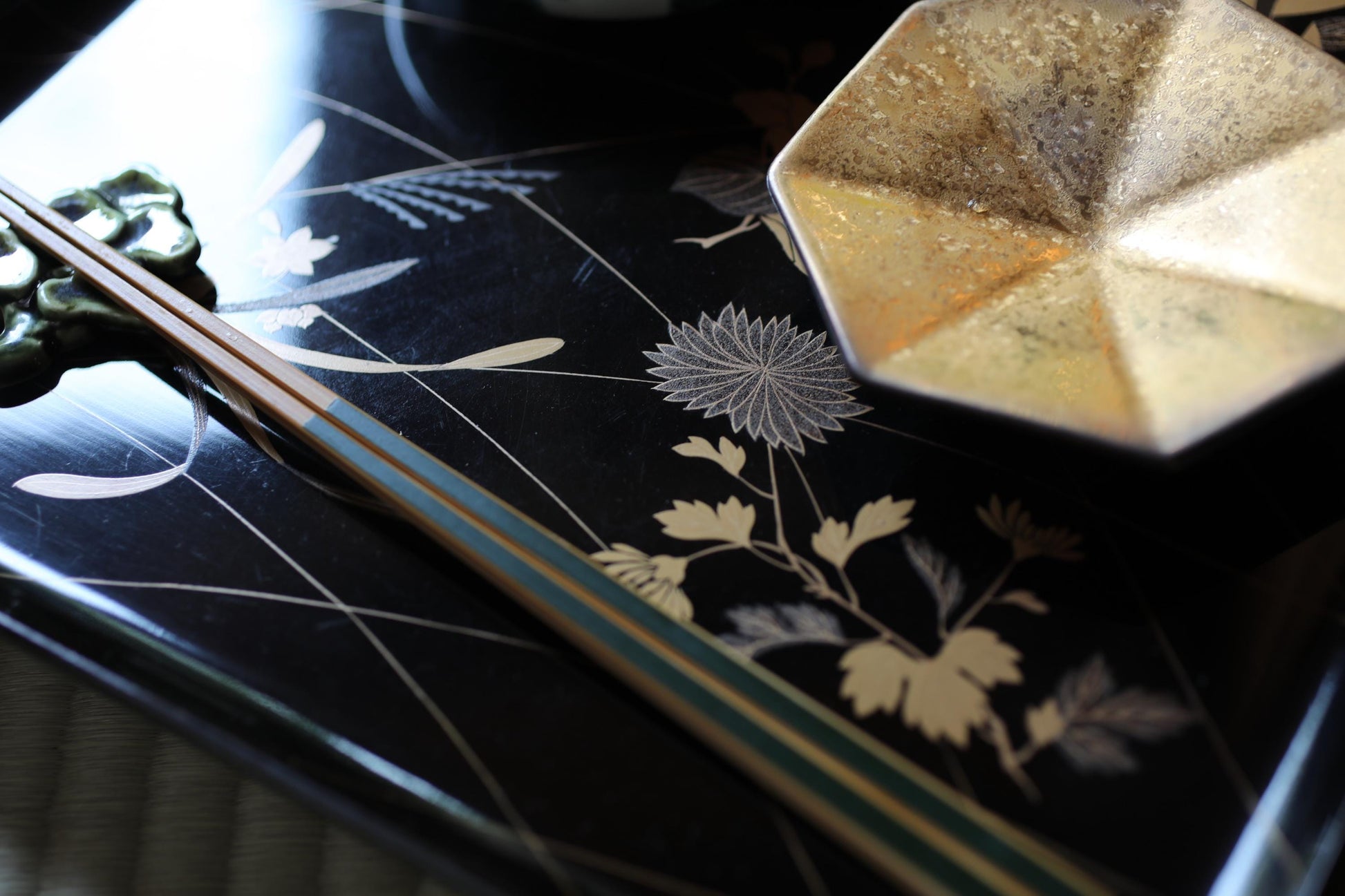 It is made with a lacquer technique called "蒔絵maki-e," in which gold powder is glued to the surface to draw pictures and patterns.