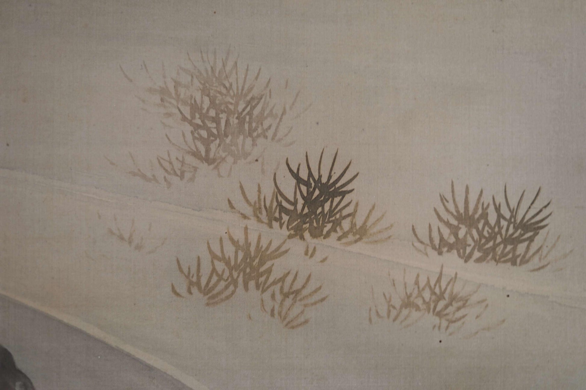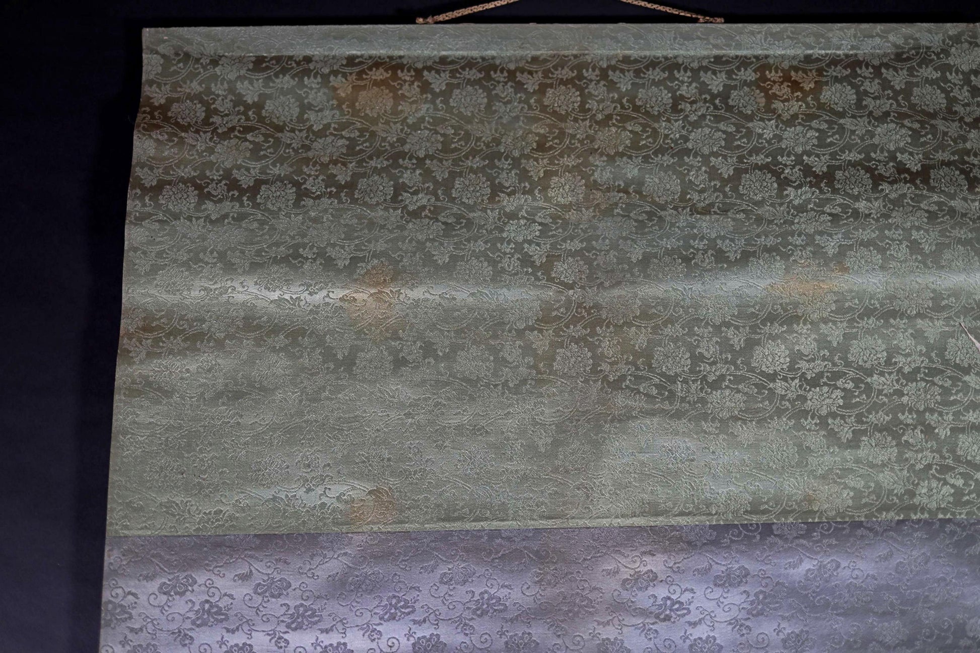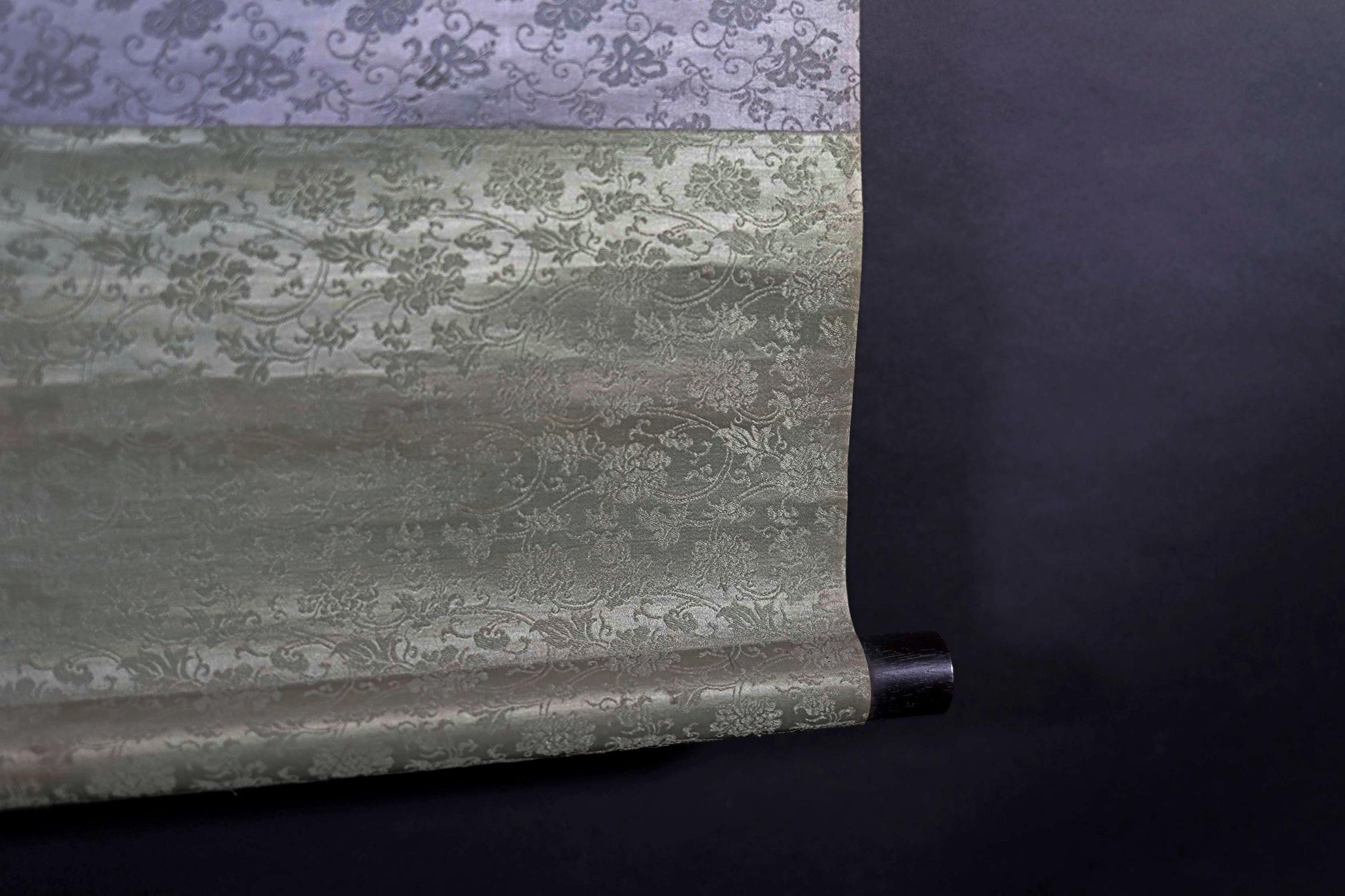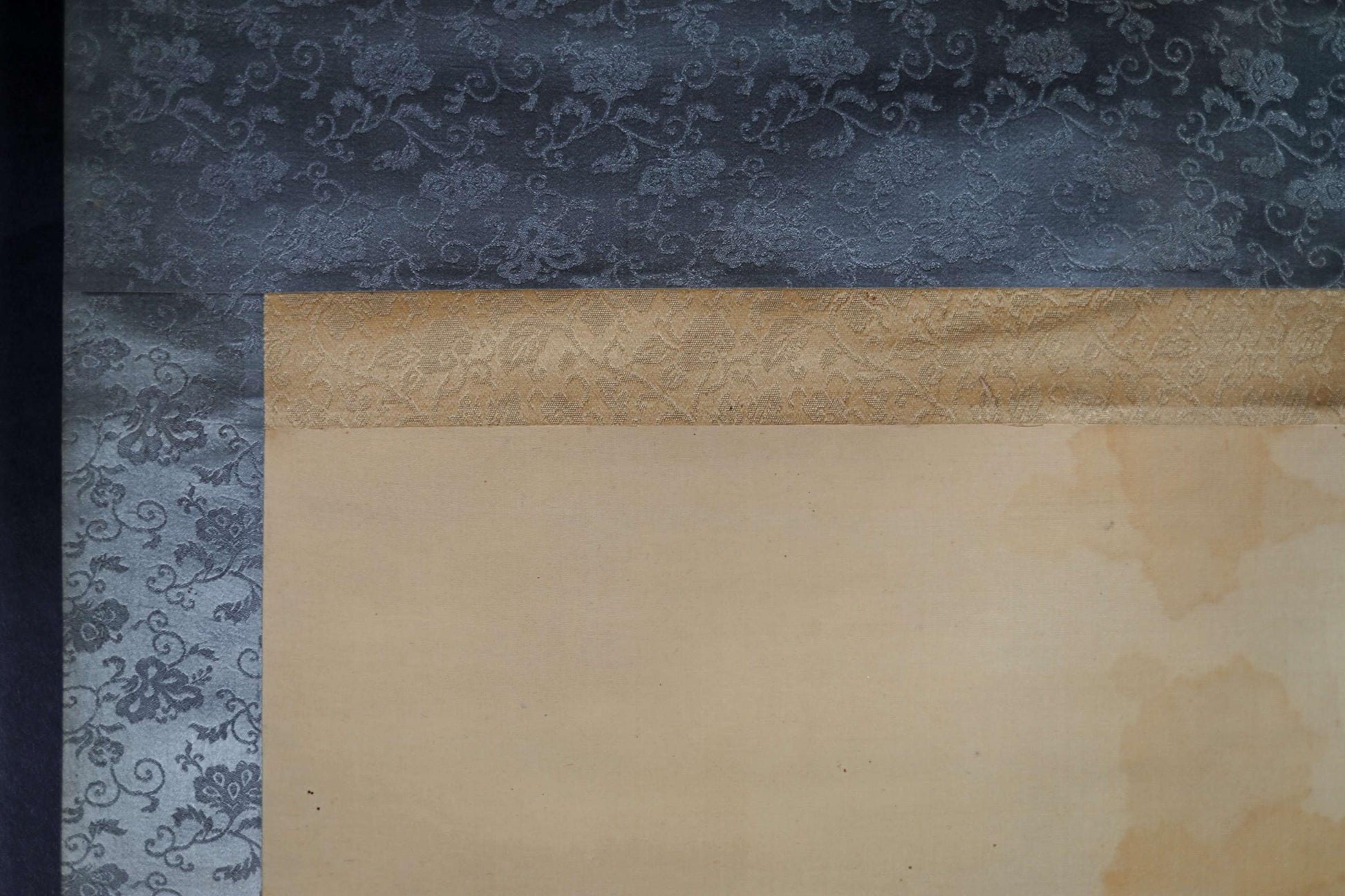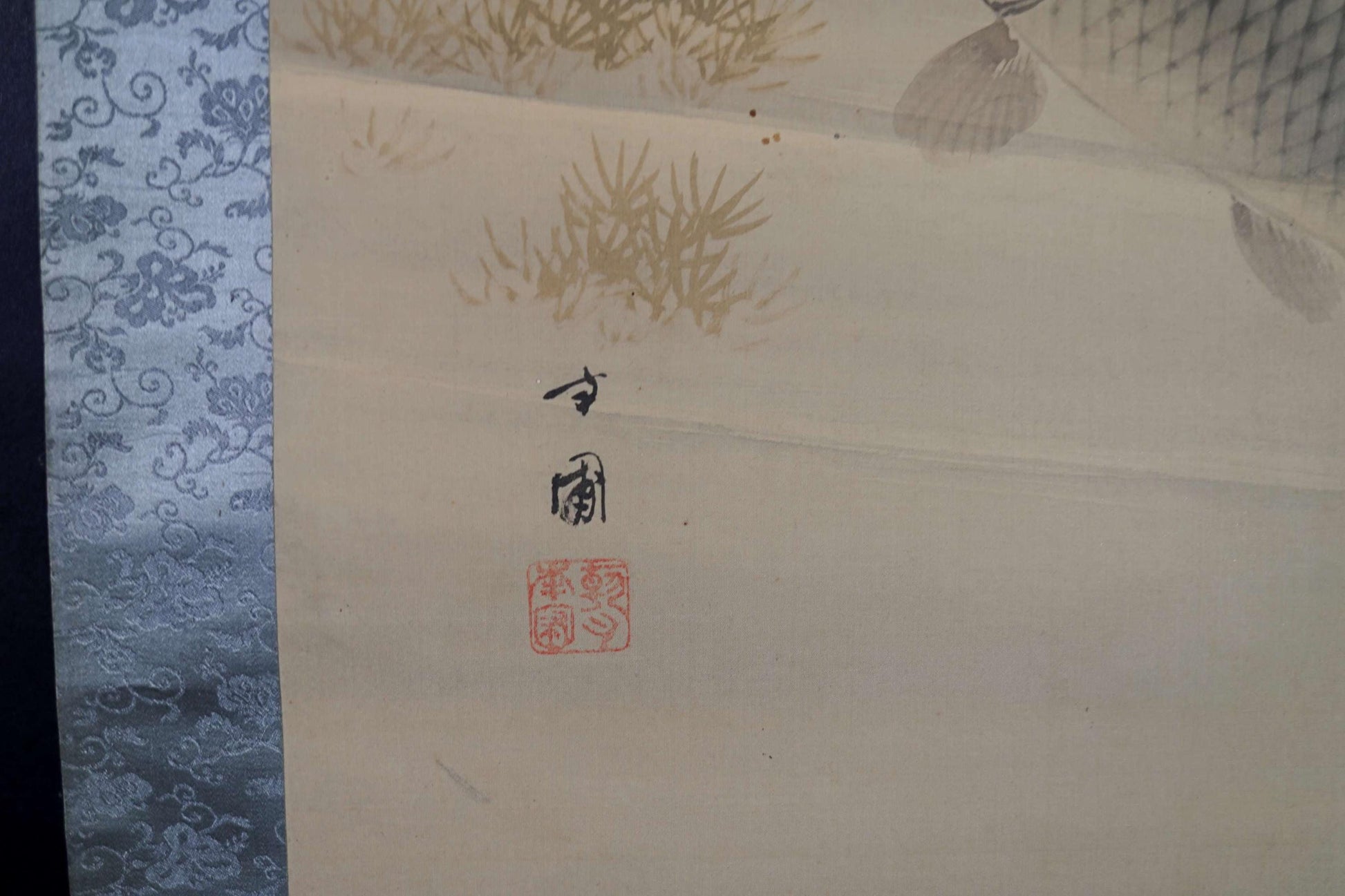 The expression of the carp is delicate and beautiful. This technique in Japanese painting, where the subject is depicted solely using the deep navy color without outlines, is a traditional method known as "Mokkotsu-ga". The colors of the surrounding silk are pale blue and green with traditional arabesque patterns, giving this work a very elegant and gentle atmosphere. It is signed and stamped by painter.
