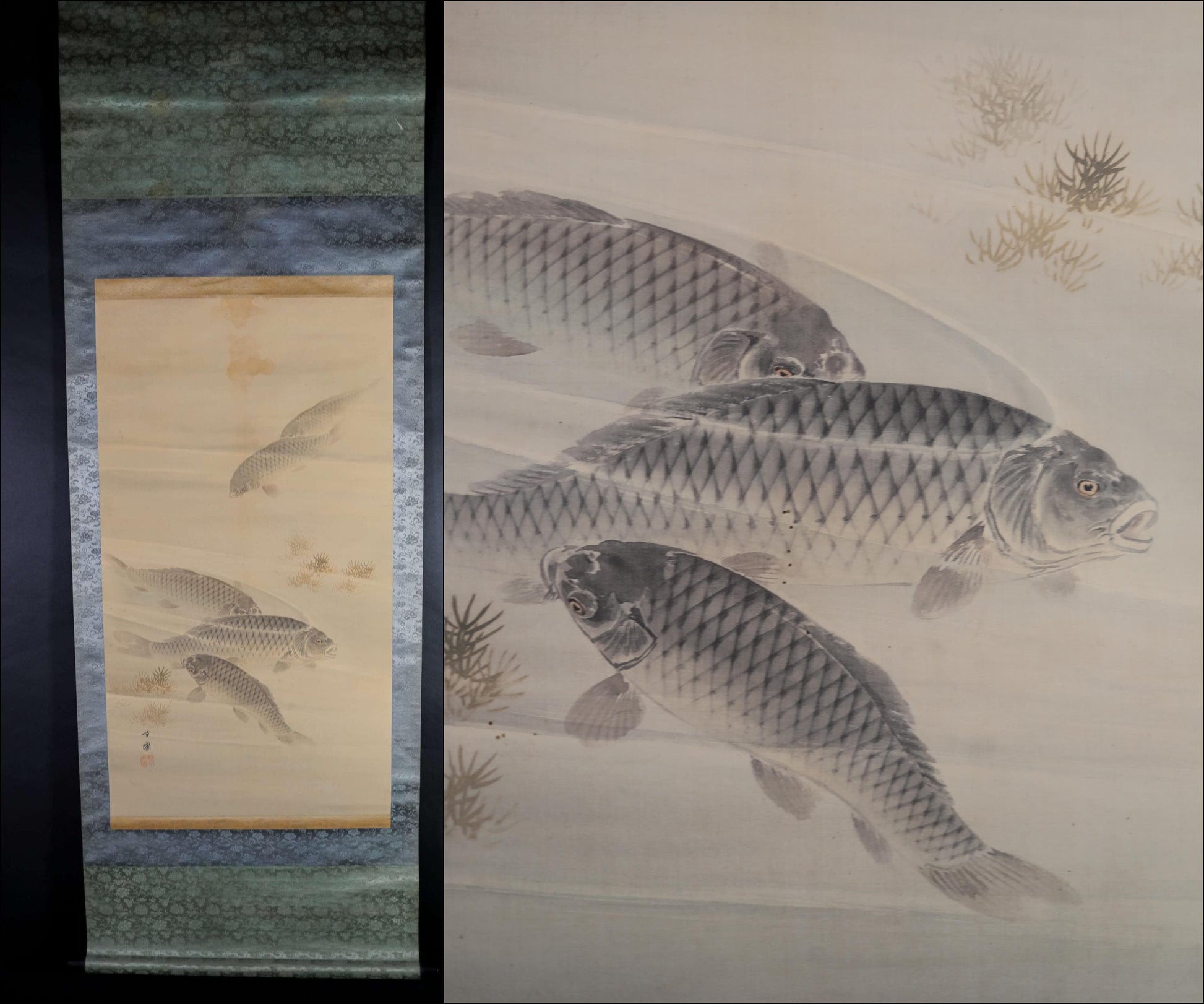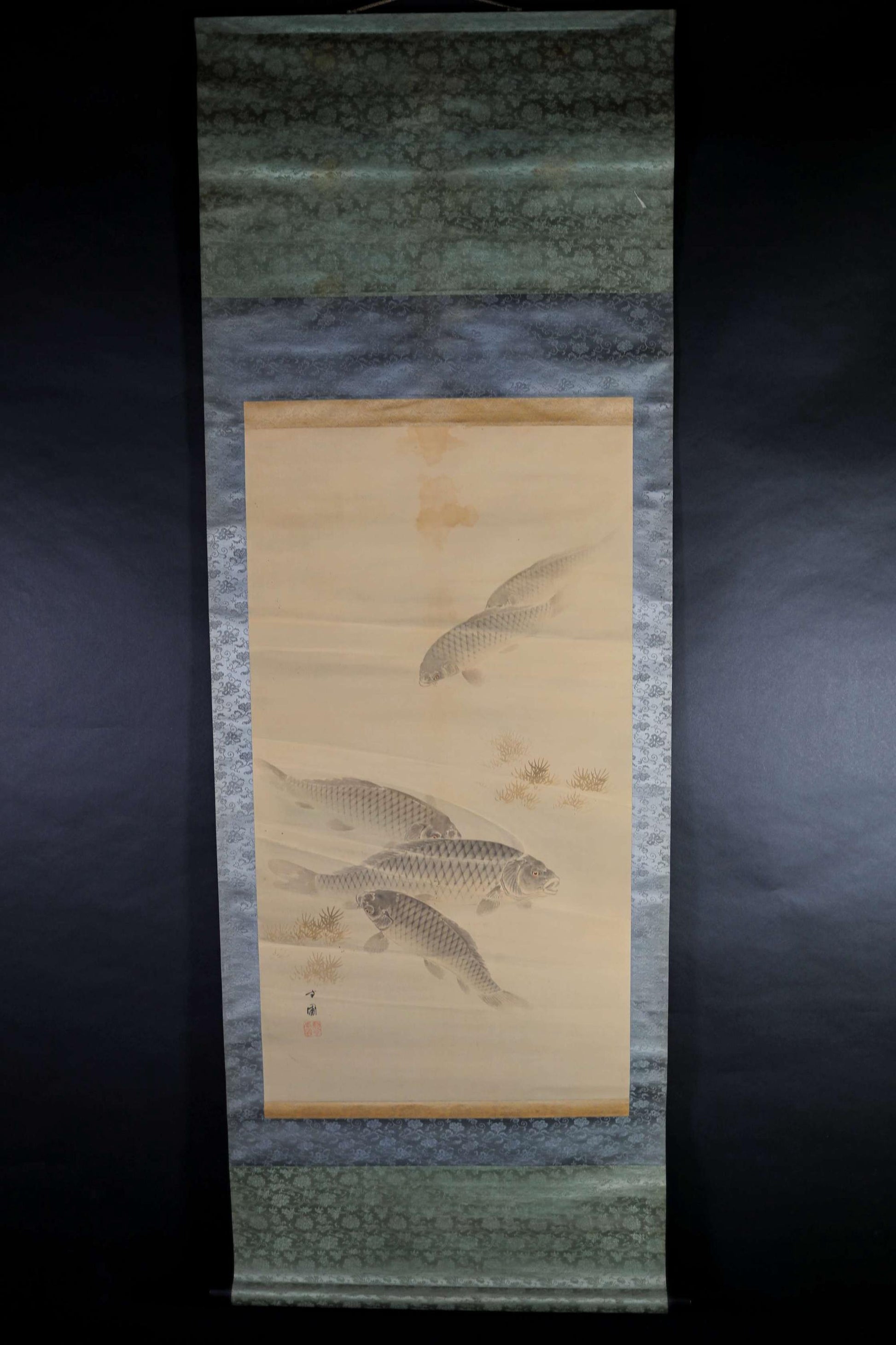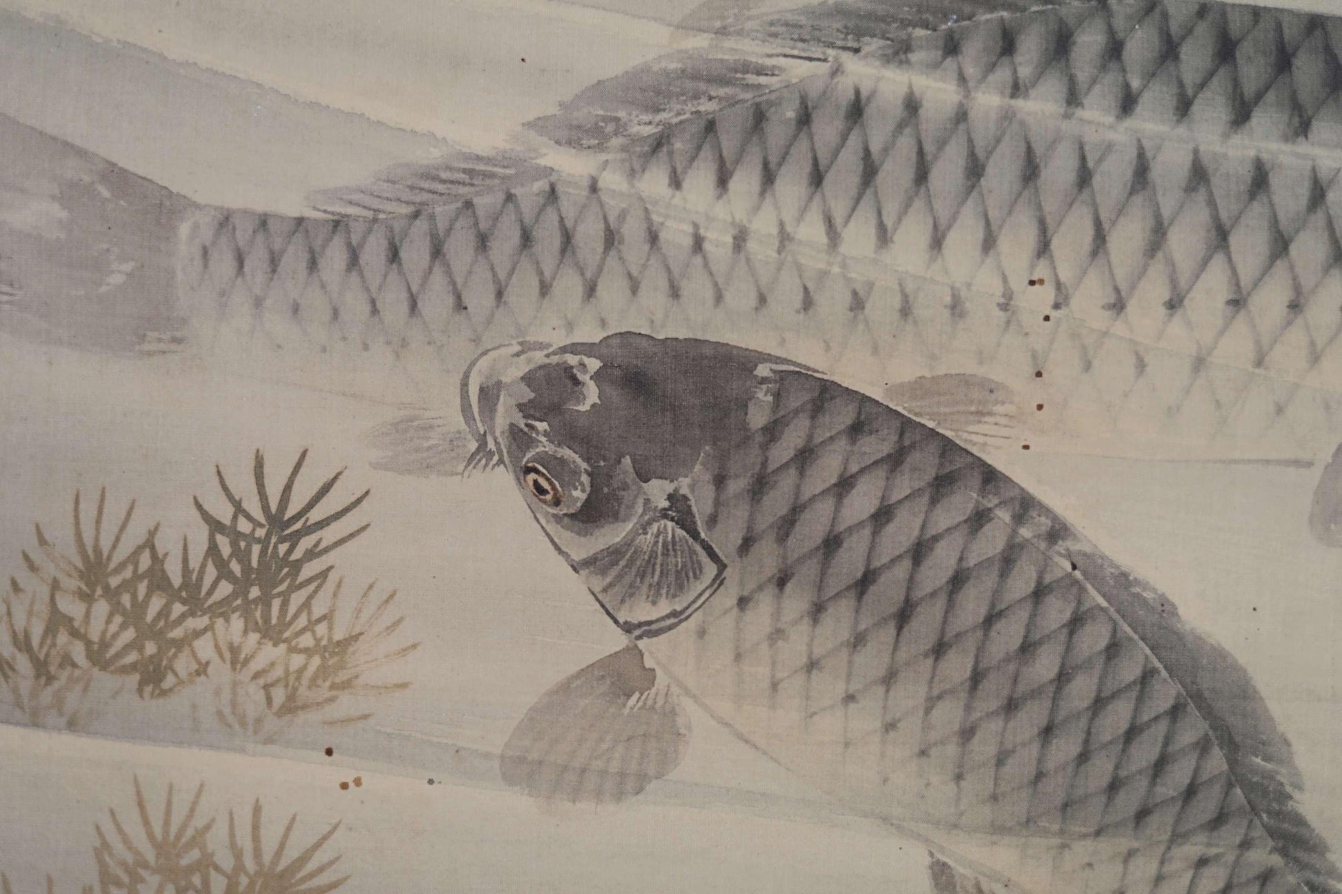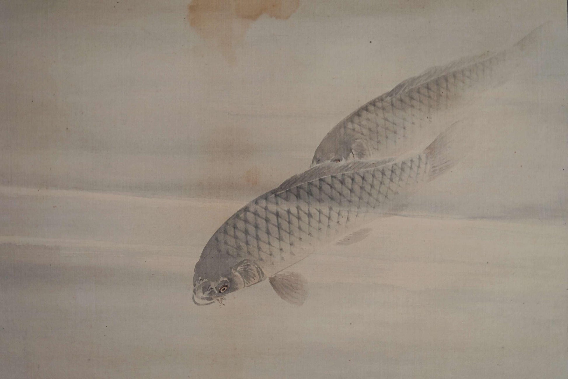 Japanese antique watercolor painting scroll fine painted carps KOI, KAKEJIKU with signature H67.7x24in / 172x61cm