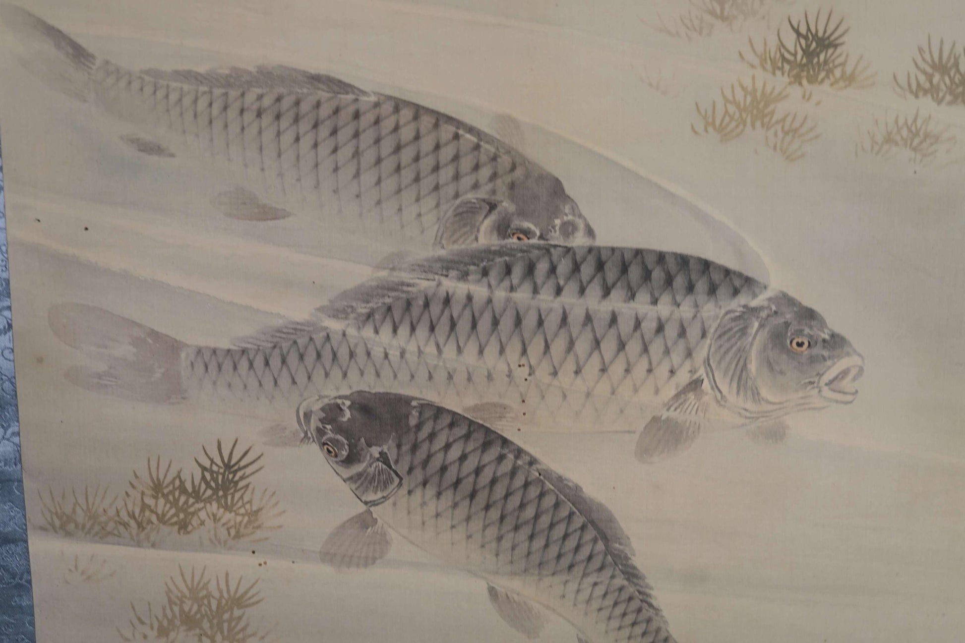 This painting is a hanging scroll depicting gracefully swimming carps.