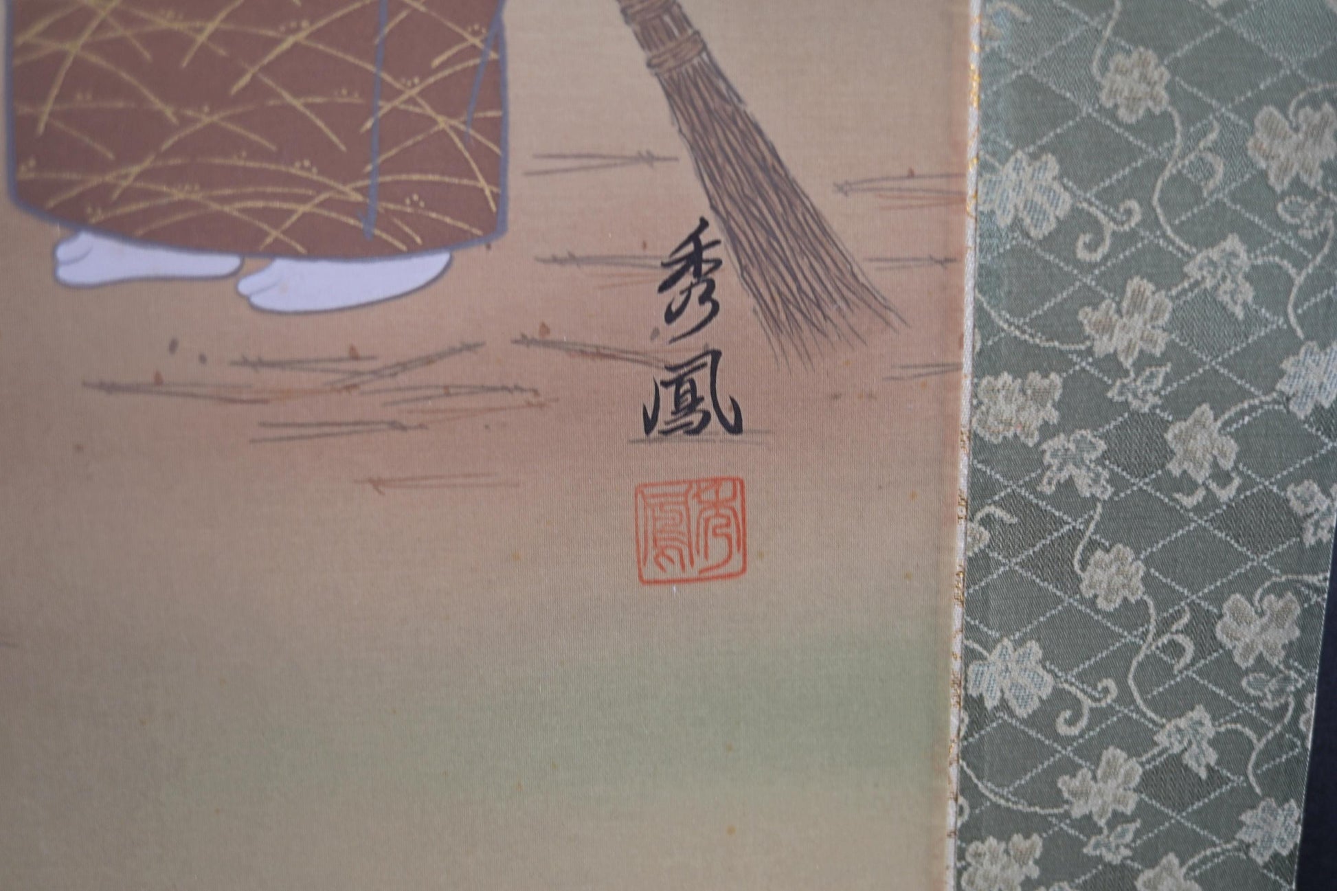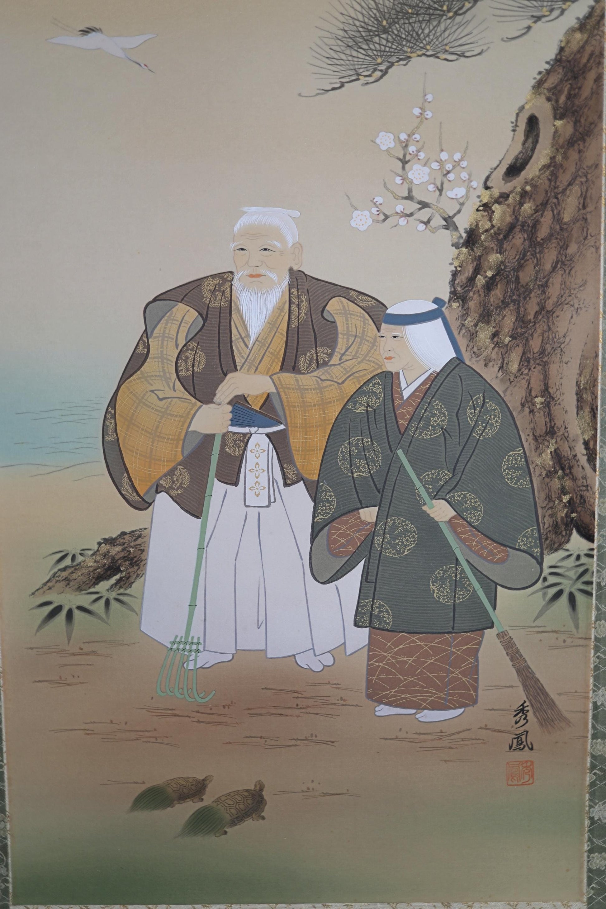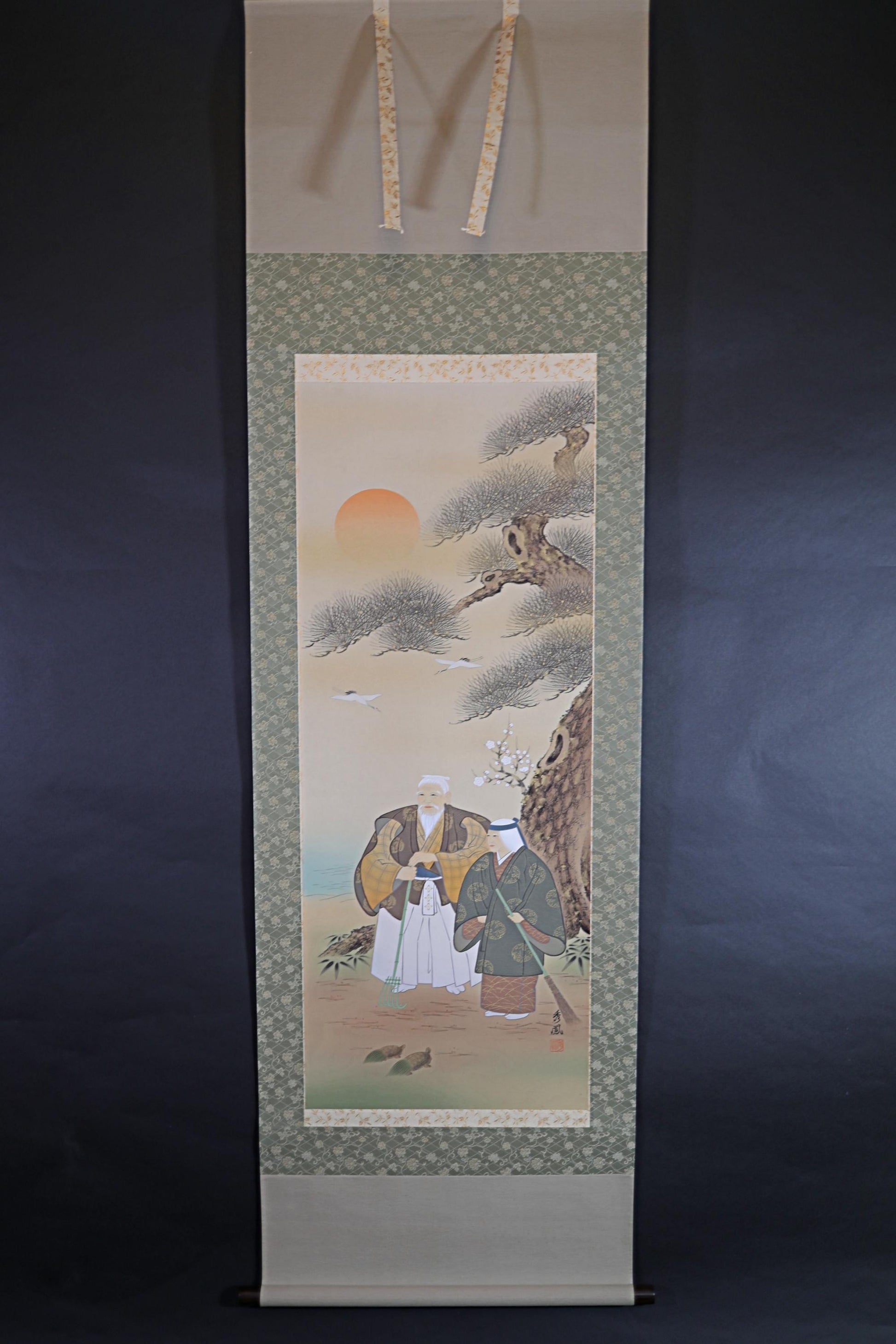 Japanese antique watercolor painting scroll for "高砂 Takasago" old couple , KAKEJIKU with BOX 1970s Kanji signature H71.7×21.1in