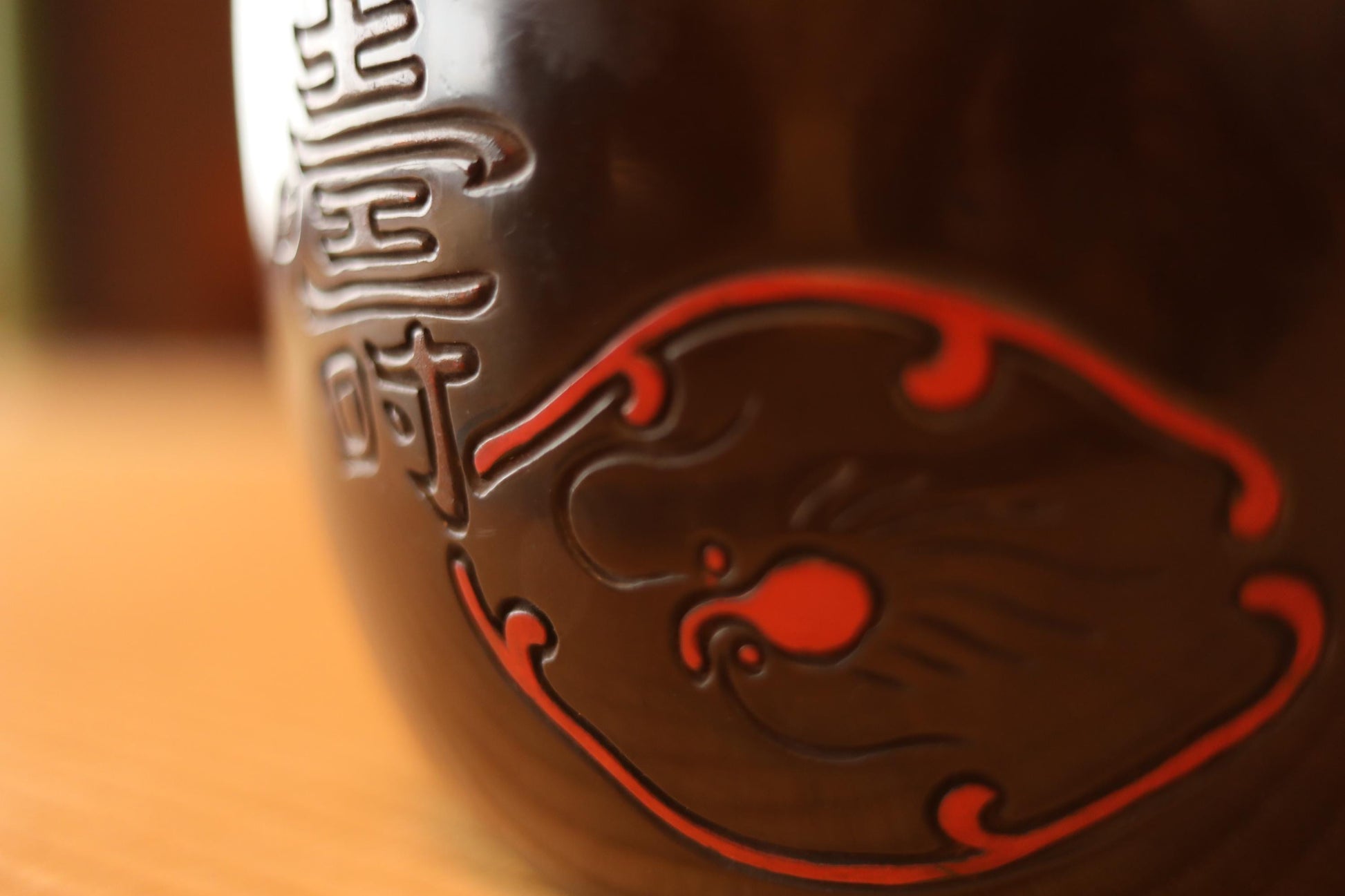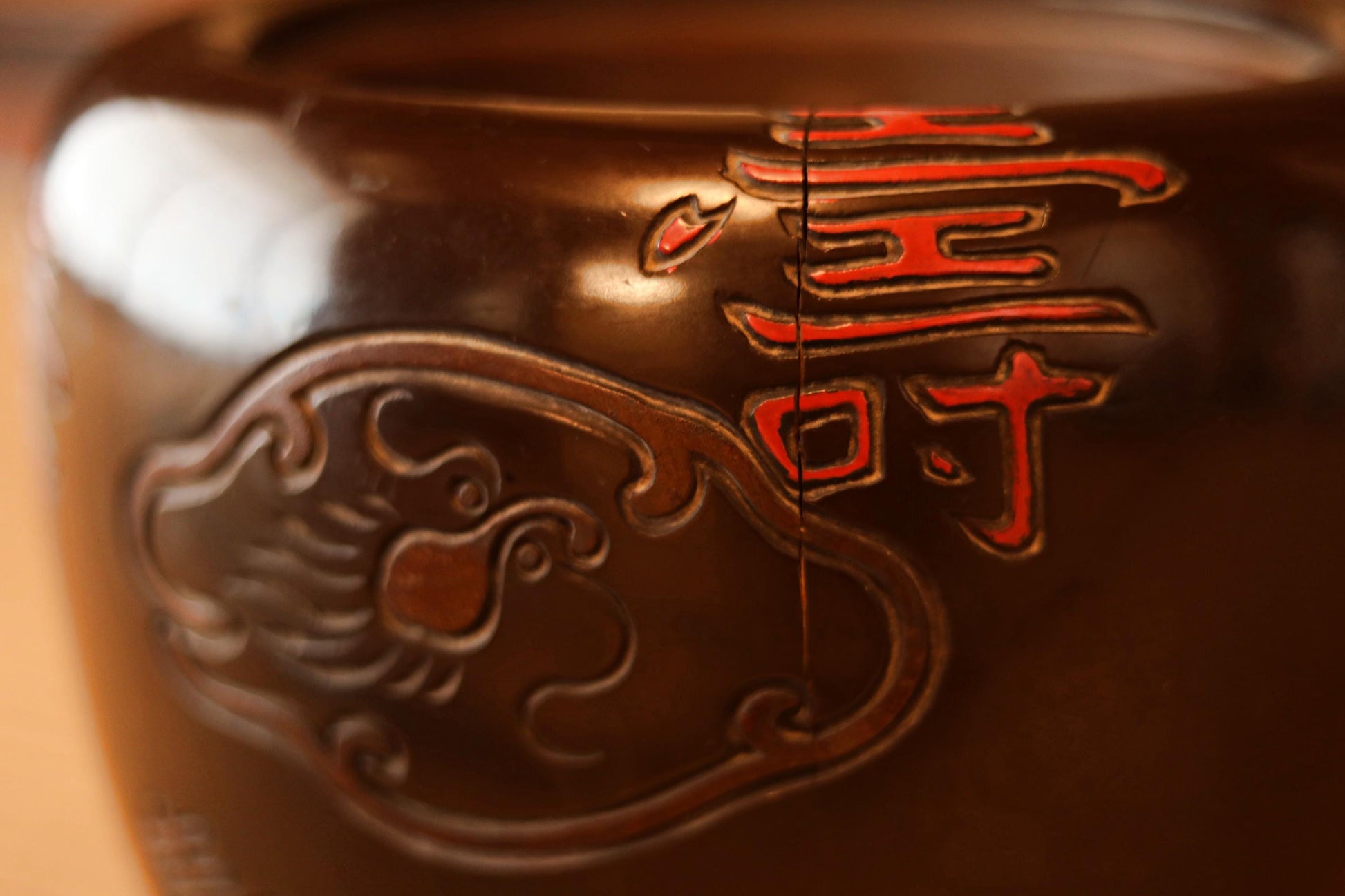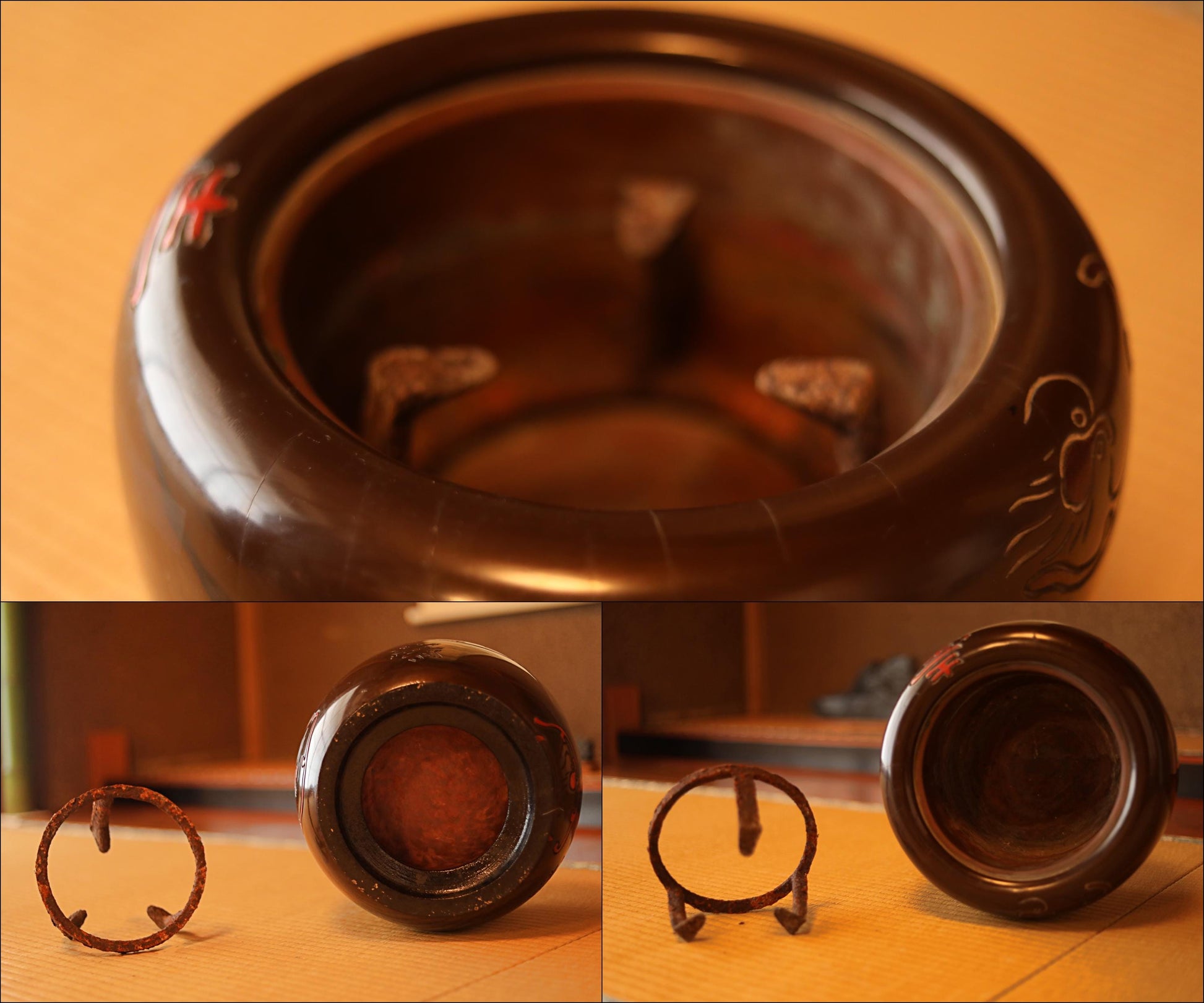 The entire outside of this brazier is painted with dark brown lacquer, giving it a cool aged look. It is unique in that it is carved with the Kanji character for "寿KOTOBUKI (longevity)" and patterns like arabesque and octopus.