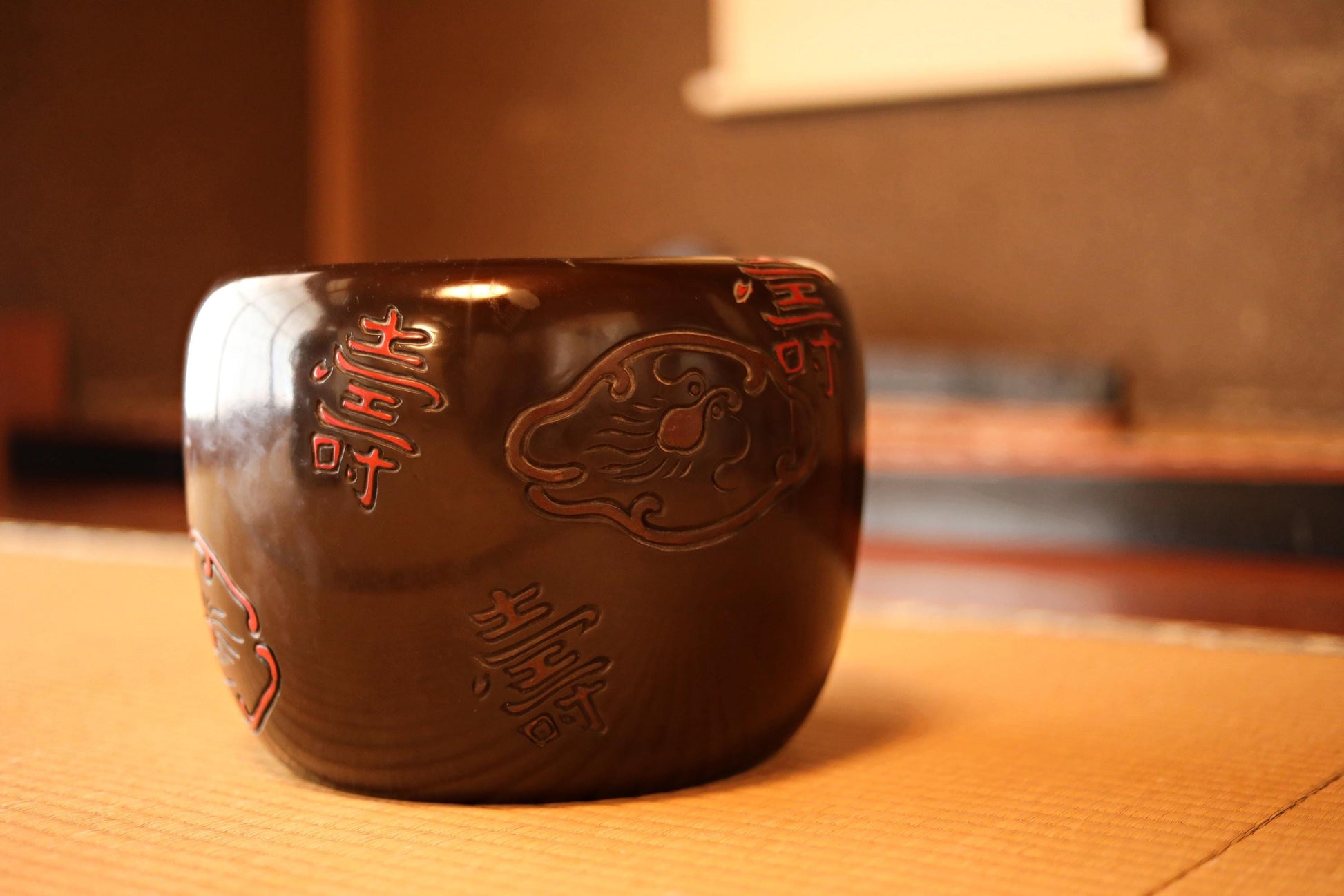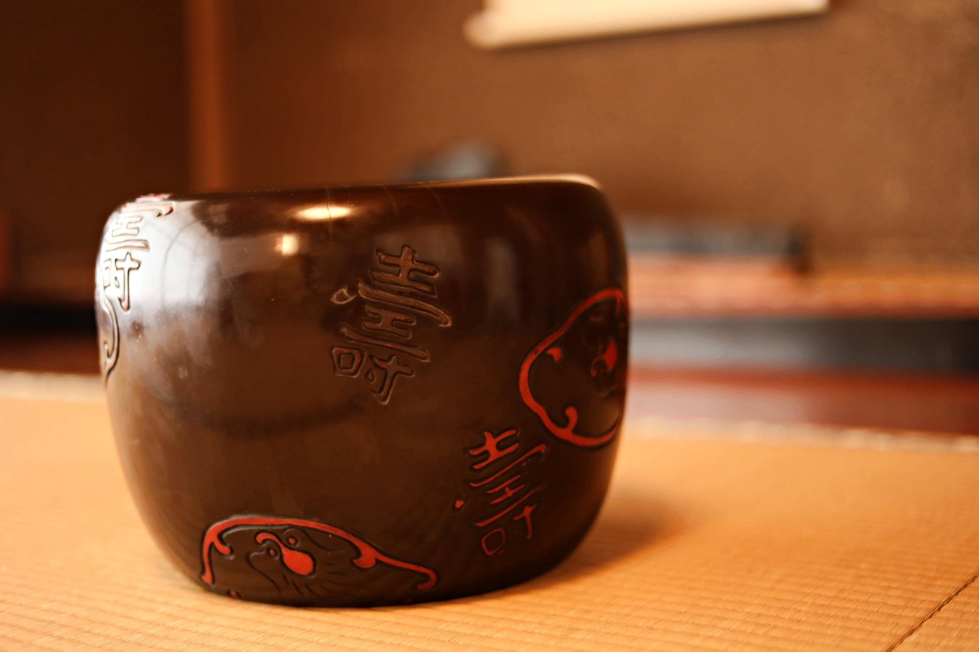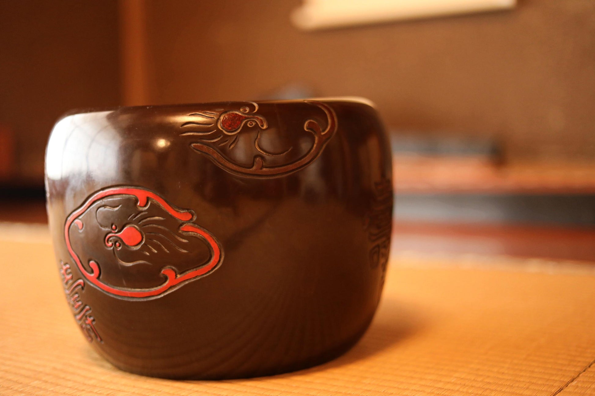The entire outside of this brazier is painted with dark brown lacquer, giving it a cool aged look. It is unique in that it is carved with the Kanji character for "寿KOTOBUKI (longevity)" and patterns like arabesque and octopus.