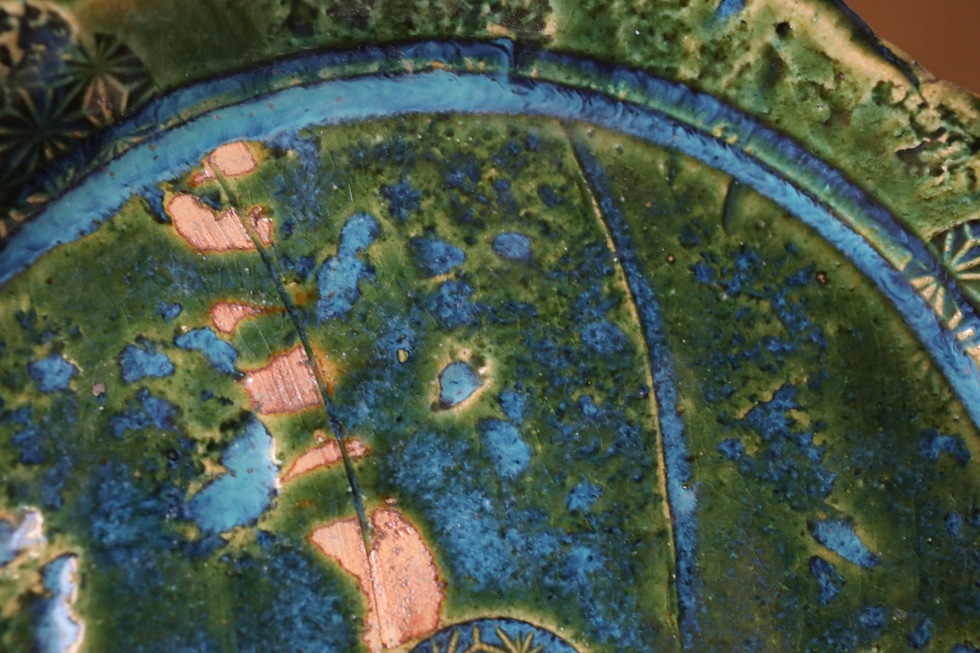 This was made in one of the 織部Oribe kilns that have been in existence since the Edo period, started by a potter called 加藤武右衛門 Takeemon Kato. This is not an old item; it was made in the Showa period.