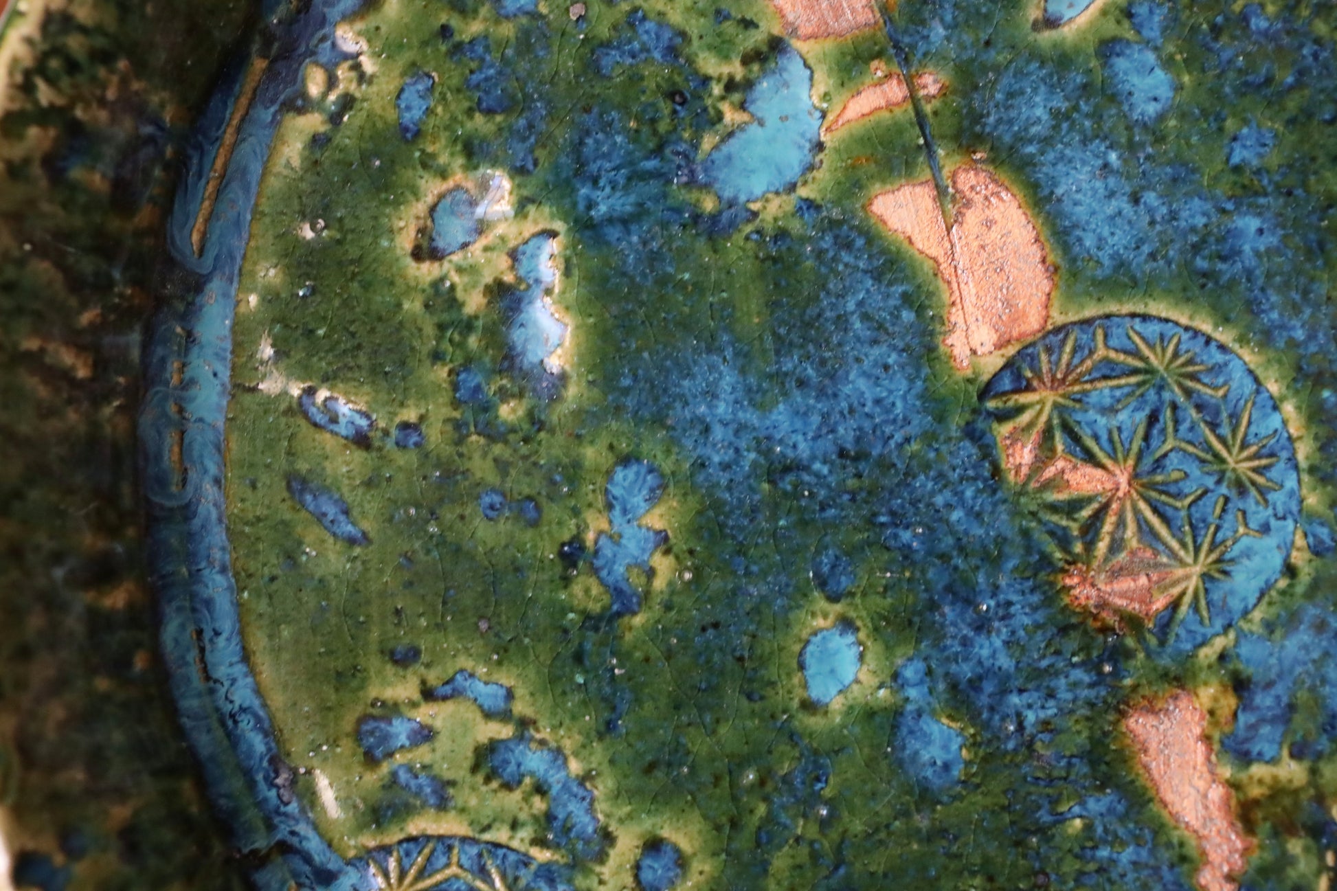 The interesting shape of the rough clay and the unevenness of the glaze are also made as a daring playful touch. The motif of hemp leaves is used as a small pattern in some places. Hemp leaves are believed to ward off evil. The name "hemp leaf" comes from its resemblance to the leaves of the hemp plant, a classic pattern of neatly arranged hexagons.