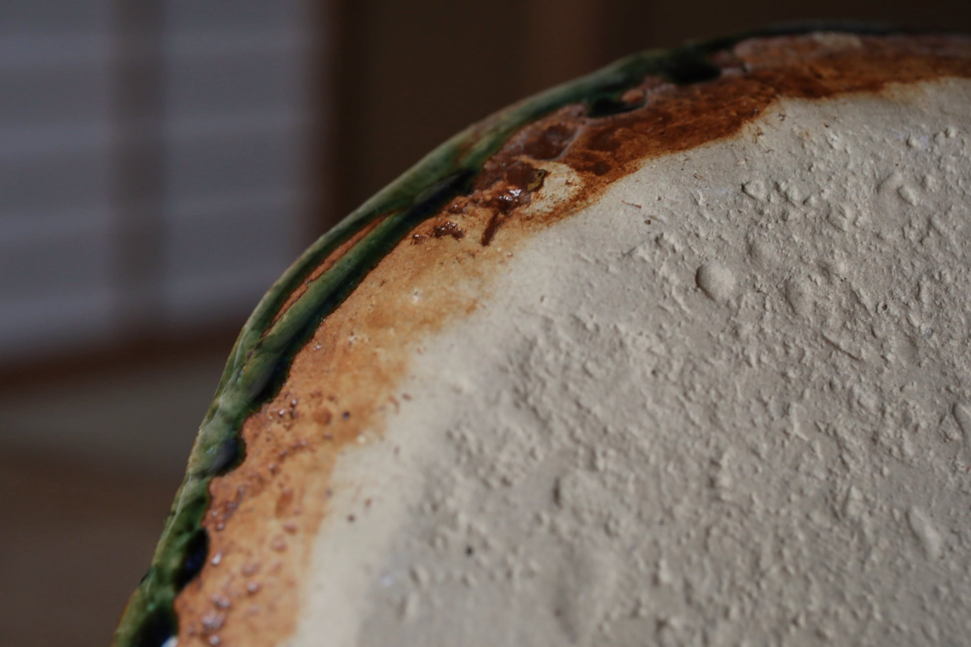 It makes pasta, salad, or sushi look delicious. It is playful, with some areas intentionally unglazed. The clay on the back side will change color as it is used over the years, which is also interesting.
