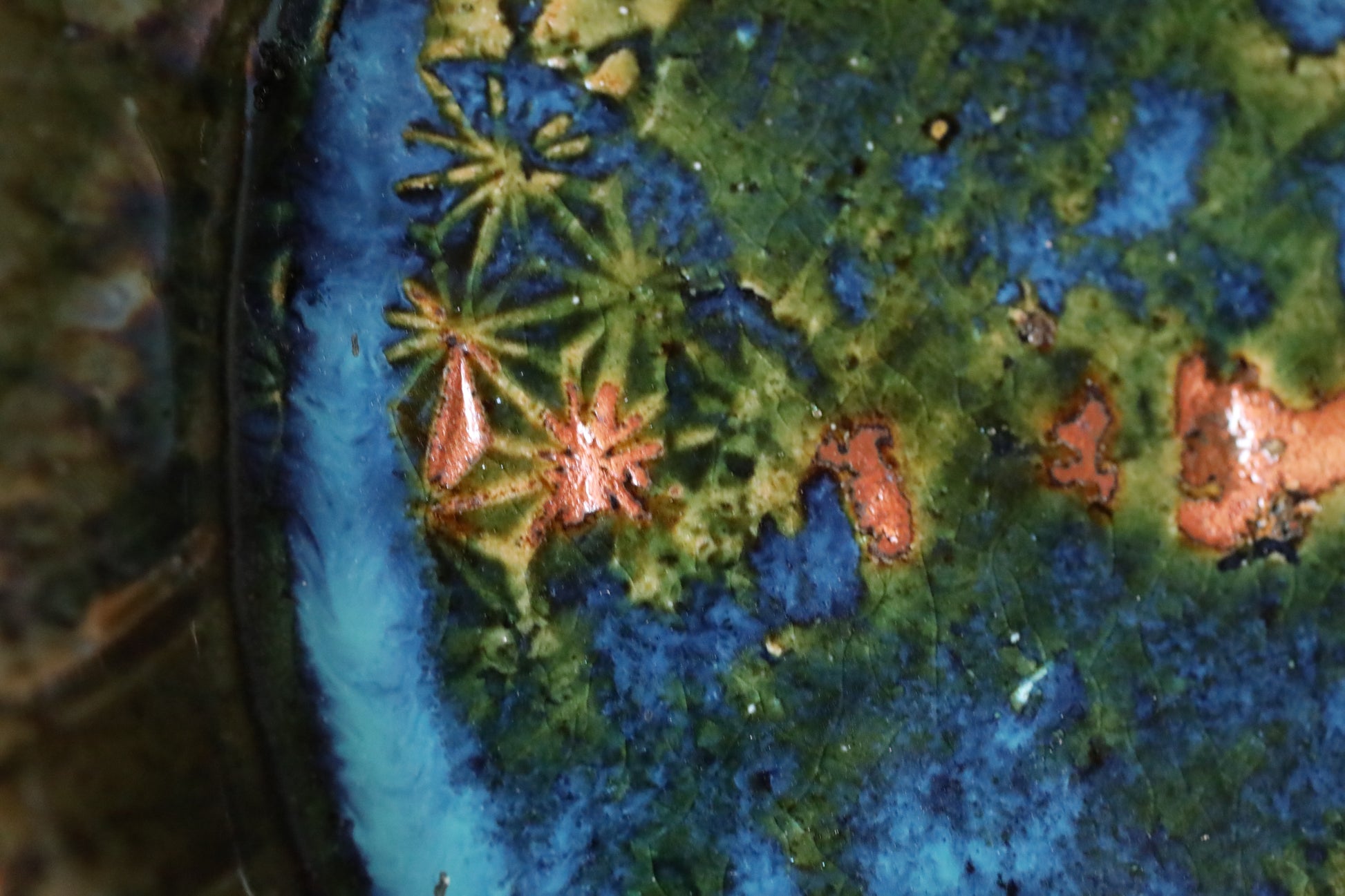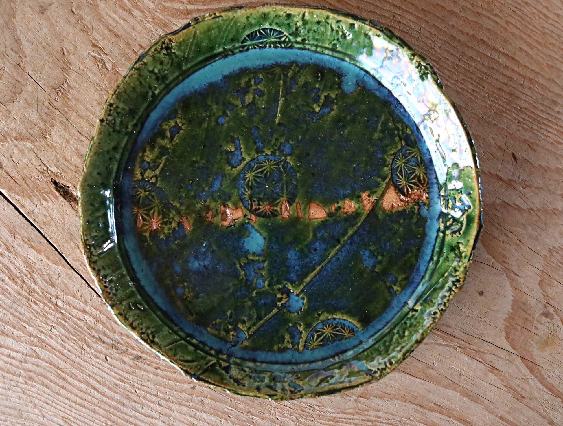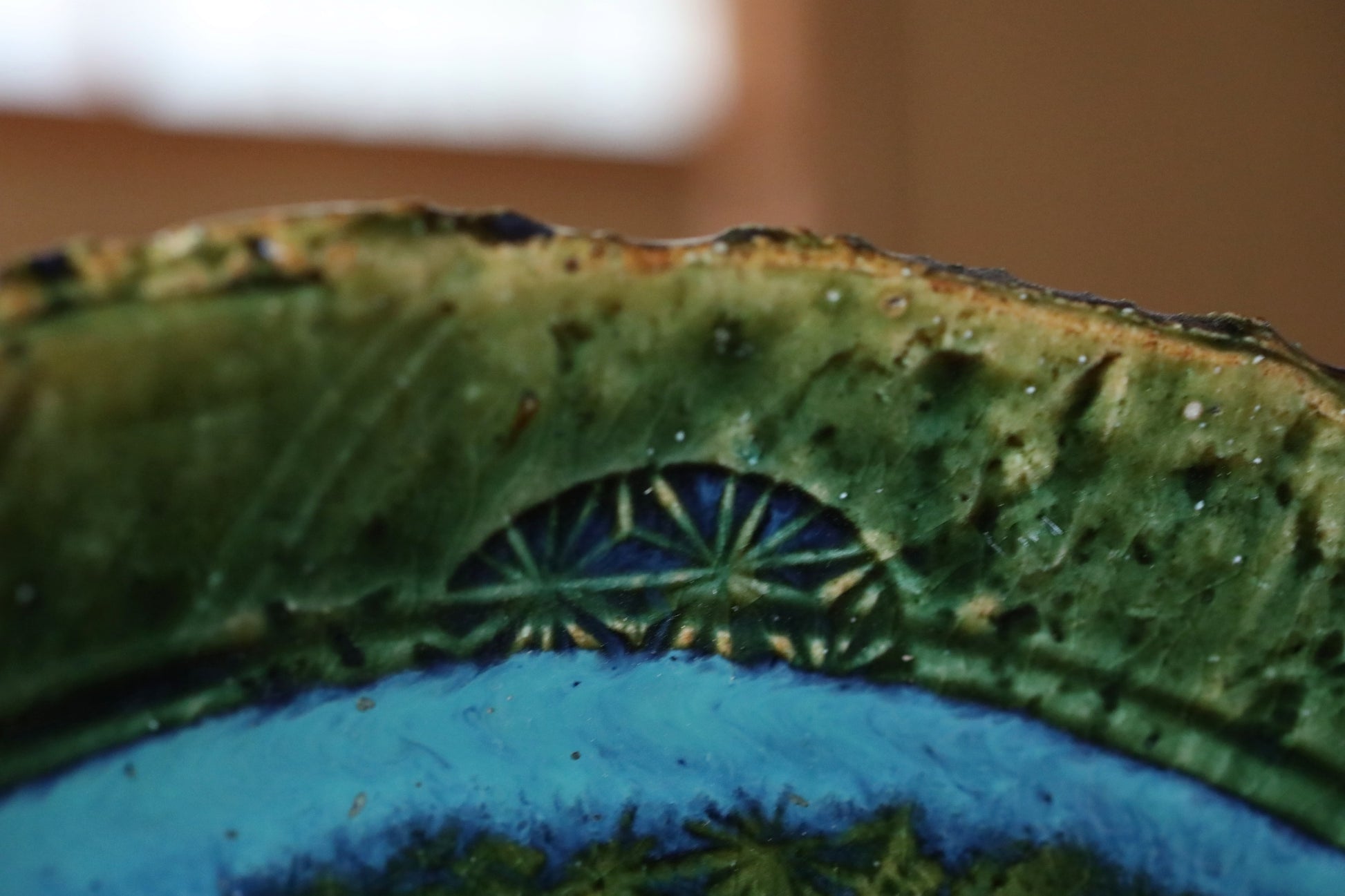 It makes pasta, salad, or sushi look delicious. It is playful, with some areas intentionally unglazed. The clay on the back side will change color as it is used over the years, which is also interesting.