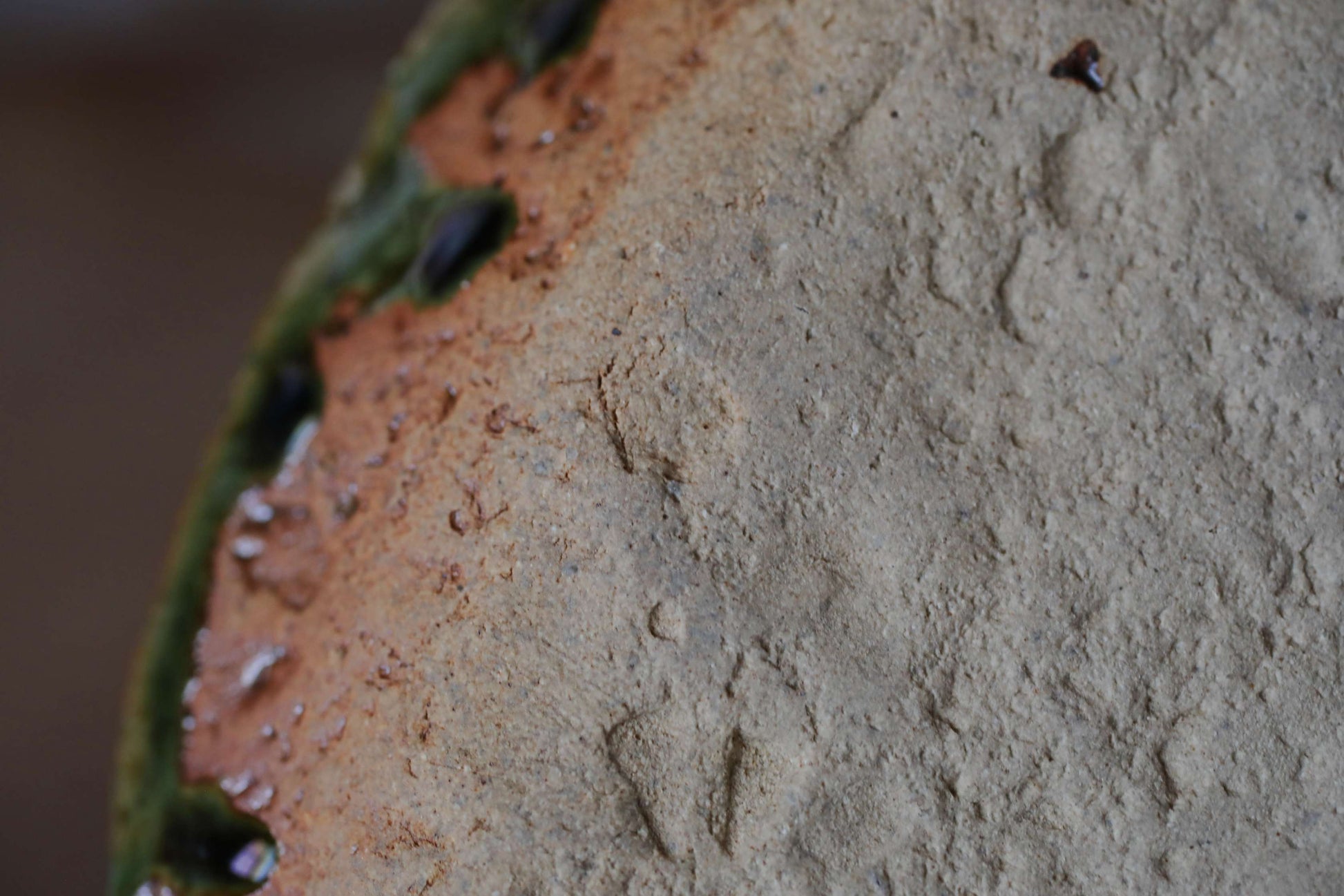 This was made in one of the 織部Oribe kilns that have been in existence since the Edo period, started by a potter called 加藤武右衛門 Takeemon Kato. This is not an old item; it was made in the Showa period.