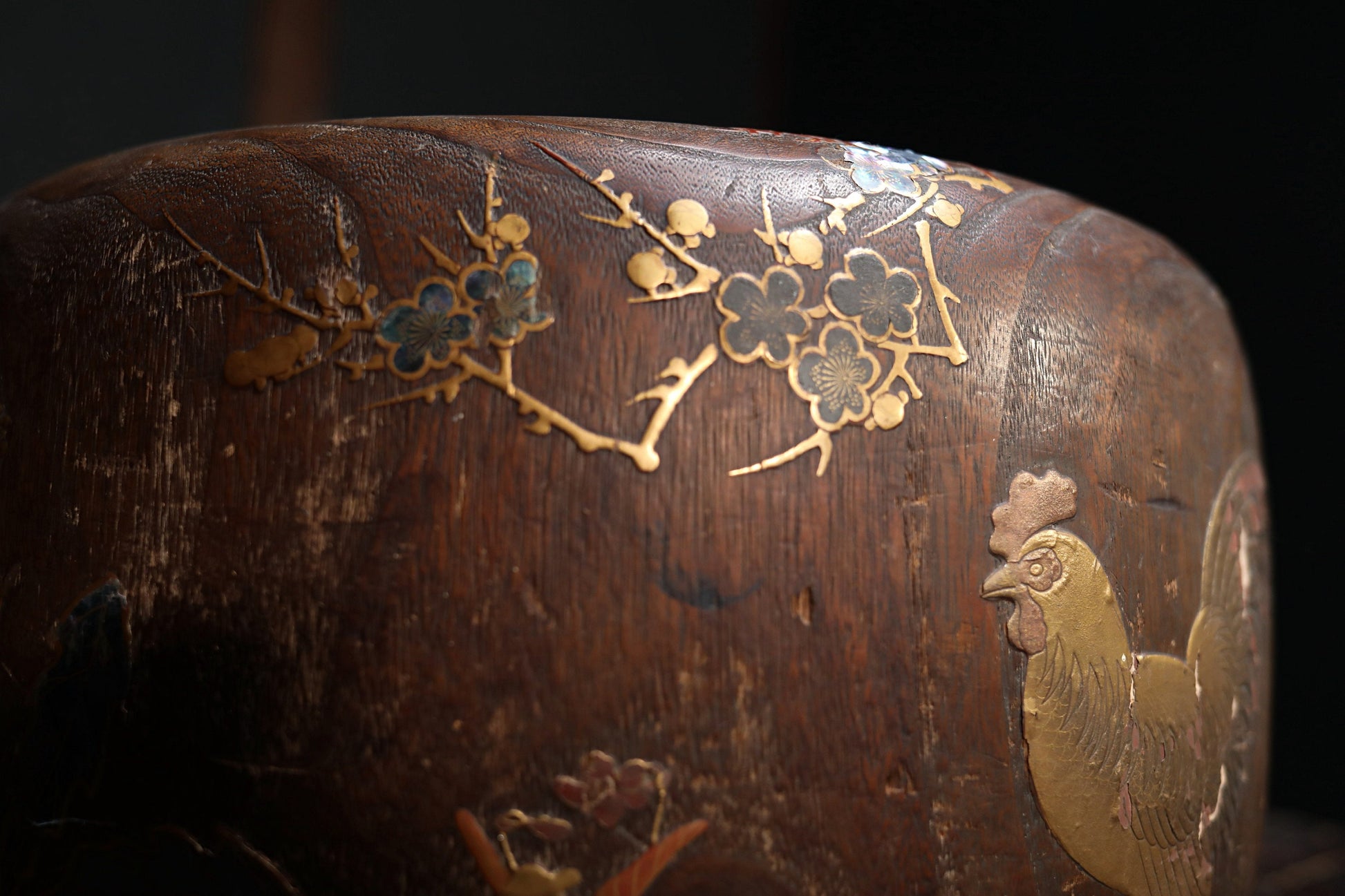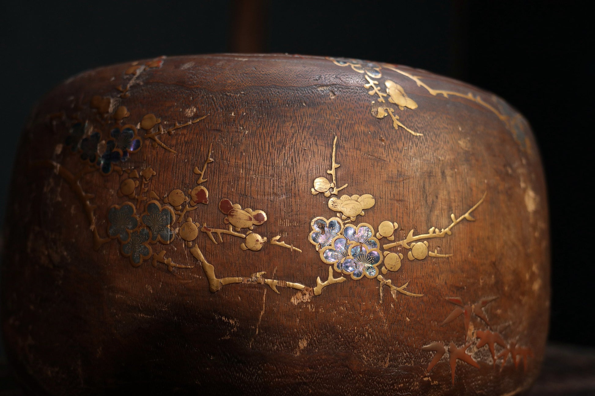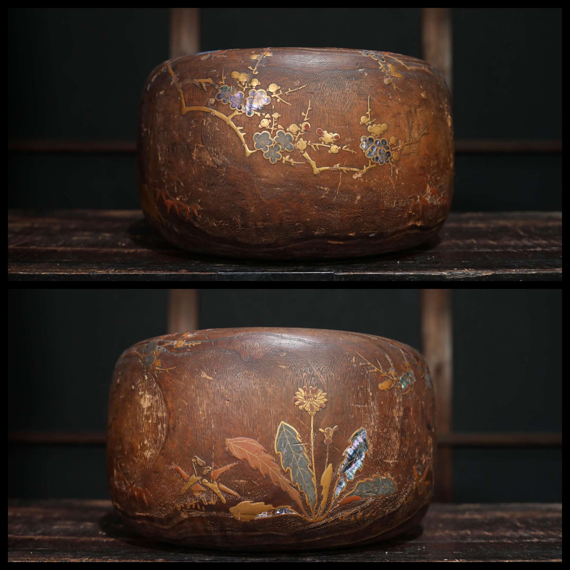 Made from a single large tree, they are large and beautiful. The inside is covered with copper. The outside is covered with a delicate lacquer and maki-e technique called maki-e. Some of the shells are inlaid with mother-of-pearl inlay and shine beautifully when the light hits them. There are numerous areas where the shells and lacquer have peeled off over time. However, there are no problems with use and it can be used immediately.