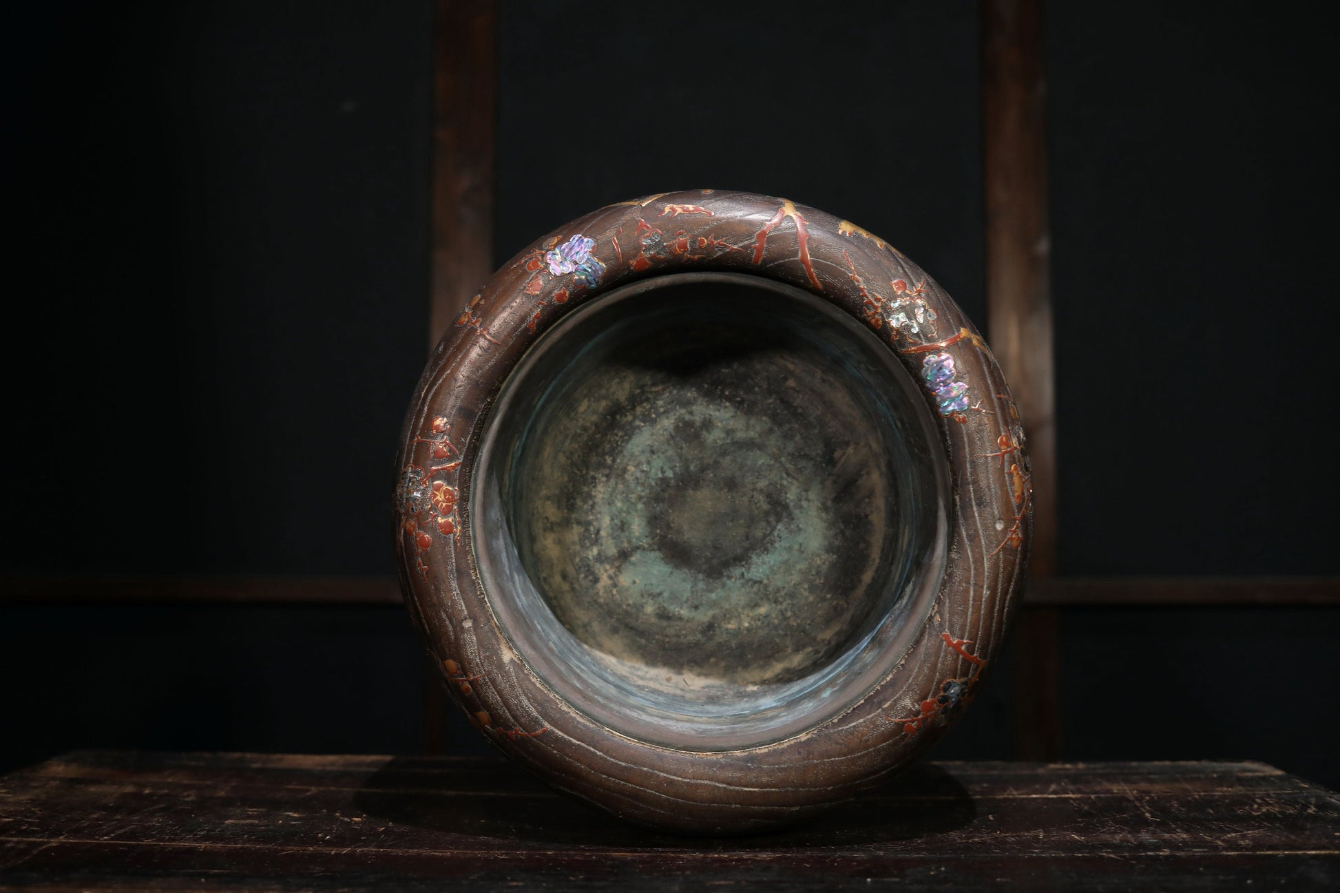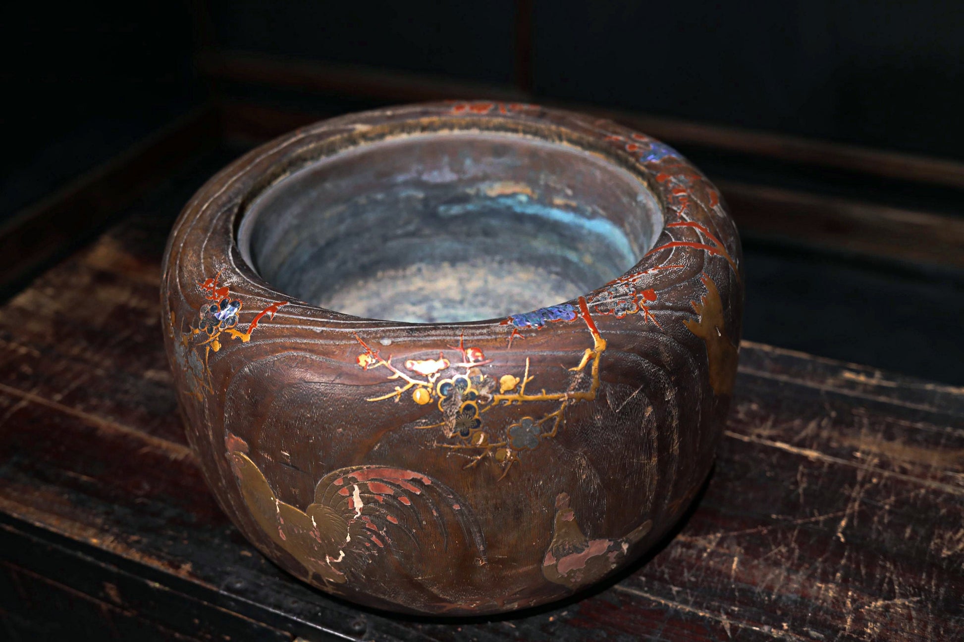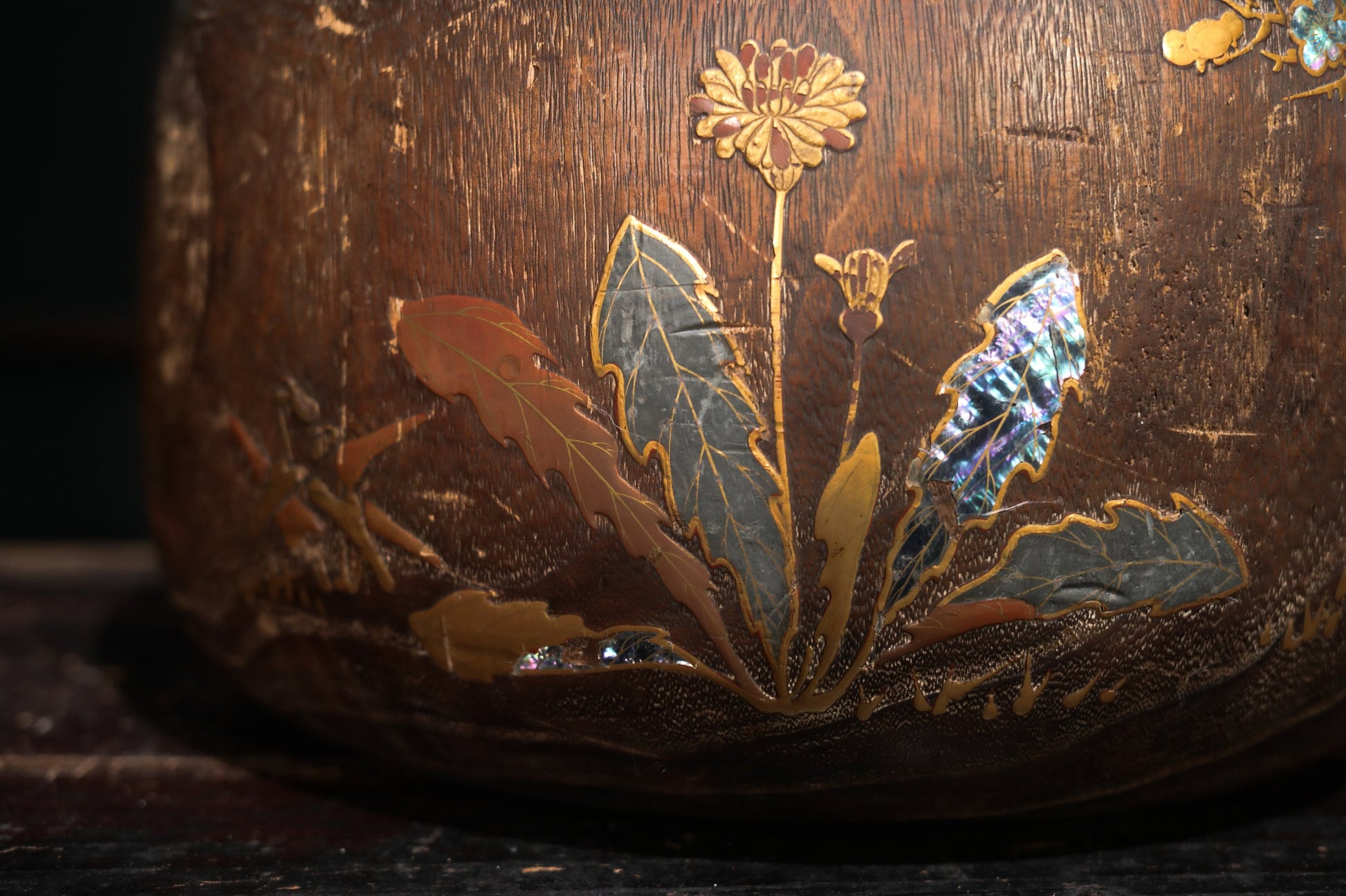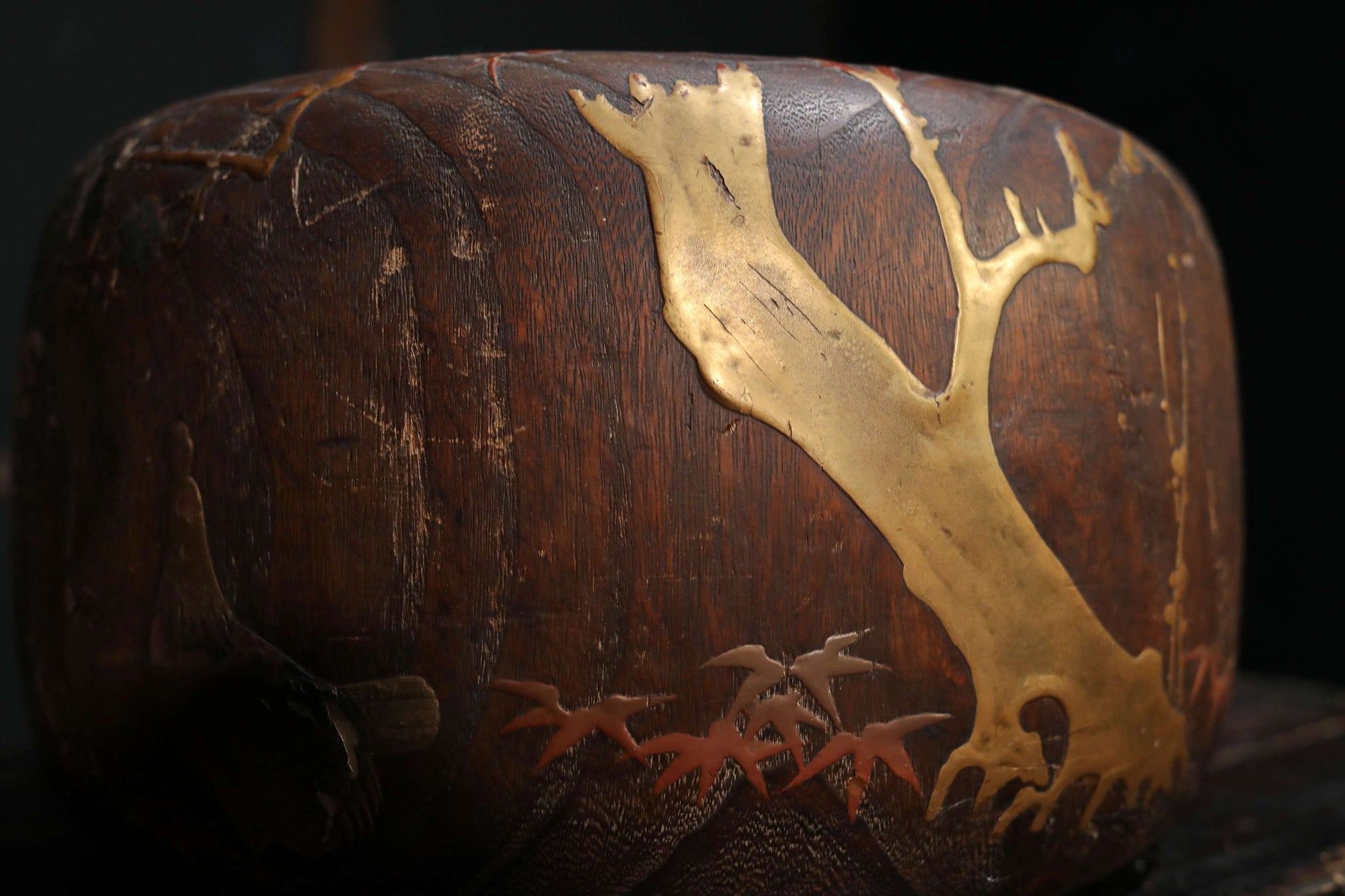 Made from a single large tree, they are large and beautiful. The inside is covered with copper. The outside is covered with a delicate lacquer and maki-e technique called maki-e. Some of the shells are inlaid with mother-of-pearl inlay and shine beautifully when the light hits them. There are numerous areas where the shells and lacquer have peeled off over time. However, there are no problems with use and it can be used immediately.