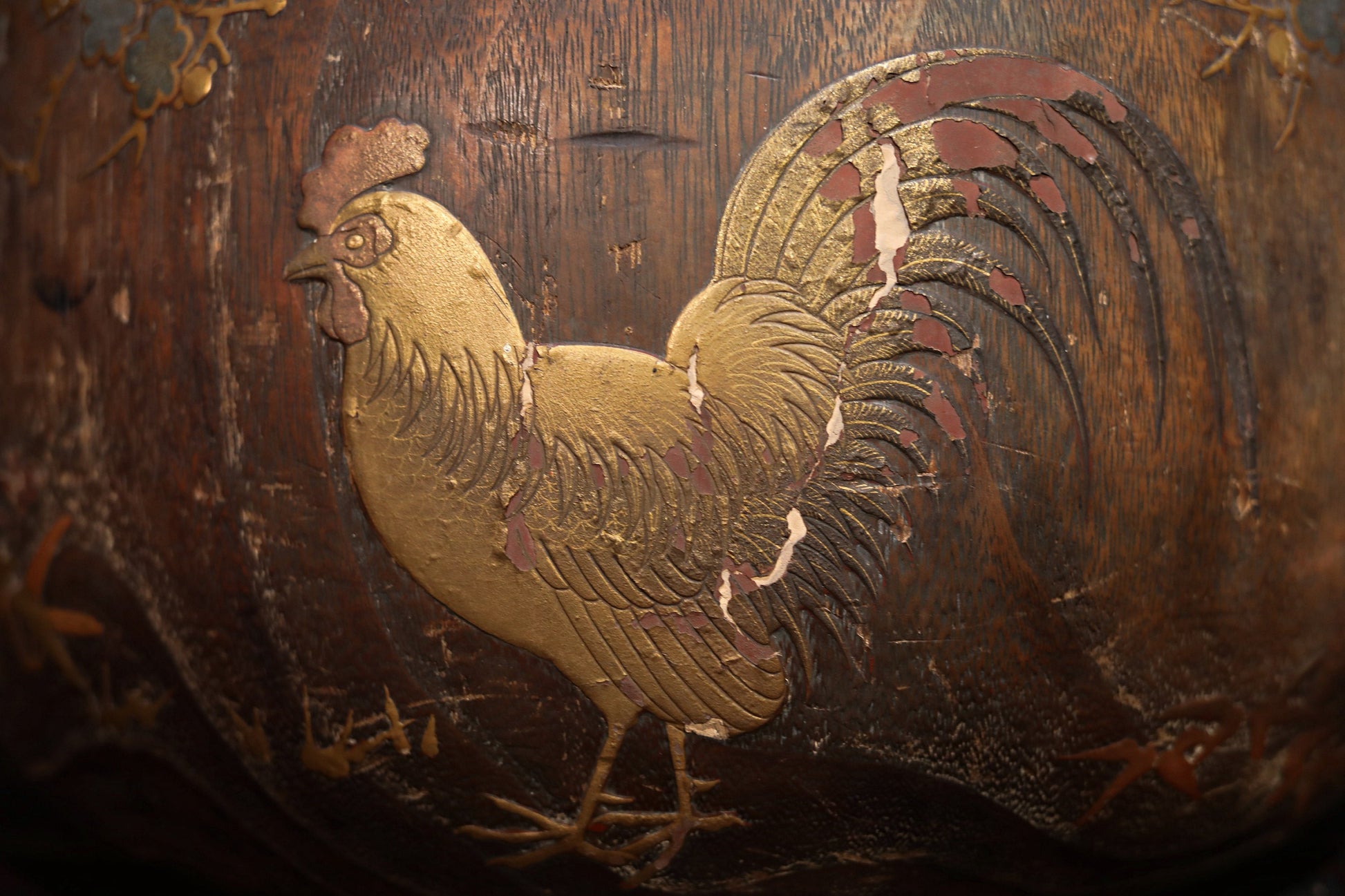 Japanese furniture 1880s Antique wood Hibachi brazier charcoal Fire Holder with Makie of quail birds and plum blossom design 15.4in/39cm.